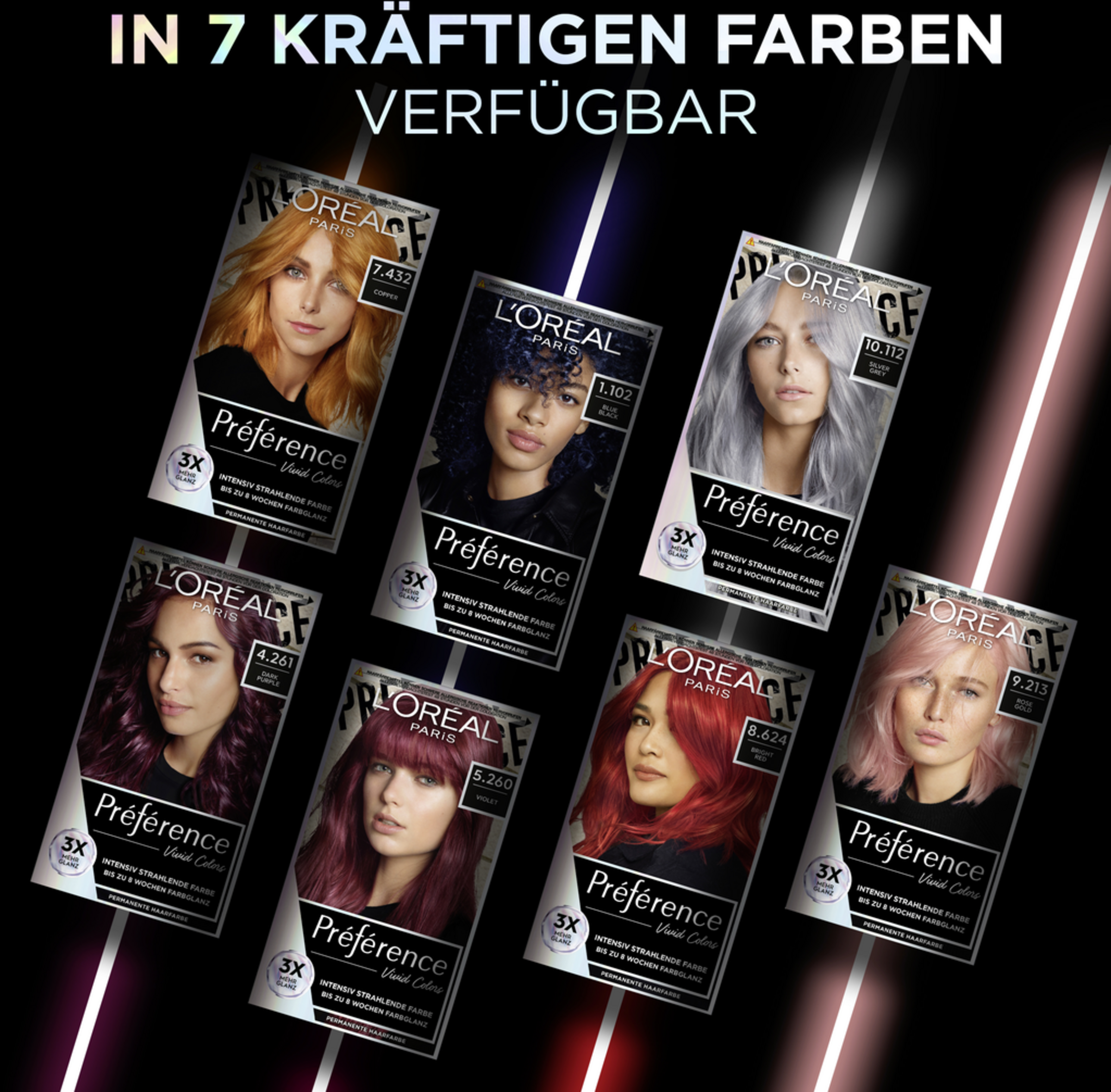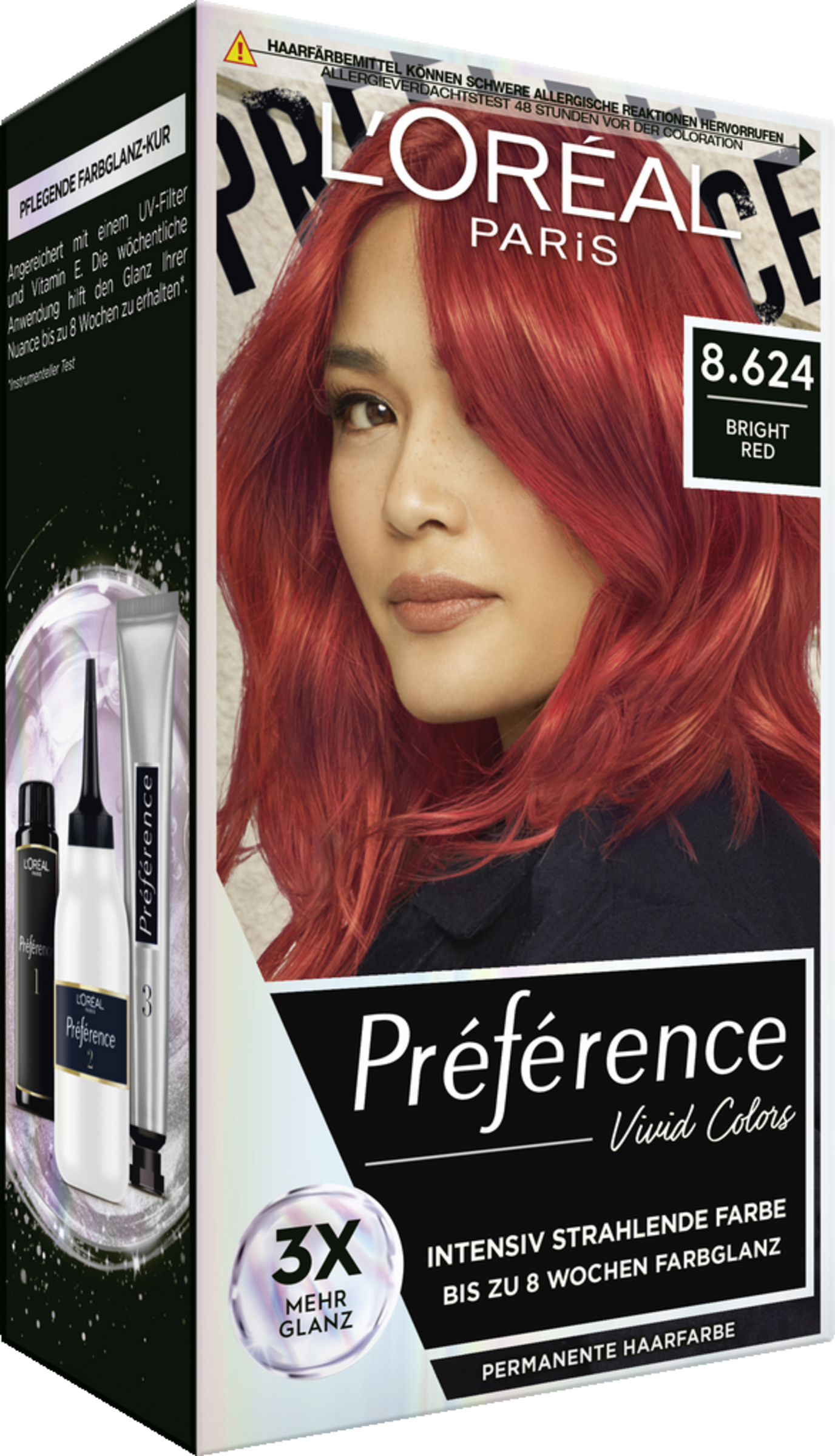 Entdecken Sie die innovative Préférence Expertise von L'Oréal Paris bei den Vivid Colors: Die von Haarfärbeexperten entwickelte Formel enthält eine Mischung aus leistungsstarken Farbstoffen, um hochintensive, schimmernde Farben zu erzielen. Die Gel-Textur ist für alle Haartypen geeignet und ermöglicht eine einfache Anwendung mit dem 150 ml Mix-Kit. Der Farbglanz-Pflegebalsam mit UV-Filter erhält den Glanz Ihrer Nuance bis zu 8 Wochen bei wöchentlicher Anwendung. Inspiriert wurde die Nuance Bright Red von der berühmten Moulin Rouge in Paris und sie kreiert einen individuellen Look.