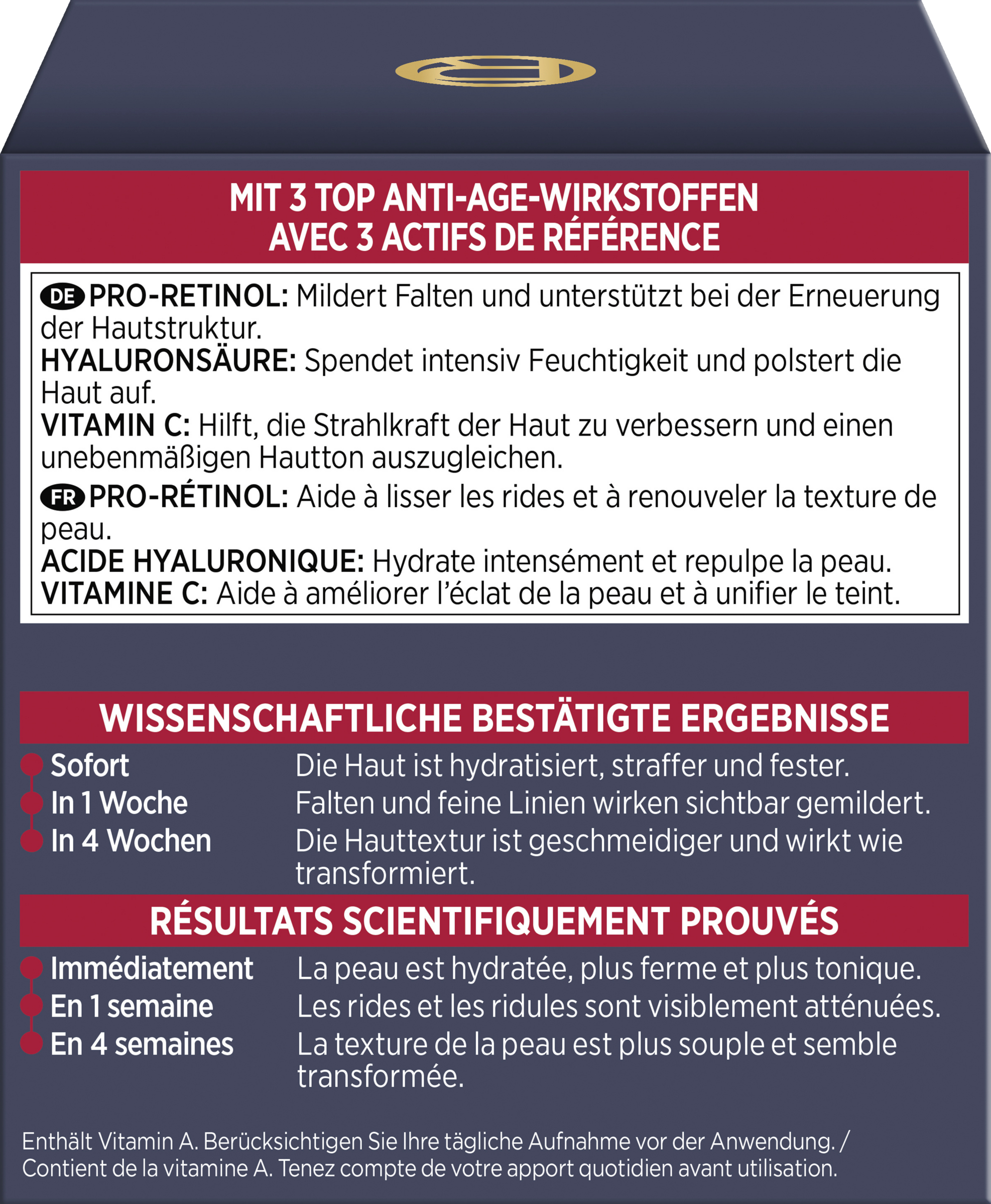 Dafür enthält die Anti-Falten-Creme eine Dreifach-Power Formel mit Pro-Retinol, Hyaluronsäure und Vitamin C. Pro-Retinol mildert dabei Falten und unterstützt eine Erneuerung der Hautstruktur, während Hyaluronsäure intensiv Feuchtigkeit spendet und die Haut aufpolstert. Vitamin C hilft dabei, die Strahlkraft der Haut zu verbessern und einen unebenmäßigen Hautton auszugleichen.