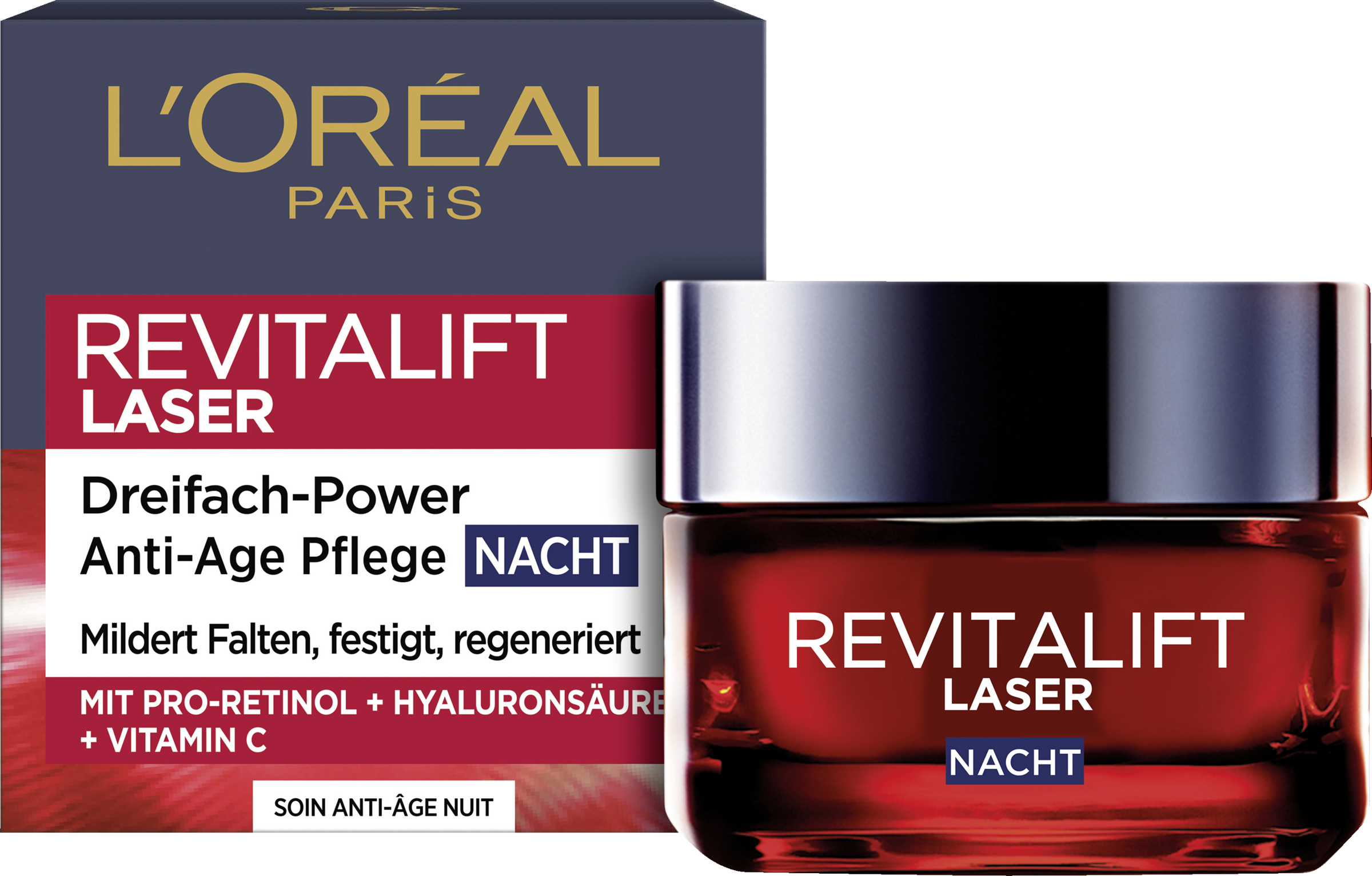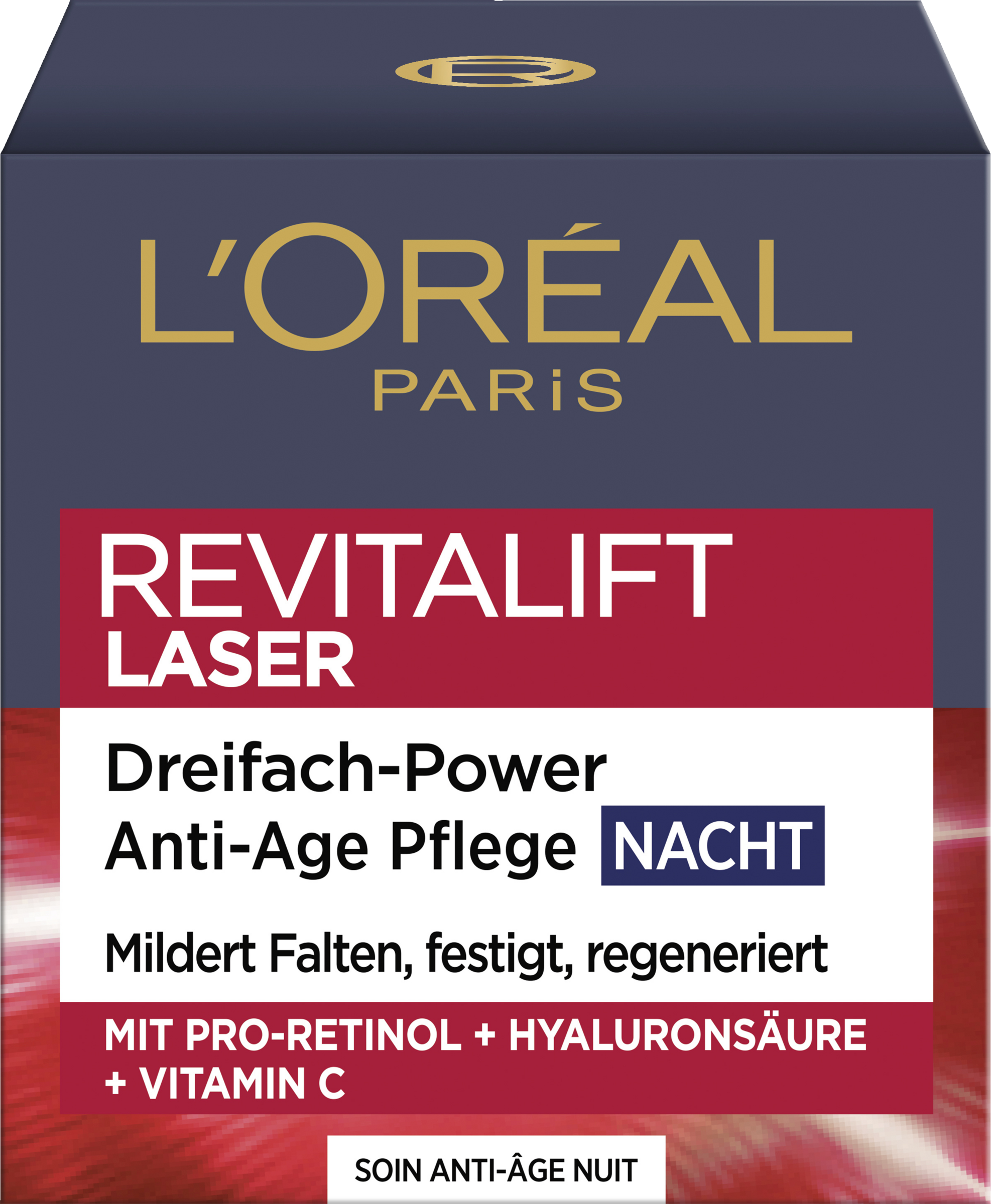 Sorgen Sie mit der Revitalift Laser X3 Dreifach-Power Anti-Age Nachtcreme mit Pro-Retinol + Hyaluronsäure + Vitamin C von L’Oréal Paris für einen jugendlichen und strahlenden Teint. Die hautstraffende Gesichtscreme spendet der Haut intensiv Feuchtigkeit, wirkt regenerierend und mildert Falten. So sorgt die Anti-Aging Nachtcreme mit jeder Anwendung für ein gefestigtes und regeneriertes Hautbild.