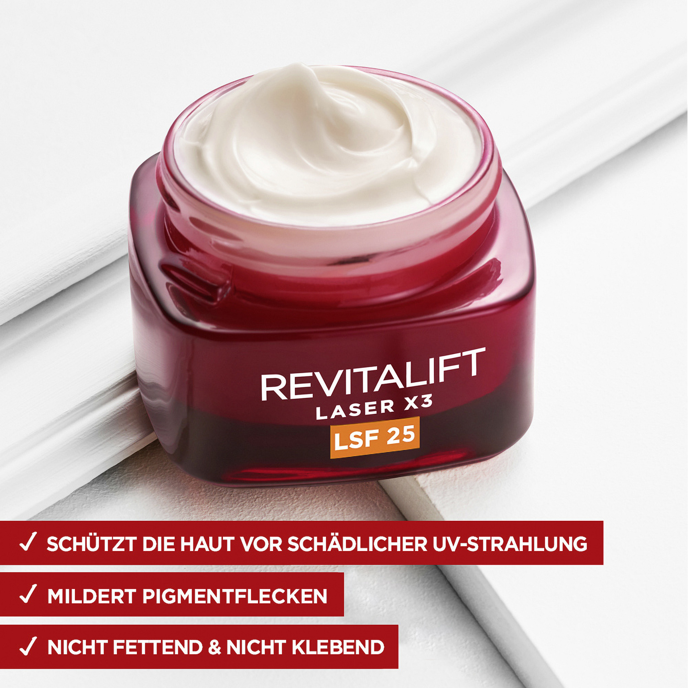 Die Revitalift Tagespflege mit LSF zeichnet sich durch eine pflegende und leichte Formel ein, welche schnell einzieht und ein zartes, aber straffes Gefühl auf der Haut hinterlässt – ohne zu fetten oder Rückstände zu hinterlassen.