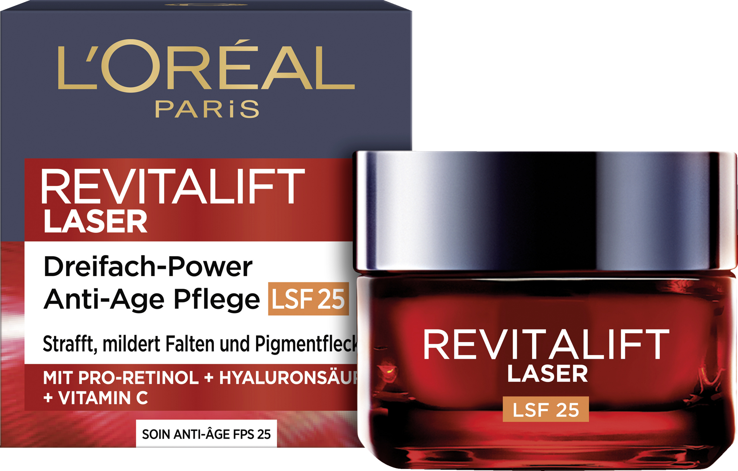 Verhelfen Sie Ihrer Haut zu neuer Strahlkraft mit der Revitalift Laser X3 Dreifach-Power Anti-Age Tagespflege LSF25 mit Pro-Retinol + Hyaluronsäure + Vitamin C. Die Tagescreme mit LSF spendet der Haut intensiv Feuchtigkeit und sorgt so für ein glatteres Hautbild. Gleichzeitig wirkt die Anti-Aging-Creme Falten und Pigmentflecken entgegen und schützt dank integriertem Lichtschutzfaktor vor sonnenbedingten Anzeichen der Hautalterung.