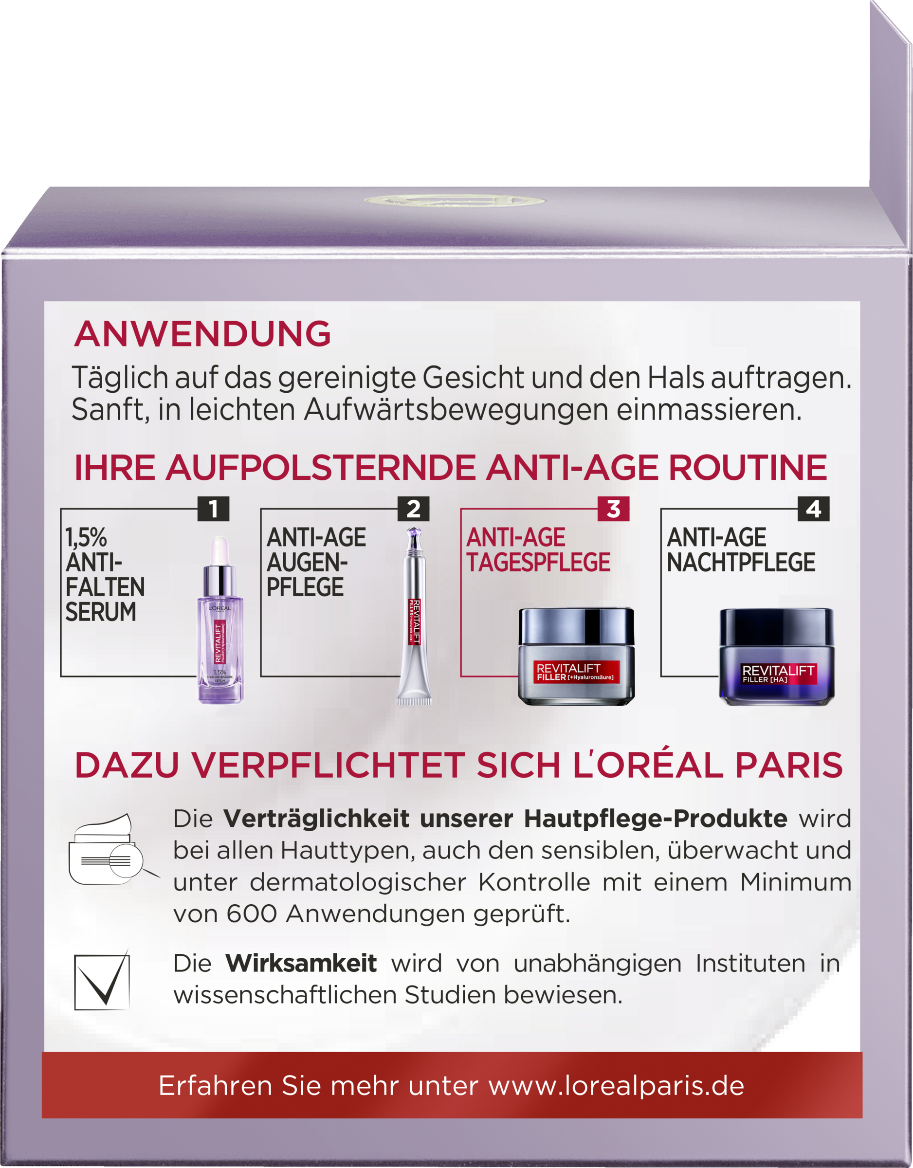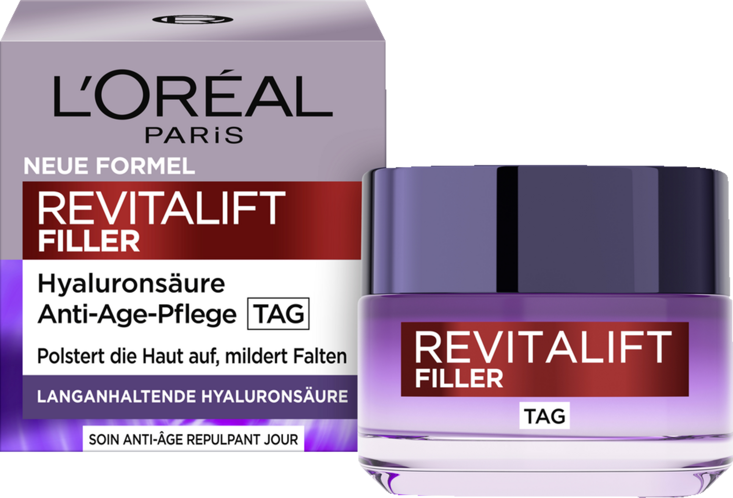 Die Revitalift Filler [+Hyaluronsäure] Anti-Age Tagespflege mit drei Arten purer Hyaluronsäure, mildert Falten und sorgt für einen optimalen Aufpolsterungs-Effekt der Haut.