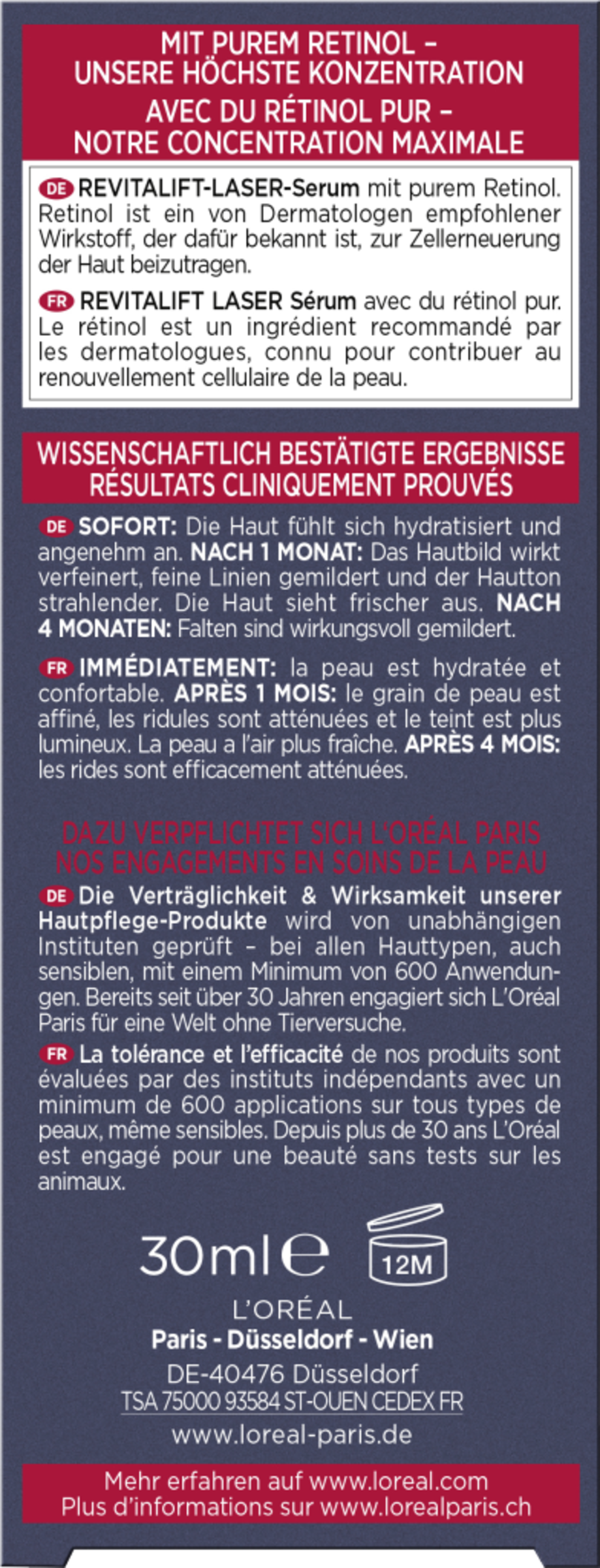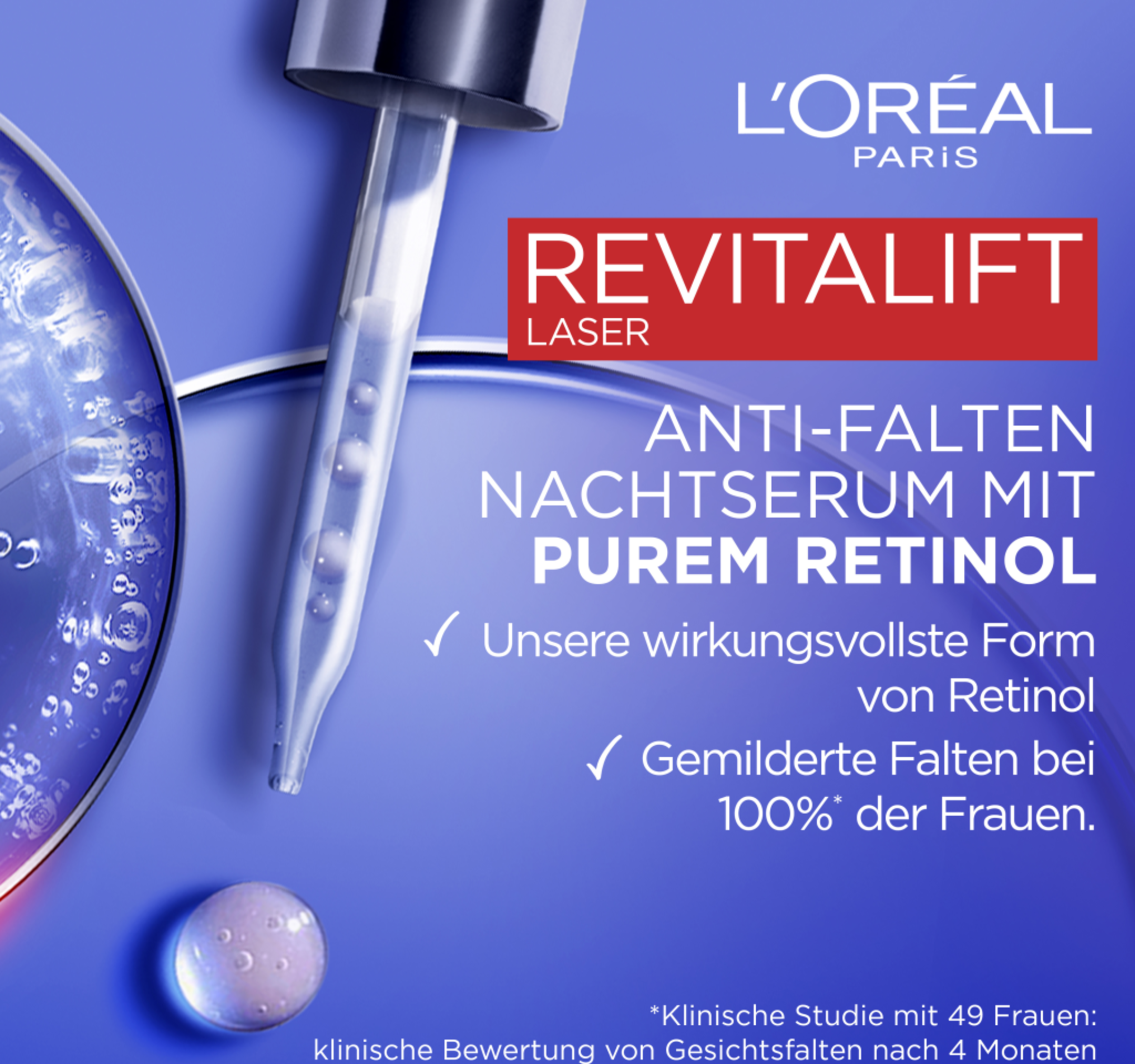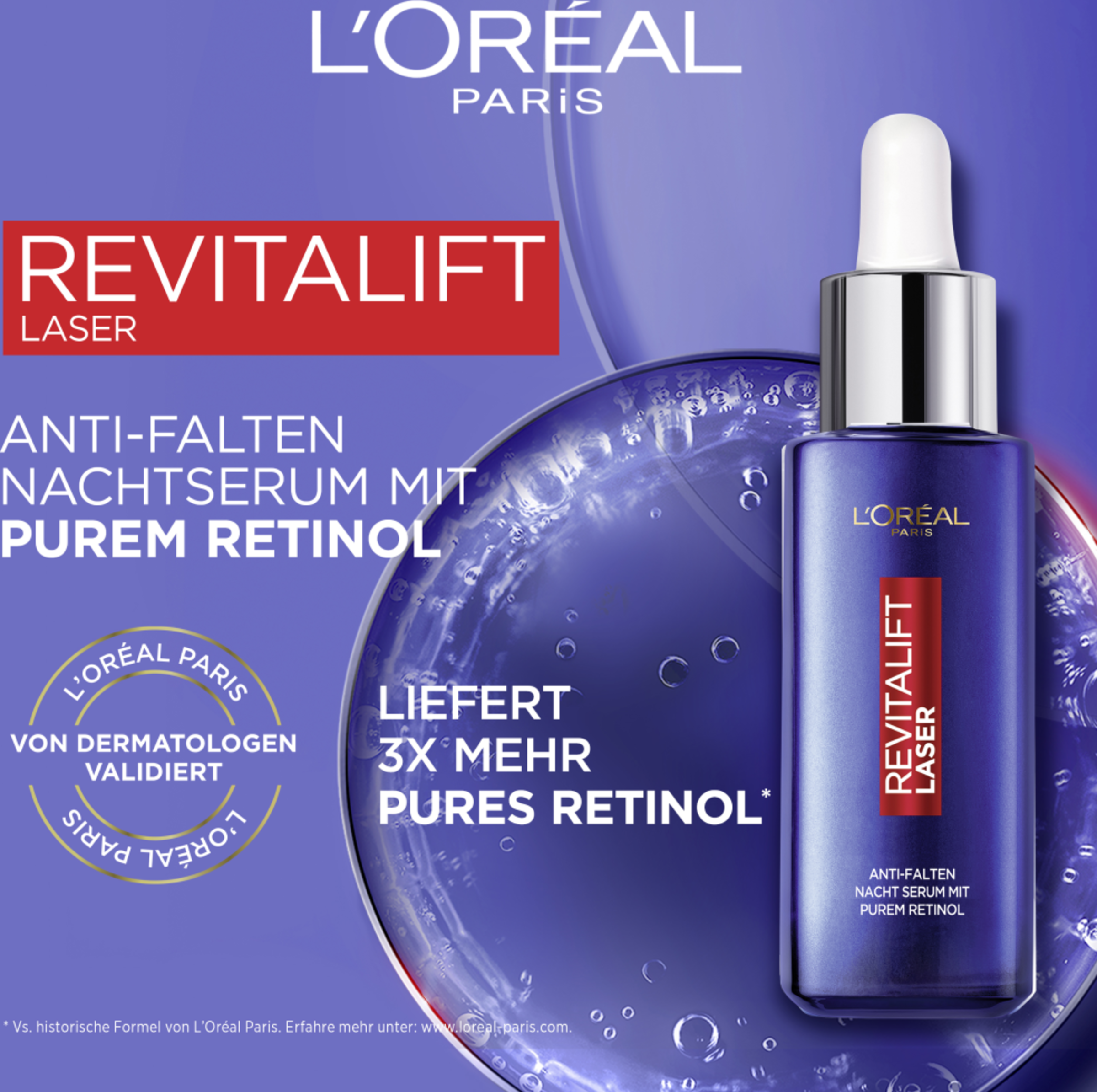 L'Oréal Paris Revitalift Laser Anti-Falten Nacht Serum mit Purem Retinol ist eine wirkungsvolle Lösung um alle Zeichen der Hautalterung zu bekämpfen und Falten zu mildern. Bereits nach der ersten Anwendung ist die Haut hydratisiert. Nach 4 Wochen sind Falten und feine Linien gemildert und die Haut wirkt jugendlicher.