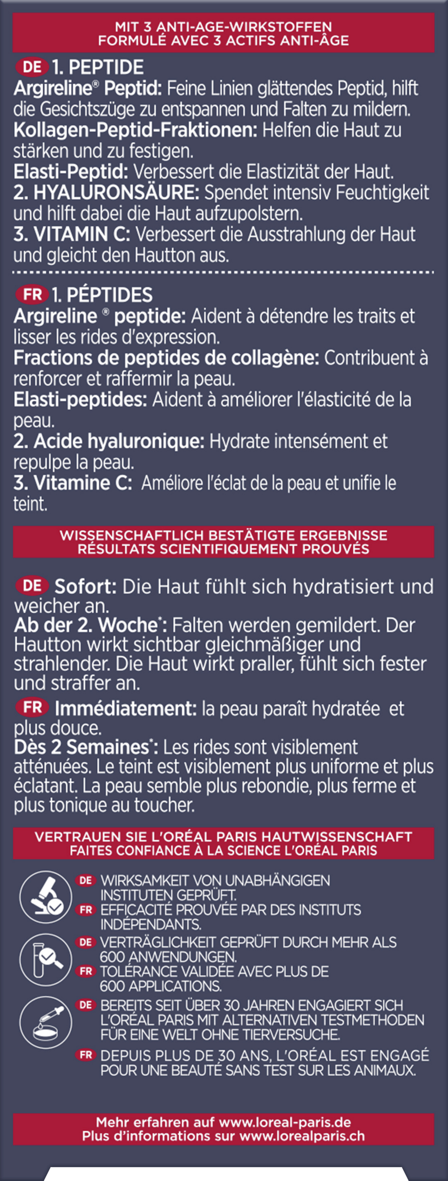 - Dank des modernen Wirkstoffkomplexes mit drei wichtigen Peptiden werden Falten gemildert und Mimikfalten geglättet