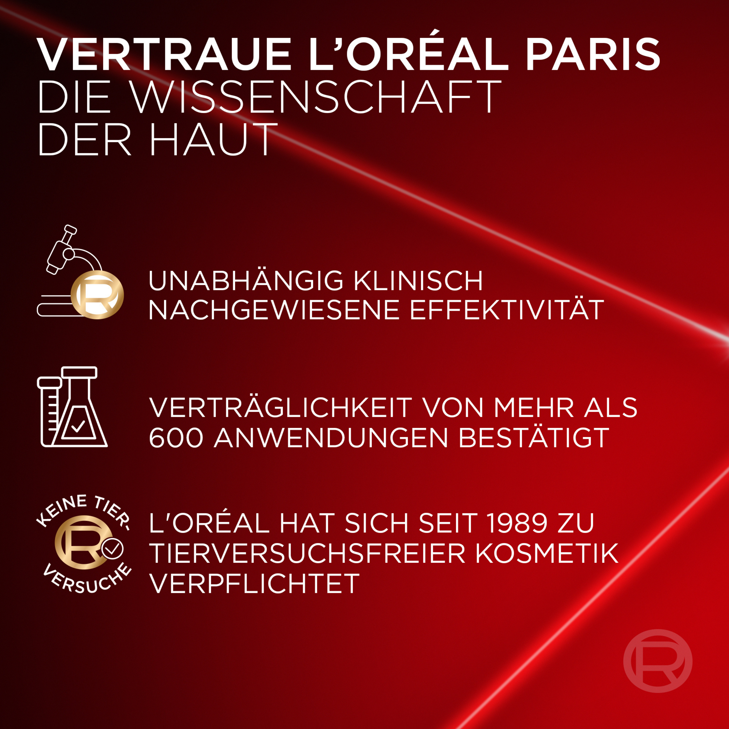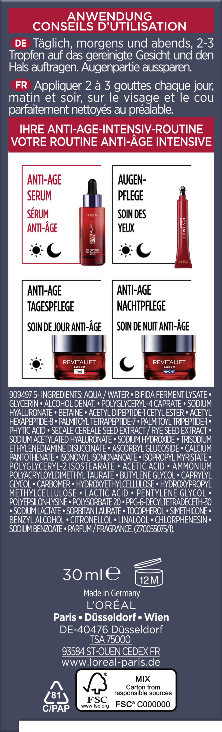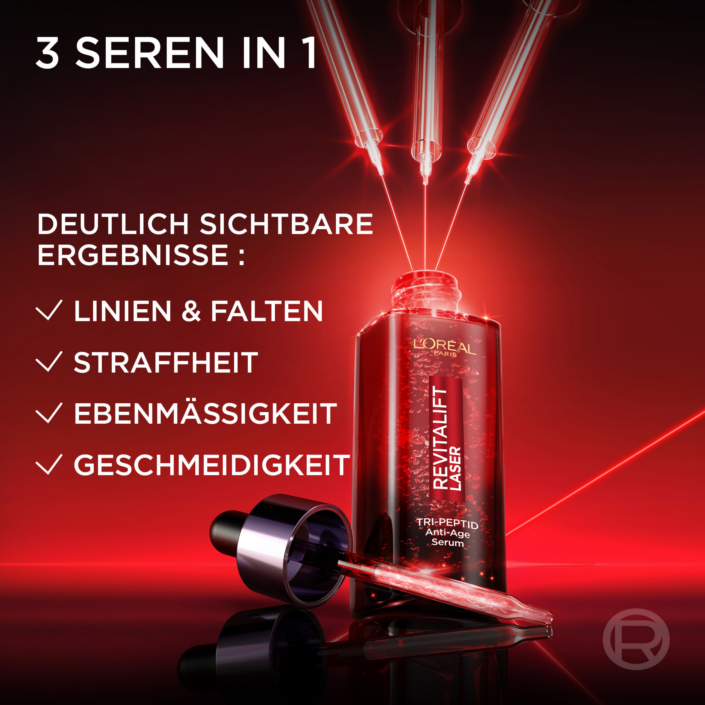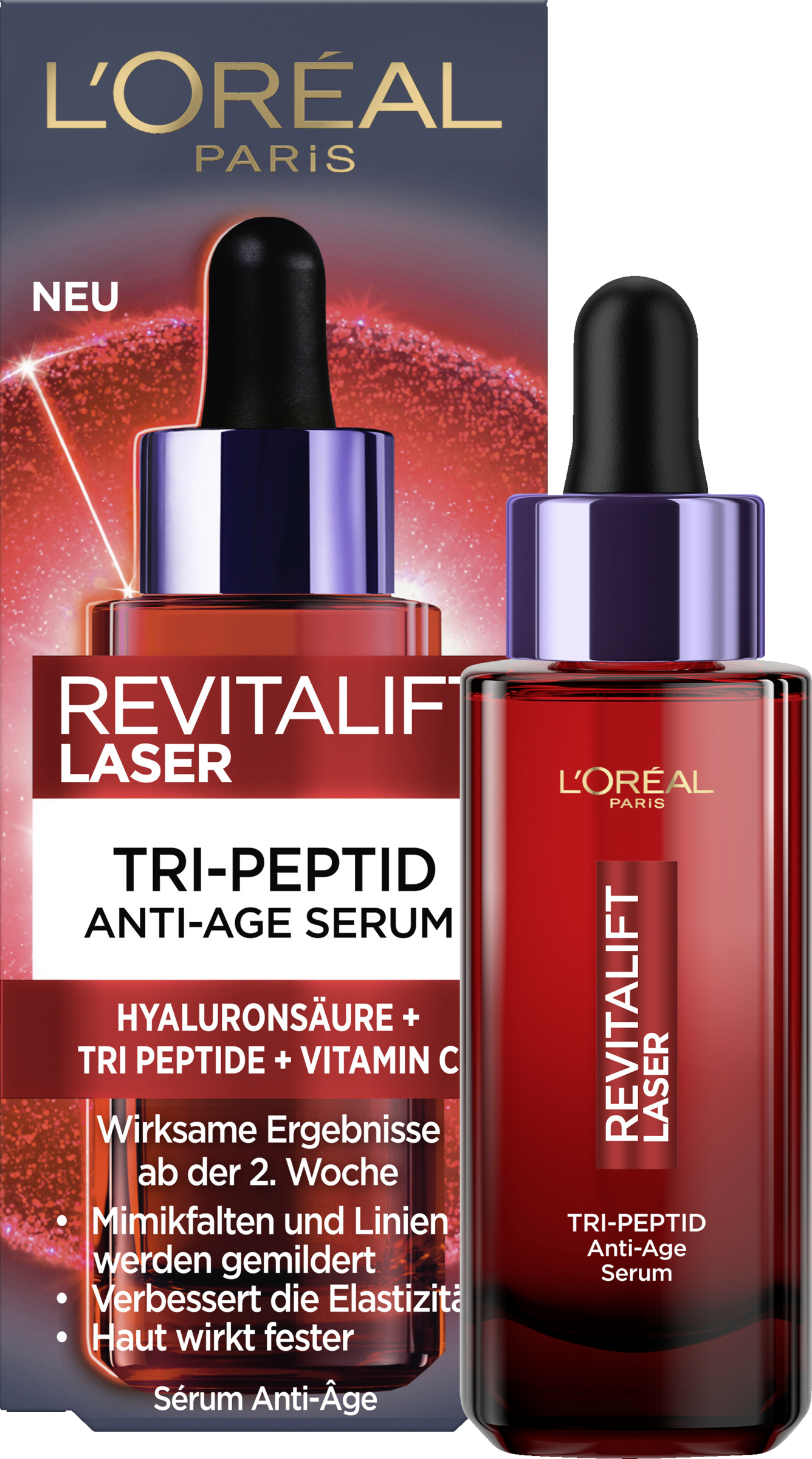 Das Revitalift Laser Tri-Peptid Anti-Age Serum von L’Oréal Paris vereint die Kraft von drei starken Anti-Age Seren in einem. Der hochkonzentrierte Wirkstoffkomplex mit Tri-Peptiden, Hyaluronsäure und Vitamin C dringt tief in die Hautschichten ein, polstert die Haut von innen auf und glättet so Mimikfältchen – mit sofort sichtbaren Ergebnissen nach 2 Wochen. Die Elastizität und Strahlkraft der Haut wird deutlich verbessert und sorgt für einen ebenmäßigeren und frischeren Teint. Die feuchtigkeitsspendende Textur des Anti-Aging Serums zieht schnell ein und hinterlässt ein wohltuendes Gefühl auf der Haut ohne zu fetten oder zu kleben.