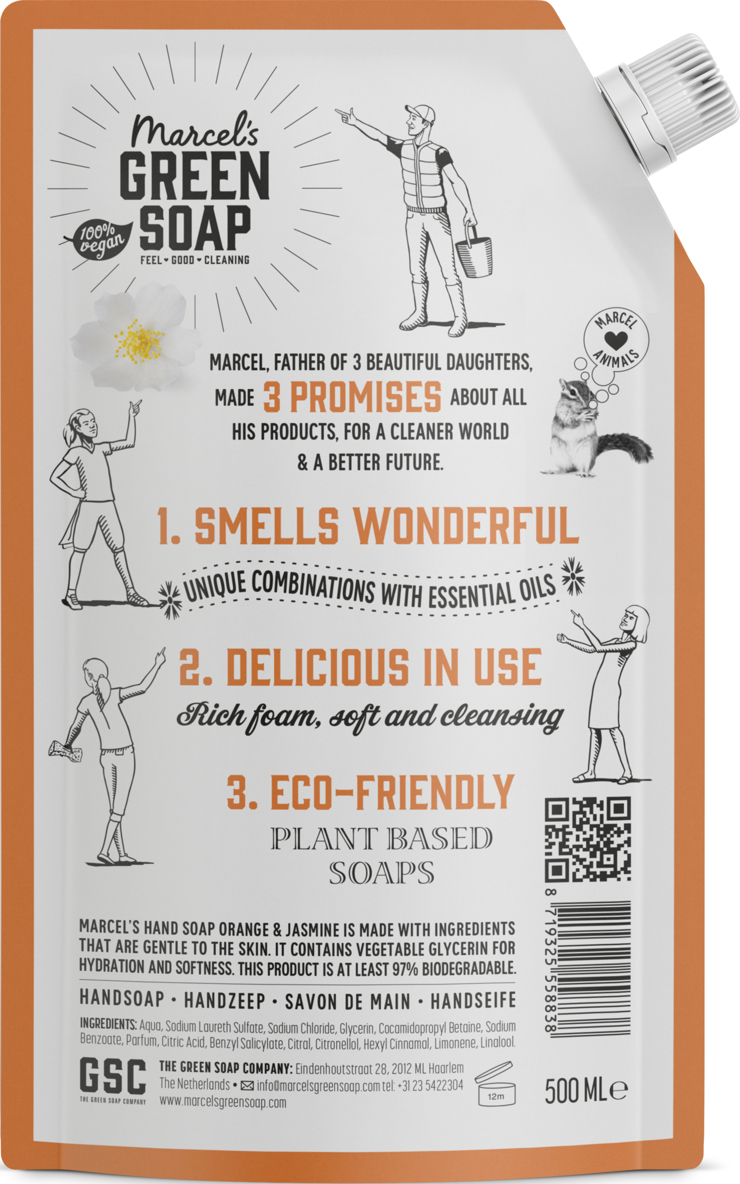 Marcel’s Handseife wird mit hautfreundlichen Inhaltsstoffen hergestellt. Es enthält pflanzliches Glycerin für Feuchtigkeit und Geschmeidigkeit. Dieses Produkt ist zu mindestens 97 % biologisch abbaubar, 100 % vegan.