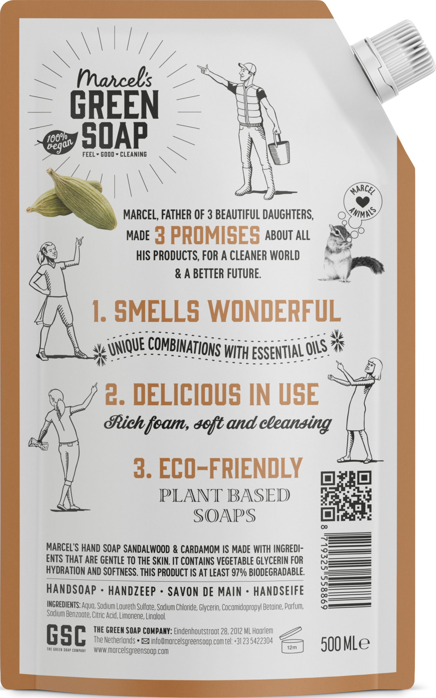 Marcel’s Handseife wird mit hautfreundlichen Inhaltsstoffen hergestellt. Es enthält pflanzliches Glycerin für Feuchtigkeit und Geschmeidigkeit. Dieses Produkt ist zu mindestens 97 % biologisch abbaubar, 100 % vegan.