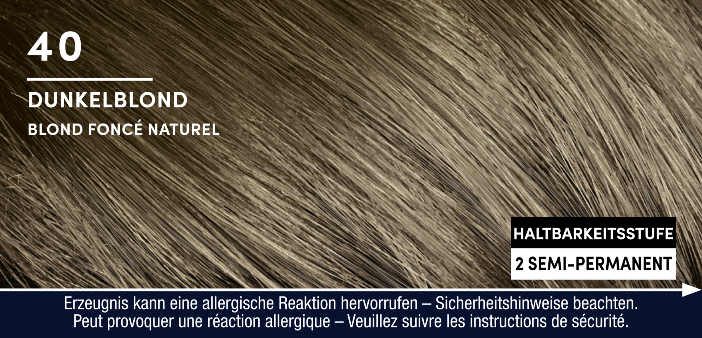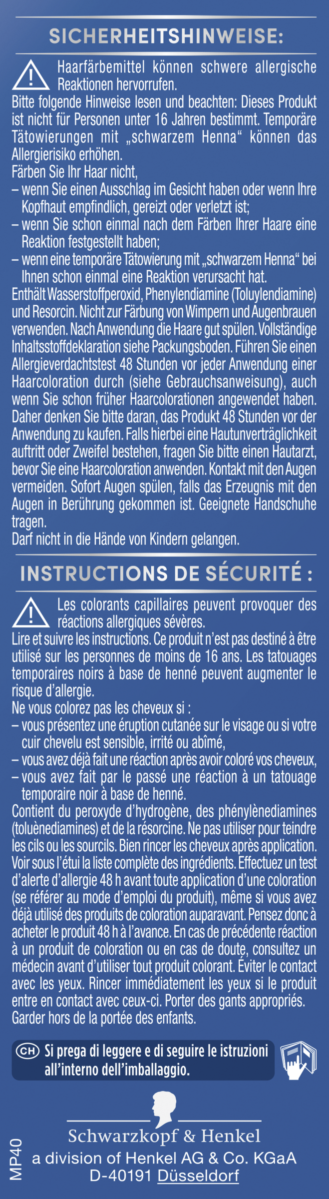 Haarfärbemittel können schwere allergische Reaktionen hervorrufen. Bitte folgende Hinweise lesen und beachten: Dieses Produkt ist nicht für Personen unter 16 Jahren bestimmt. Temporäre Tätowierungen mit "schwarzem Henna" können das Allergierisiko erhöhen. Färben Sie Ihr Haar nicht, – wenn Sieeinen Ausschlag im Gesicht haben oder wenn Ihre Kopfhaut empfindlich, gereizt oder verletzt ist, – wenn Sie schon einmal nach dem Färben Ihrer Haare eine Reaktion festgestellt haben, – wenn eine temporäre Tätowierung mit "schwarzem Henna" bei Ihnen schon einmal eine Reaktion verursacht hat. Enthält Wasserstoffperoxid, Phenylendiamine (Toluylendiamine) und Resorcin. Nicht zur Färbung von Wimpern und Augenbrauen verwenden. Nach Anwendung die Haare gut spülen. Vollständige Inhaltsstoffdeklaration siehe Packungsboden. Führen Sie einen Allergieverdachtstest 48 Stunden vor jeder Anwendung einer Haarcoloration durch (siehe Gebrauchsanweisung), auch wenn Sie schon früher Haarcolorationen angewendet haben. Daher denken Sie bitte daran, das Produkt 48 Stunden vor der Anwendung zu kaufen. Falls hierbei eine Hautunverträglichkeit auftritt oder Zweifel bestehen, fragen Sie bitte einen Hautarzt, bevor Sie eine Haarcoloration verwenden. Kontakt mit den Augen vermeiden. Sofort Augen spülen, falls das Erzeugnis mit den Augen in Berührung gekommen ist. Geeignete Handschuhe tragen. Darf nicht in die Hände von Kindern gelangen.