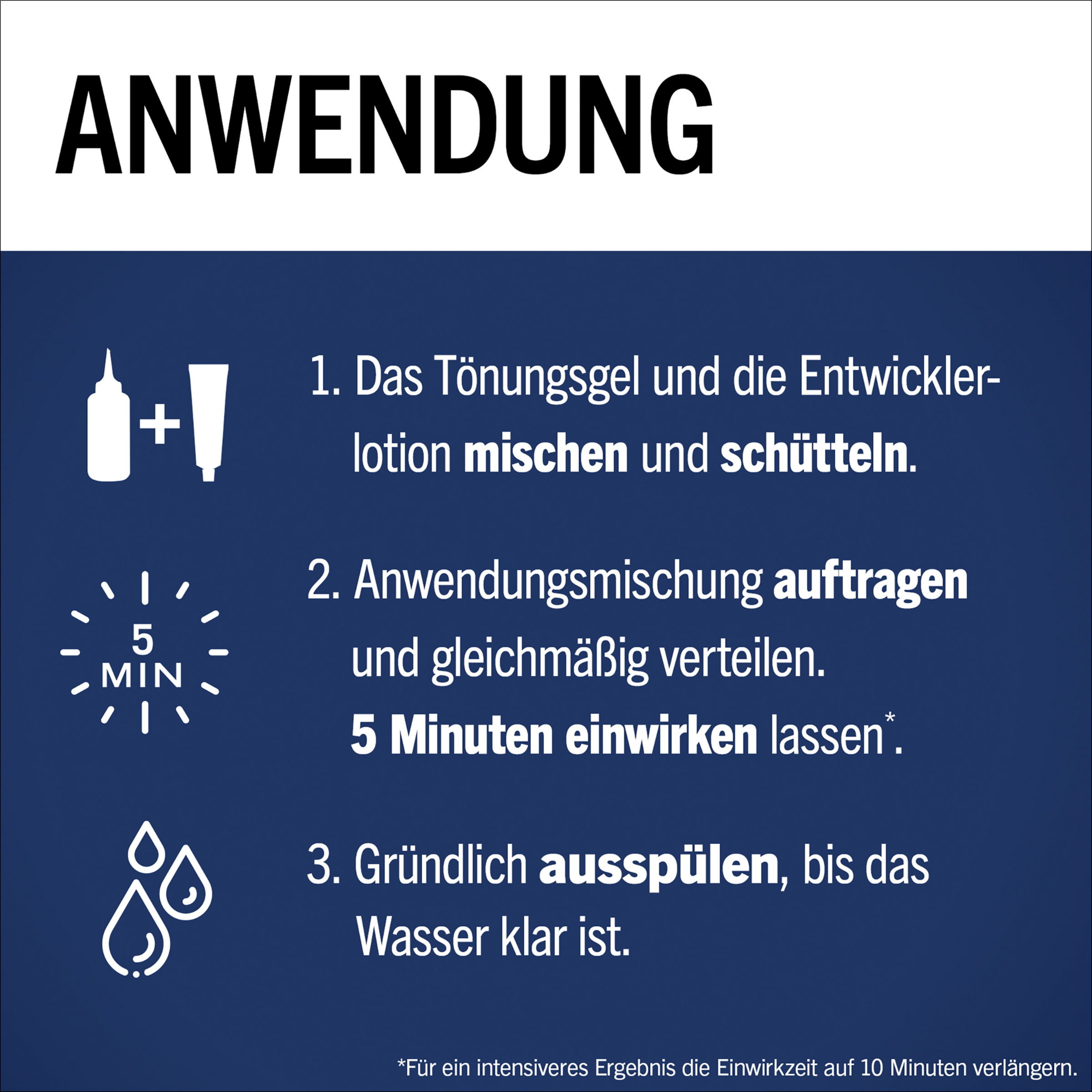 Schnelle & leichte Anwendung: Mischen Sie die Entwicklerlotion mit dem Tönungs-Gel. Tragen Sie die Colorationsmischung mit Hilfe des Speed-Applikators auf. Lassen Sie die Mischung 5 Minuten einwirken. Spülen Sie Ihre Haare gründlich aus.