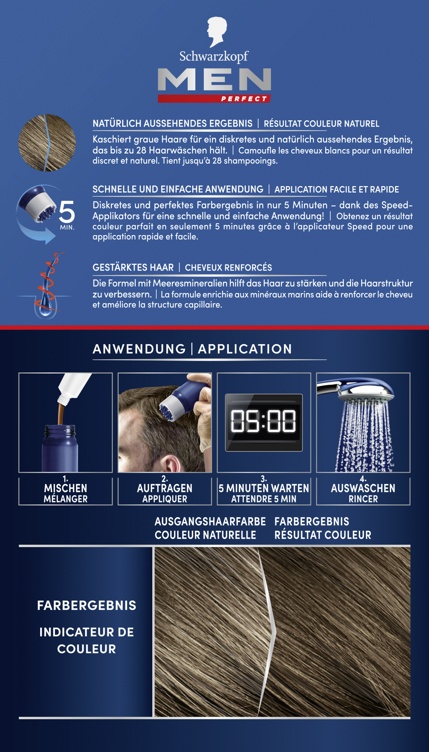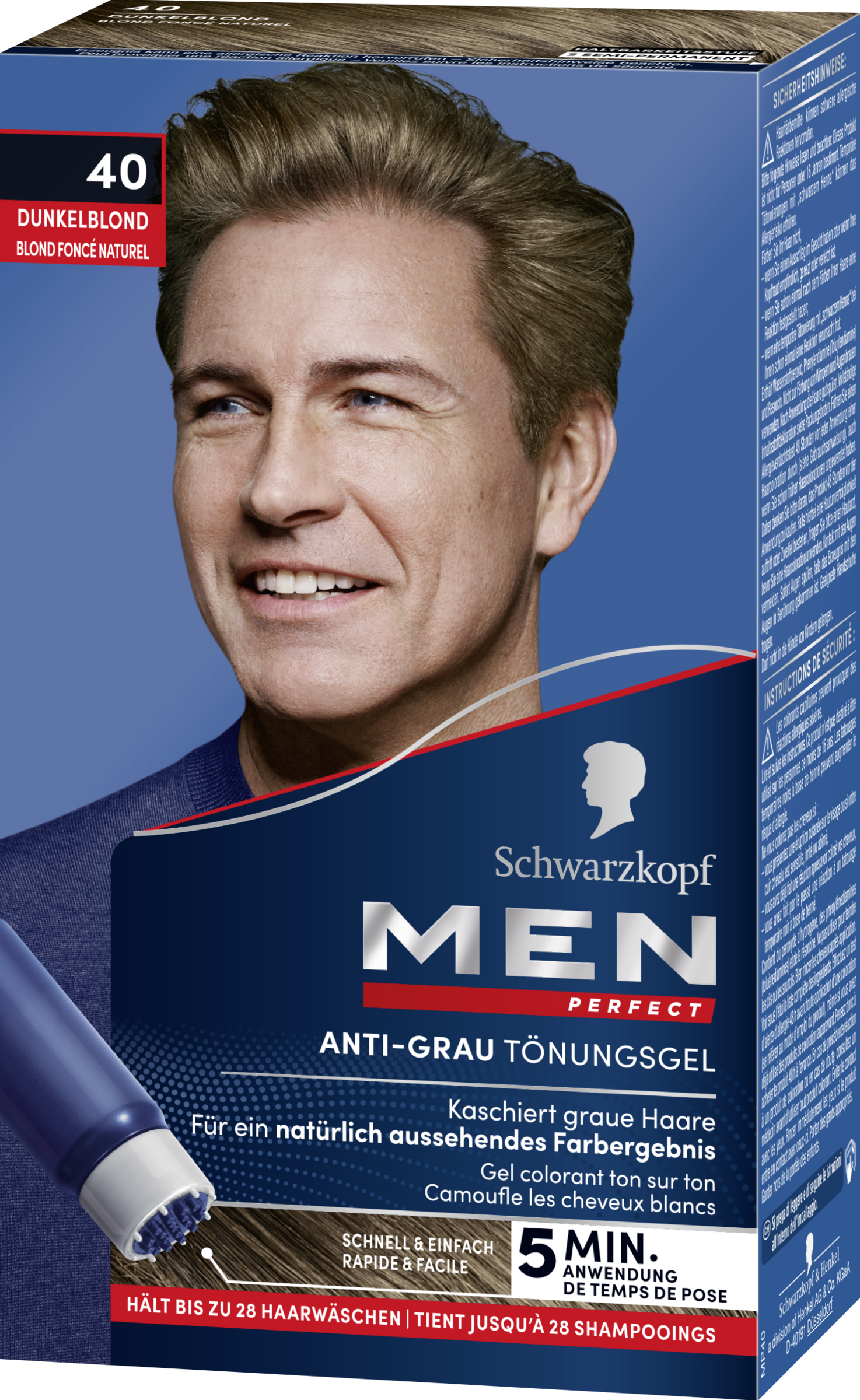 SCHWARZKOPF MEN Perfect Anti-Grau Tönungs-Gel ist eine Coloration, die speziell für Männer entwickelt wurde. Das MEN Perfect Anti-Grau Tönungs-Gel kaschiert graue Haare in nur 5 Minuten und sorgt für ein diskretes und natürlich aussehendes Ergebnis. Der Speed-Applikator verspricht eine schnelle undleichte Anwendung und das Ergebnis hält bis zu 28 Haarwäschen. Die Formel mit Meeresmineralien hilft, Ihr Haar beim Haare färben zu stärken und die Haarstruktur zu verbessern.
