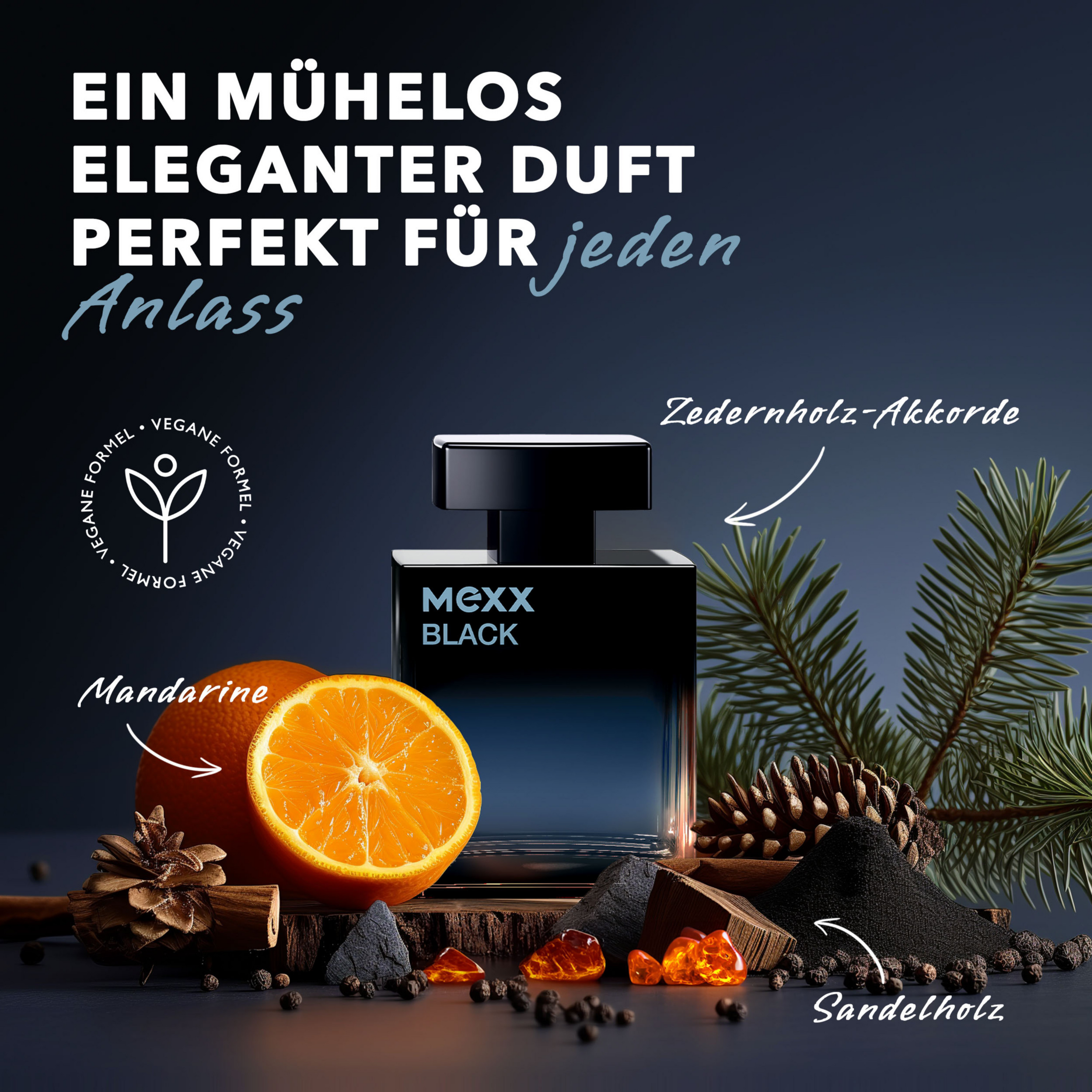 Verführerische Sinnlichkeit und maskuline Eleganz: Das Mexx Black Man Eau de Toilette ist ein faszinierend-intensiver Duft für Männer aus holzigen und aquatischen Noten. Die unwiderstehliche Komposition beginnt mit einem belebenden Hauch von aquatischen Akkorden, schwarzem Pfeffer und spritziger Mandarine. In der Herznote dominiert der frische Duft von Seerose, die mit der sanften Wärme von Zedernholz verschmilzt. Der würzige Duft von Patchouli, Sandelholz und Amber bildet die erdig-harzige Basis. Das verführerisch-intensive Mexx Black Man Eau de Toilette passt zu jeder Gelegenheit und eignet sich besonders für einen aufregenden Abend. Die Duftkomposition überzeugt mit neuer, veganer Formel und reduzierter Verpackung mit FSC-zertifizierten Materialien. In dem eleganten, rechteckigen Glasflakon mit schwarzen Ombre-Design kommt der betörende Duft besonders gut zur Geltung.