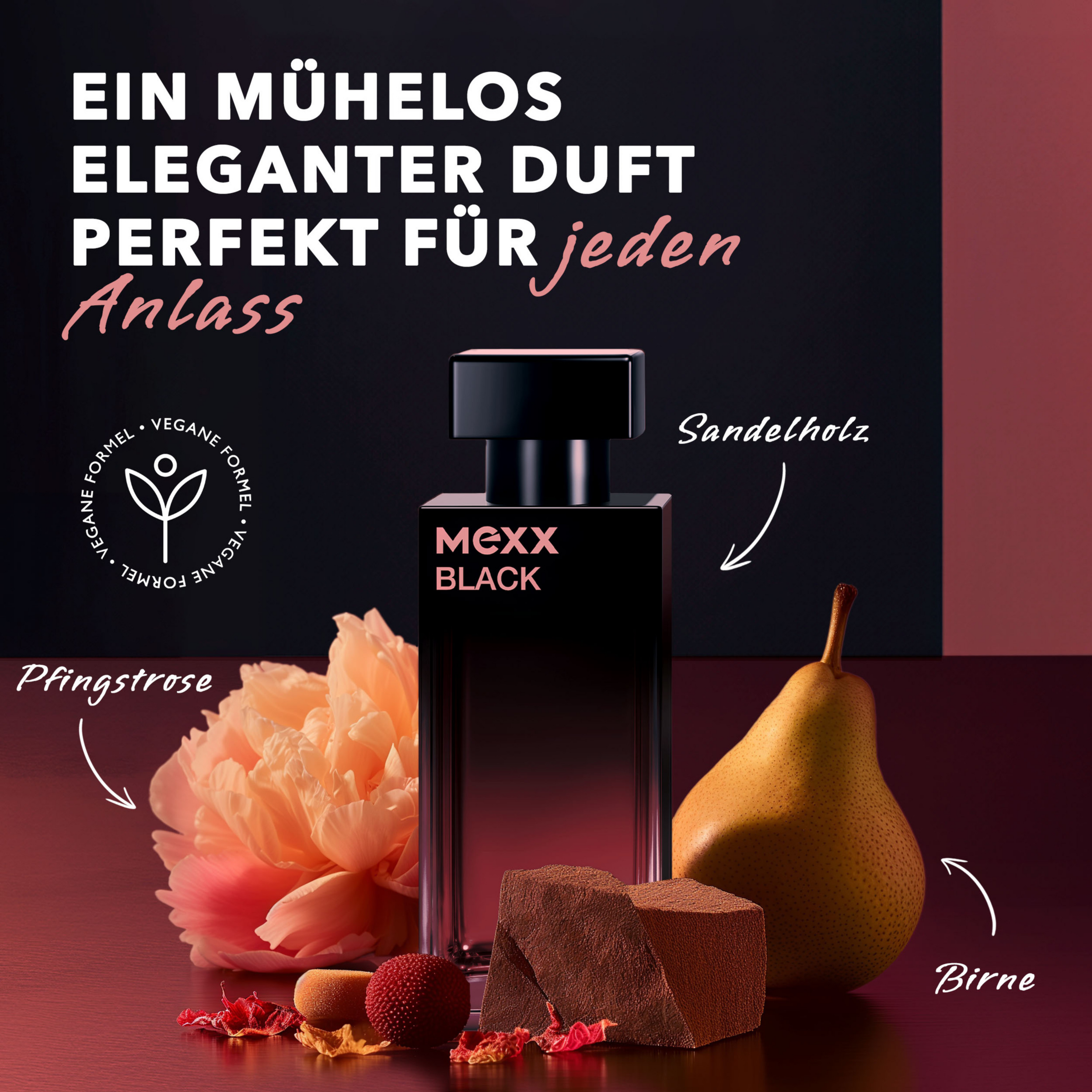 Verführerische Sinnlichkeit und weibliche Eleganz: Das Mexx Black Woman Eau de Parfum ist ein fesselnd-intensiver Duft für Frauen aus blumigen und saftig-süßen Noten. Die betörende Duftkomposition startet in der Kopfnote mit einem üppigen Blumenbouquet aus Pfingstrose, Ingwerblüte, Ringelblume und Freesie, welches in einer saftigen Herznote aus Litschi, Birne und Aprikose aufgeht, die mit einem fruchtigen Lotus-Akkord und weichem Sandelholz verwoben ist. Die beruhigende Basisnote bilden Vanille, Sandelholz und Amber. Das unwiderstehliche Mexx Black Woman Eau de Parfum passt zu jeder Gelegenheit, eignet sich aber besonders für einen aufregenden Abend. Die Duftkomposition überzeigt mit neuer, veganer Formel und reduzierter Verpackung mit FSC-zertifizierten Materialien. In dem eleganten, rechteckigen Glasflakon mit schwarzen Ombre-Design kommt der betörende Duft besonders gut zur Geltung.