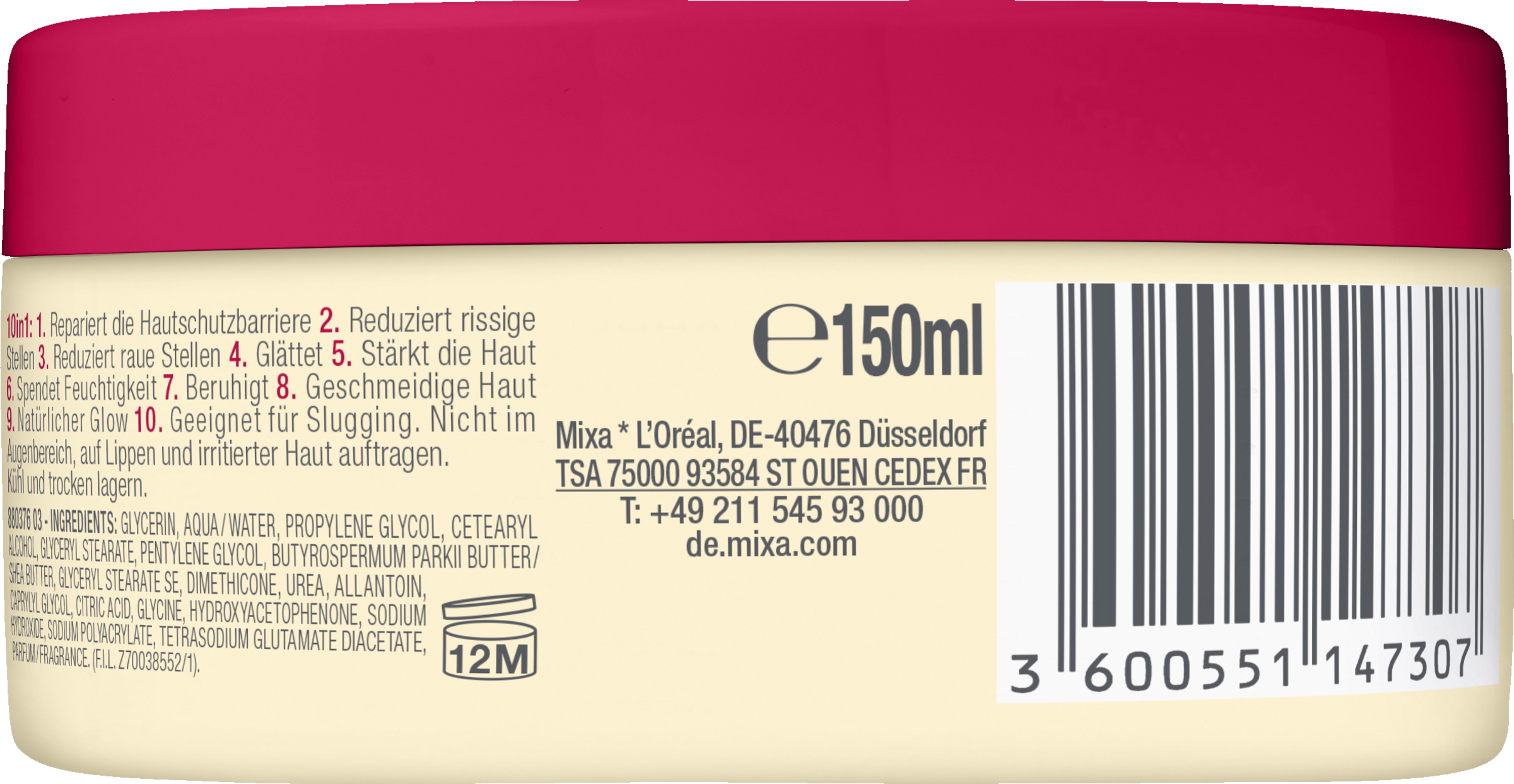 GLYCERIN • AQUA / WATER • PROPYLENE GLYCOL • CETEARYL ALCOHOL • GLYCERYL STEARATE • PENTYLENE GLYCOL • BUTYROSPERMUM PARKII BUTTER / SHEA BUTTER • GLYCERYL STEARATE SE • DIMETHICONE • UREA • ALLANTOIN • CAPRYLYL GLYCOL • CITRIC ACID • GLYCINE • HYDROXYACETOPHENONE • SODIUM HYDROXIDE • SODIUM POLYACRYLATE • TETRASODIUM GLUTAMATE DIACETATE • PARFUM / FRAGRANCE (F.I.L. Z70038552/1).