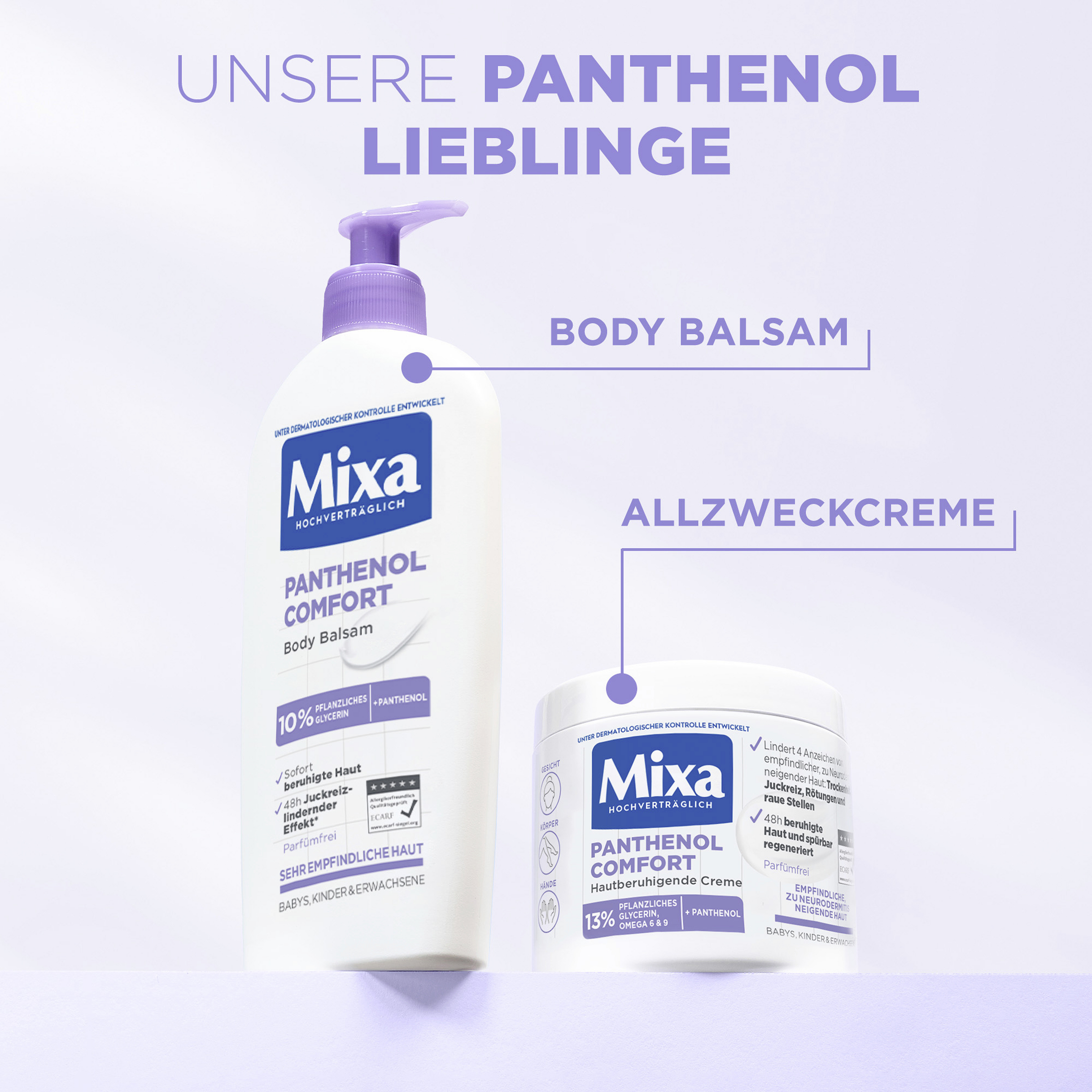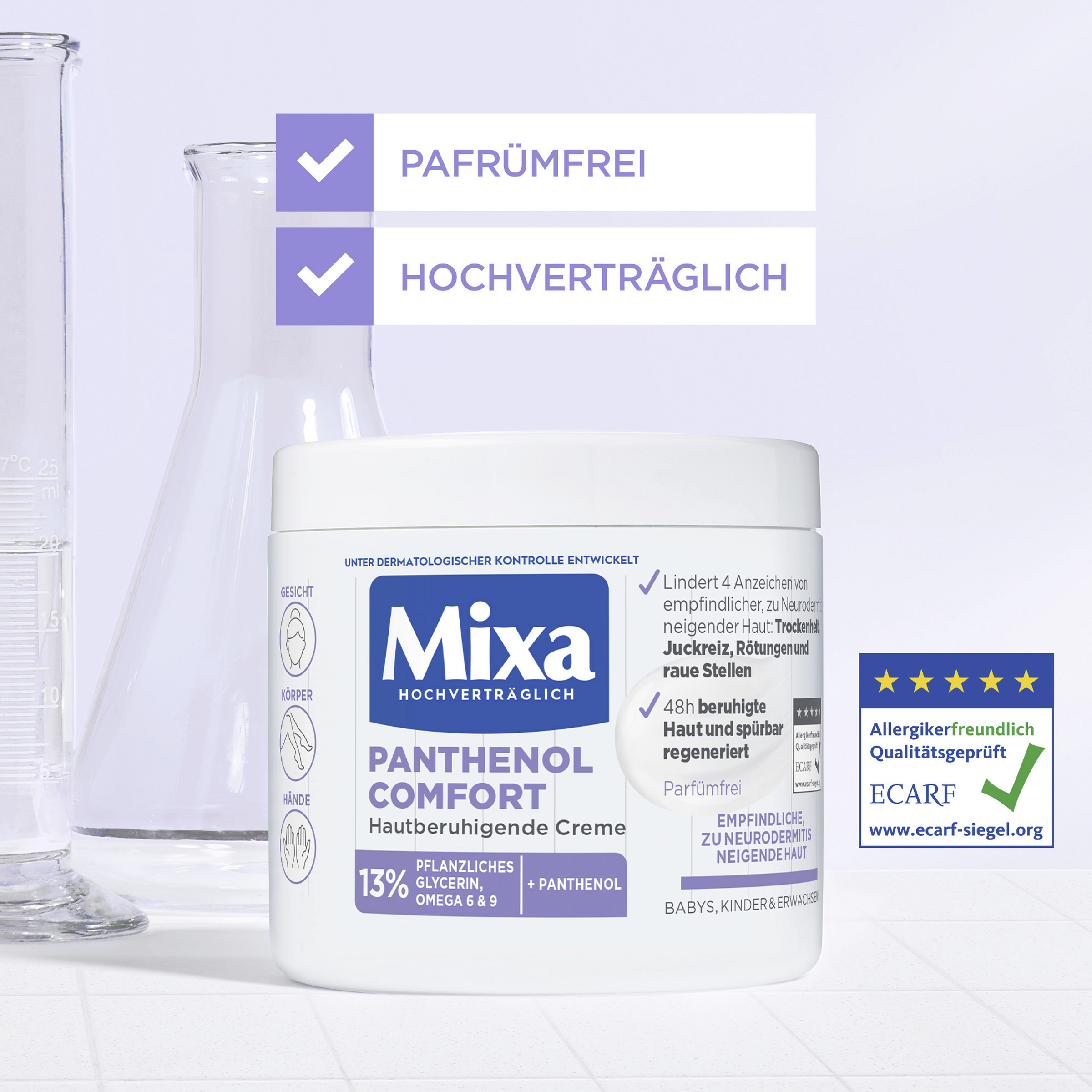 Die Mixa Panthenol Comfort Hautberuhigende Creme ist eine sanfte Pflege für das Gesicht, den Körper sowie die Hände. Sie ist speziell auf die Bedürfnisse von zu Neurodermitis neigender Haut abgestimmt und verleiht bereits ab der ersten Anwendung sichtbar glattere und spürbar geschmeidigere Haut. Die Formel mit Panthenol beugt Juckreiz und Rötungen vor. Dank ihrer schnell einziehenden und nicht fettenden Textur hinterlässt die Pflegecreme ein geschmeidiges Hautgefühl und reduziert langanhaltend Spannungsgefühle.