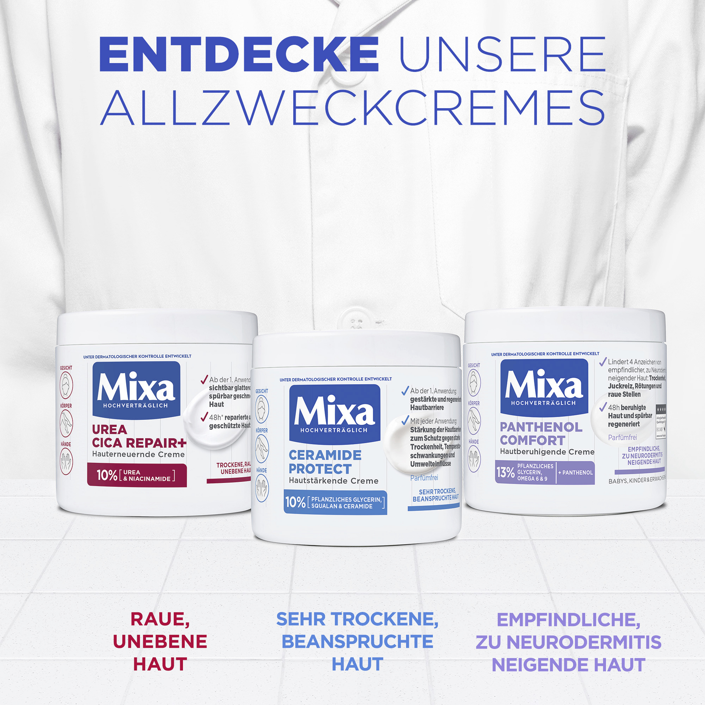 - mildert Unebenheiten von zu Neurodermitis neigender Haut und unterstützt dabei die natürliche Hautbarriere