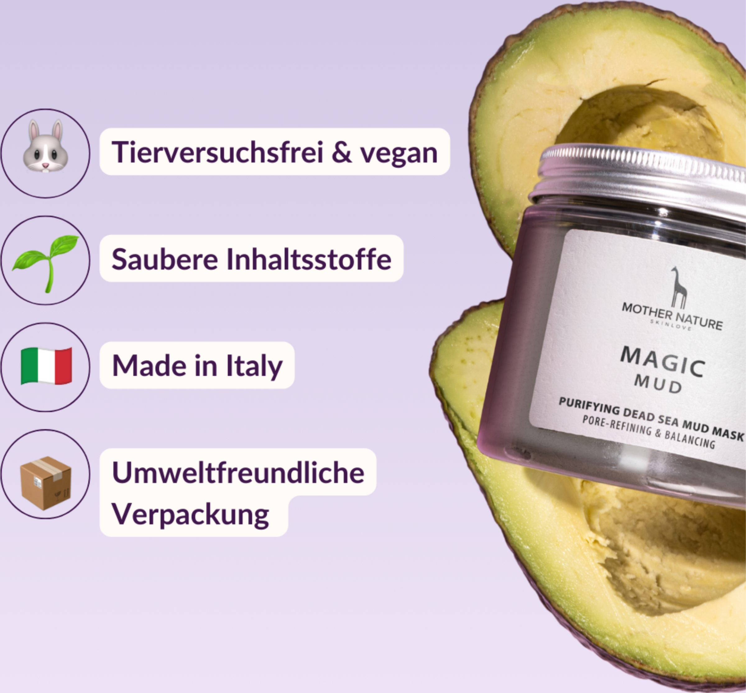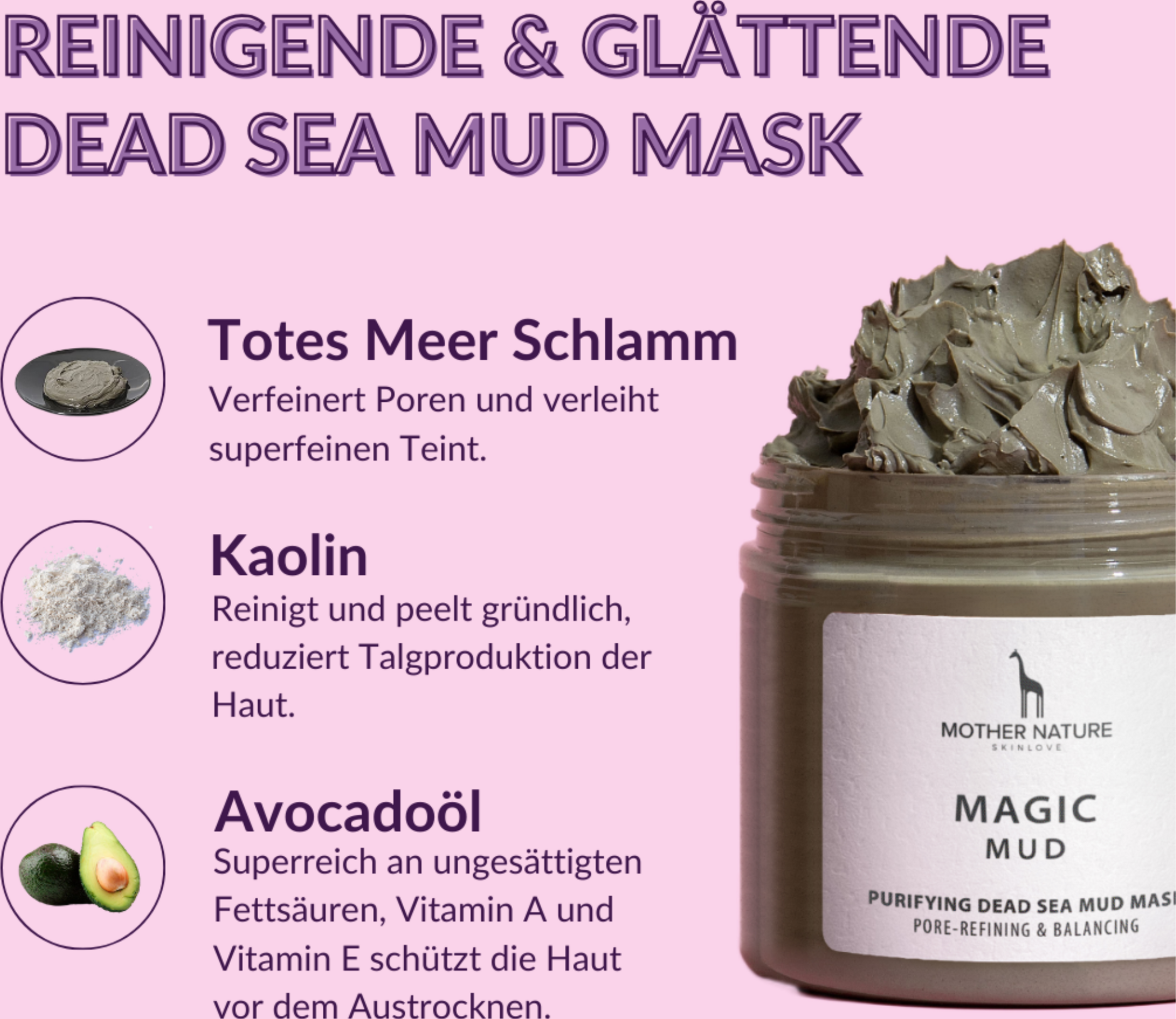 Meer ist mehr: Die Mother Nature Dead Sea Mud Mask mit wertvollem Schlamm aus dem Toten Meer, Weißer Tonerde, Avocadoöl und Vitamin E klärt die Haut in der Tiefe und sorgt für einen strahlenden, frischen und straffen Teint.