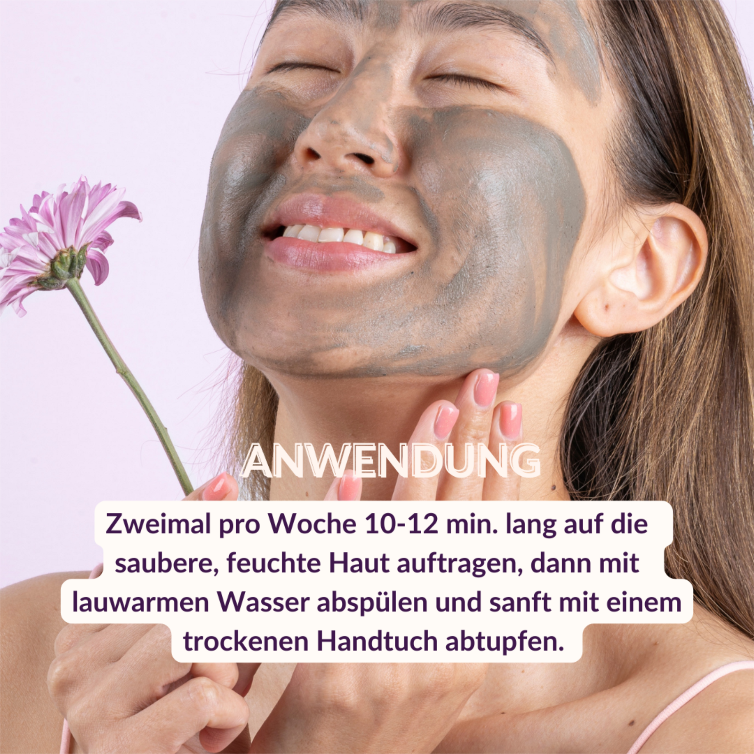 Trage eine Menge in der Größe einer Walnuss mit sauberen Händen auf die gereinigte Gesichtshaut und auf Hals und Dekolleté auf. Wenn du möchtest, kannst du dazu auch einen Spachtel oder einen Pinsel verwenden. Augenpartie aussparen. Lasse die Maske 10-20 Minuten einwirken und wasche sie anschließend mit lauwarmem Wasser ab.