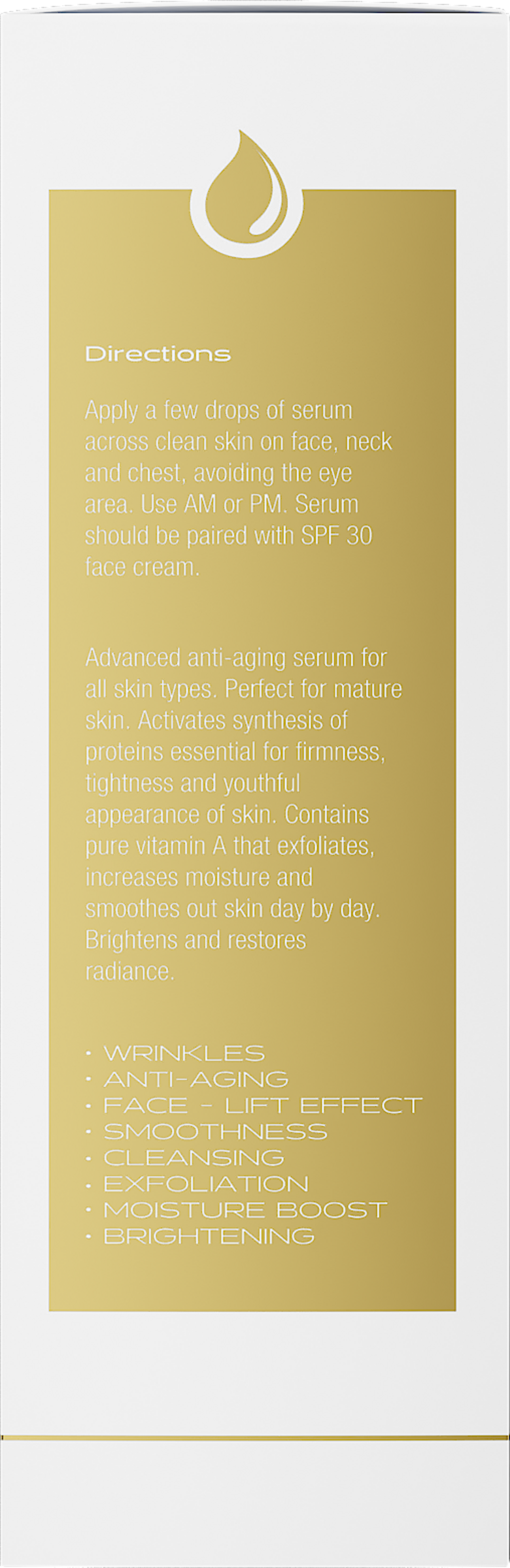- REINES RETINOL – Vitamin A in seiner reinsten Form. Retinol verjüngt die Haut, ohne sie zu reizen. Es stimuliert die Proteinsynthese, strafft, glättet wirksam Falten, reduziert Verfärbungen und erneuert den Teint