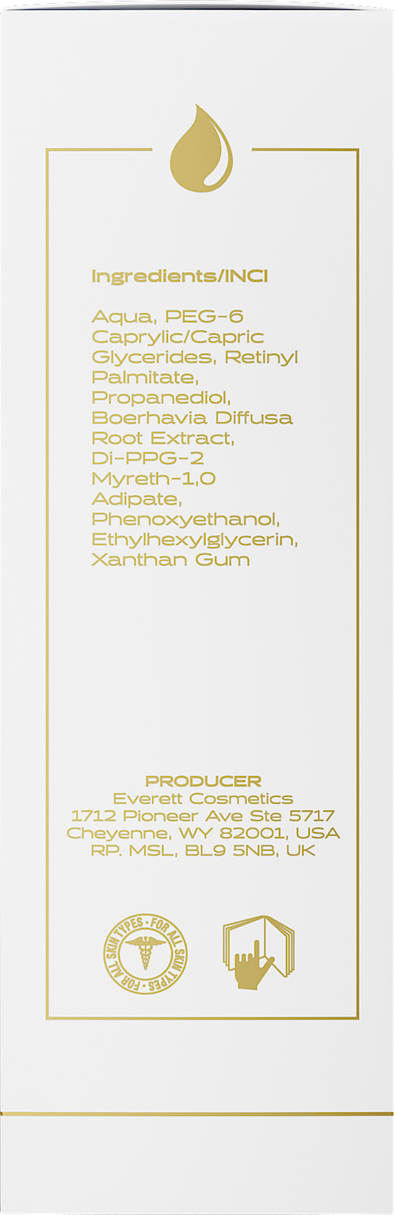 Aqua, PEG-6 Caprylic/Capric Glycerides, Retinyl Palmitate, Propanediol, Boerhavia Diffusa Root Extract, Di-PPG-2 Myreth-1,0 Adipate, Phenoxyethanol, Ethylhexylglycerin, Xanthan Gum.