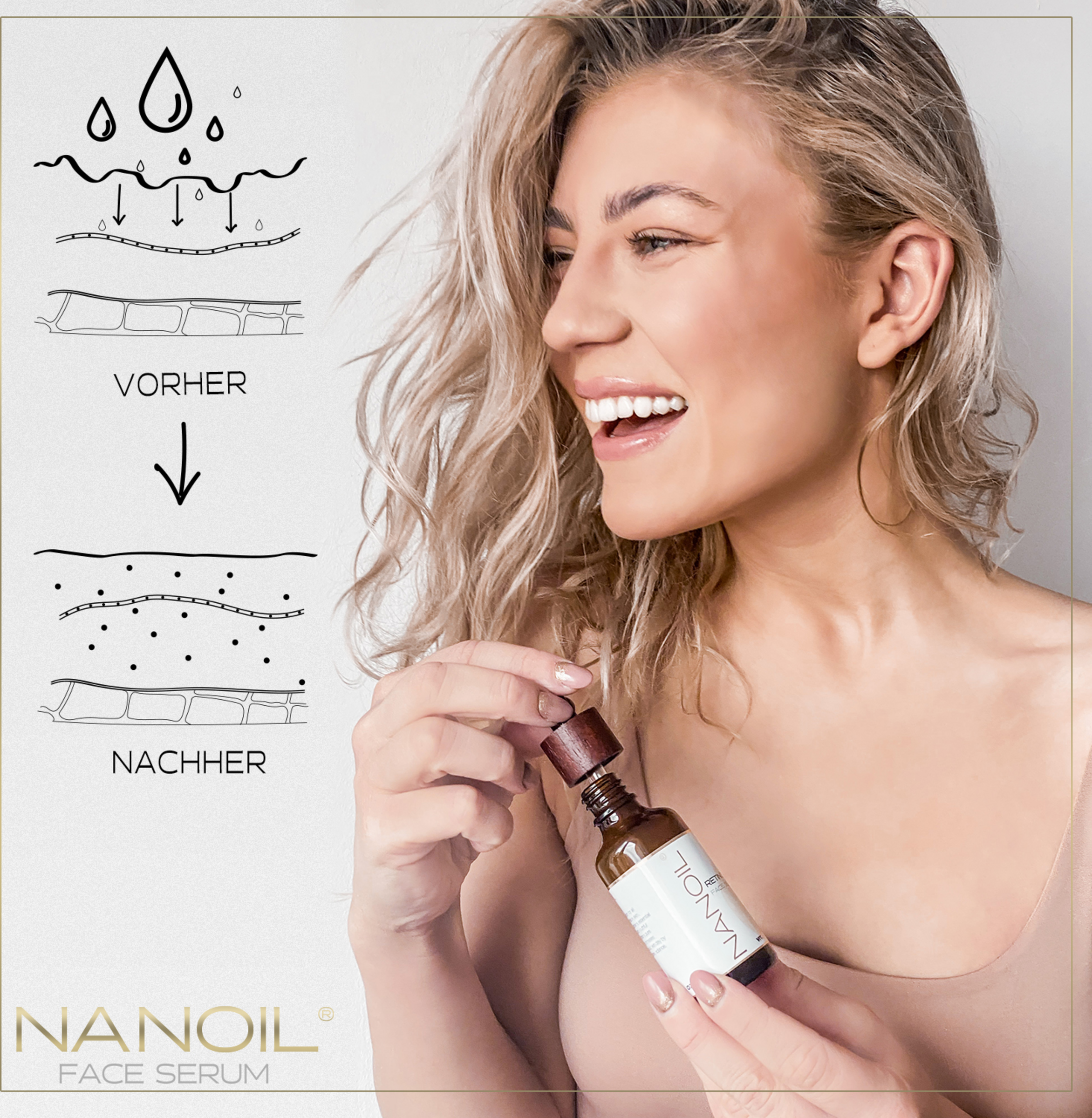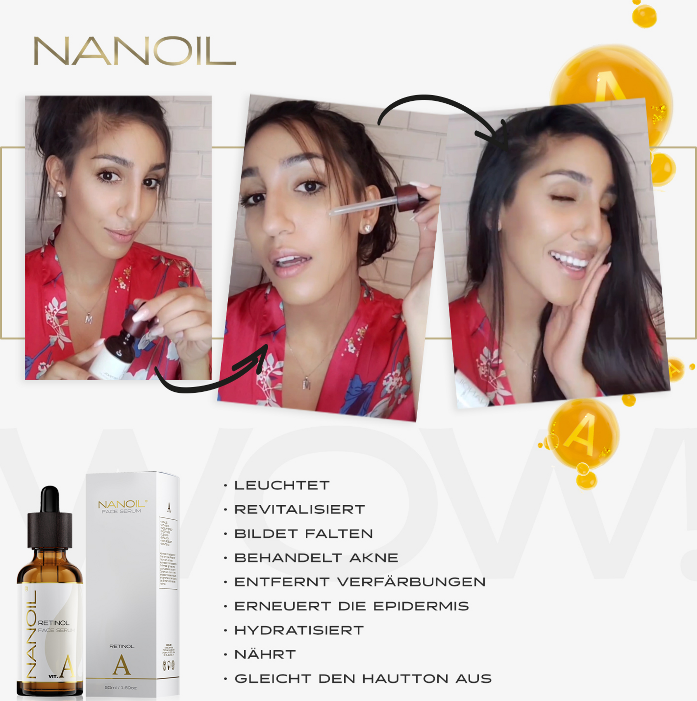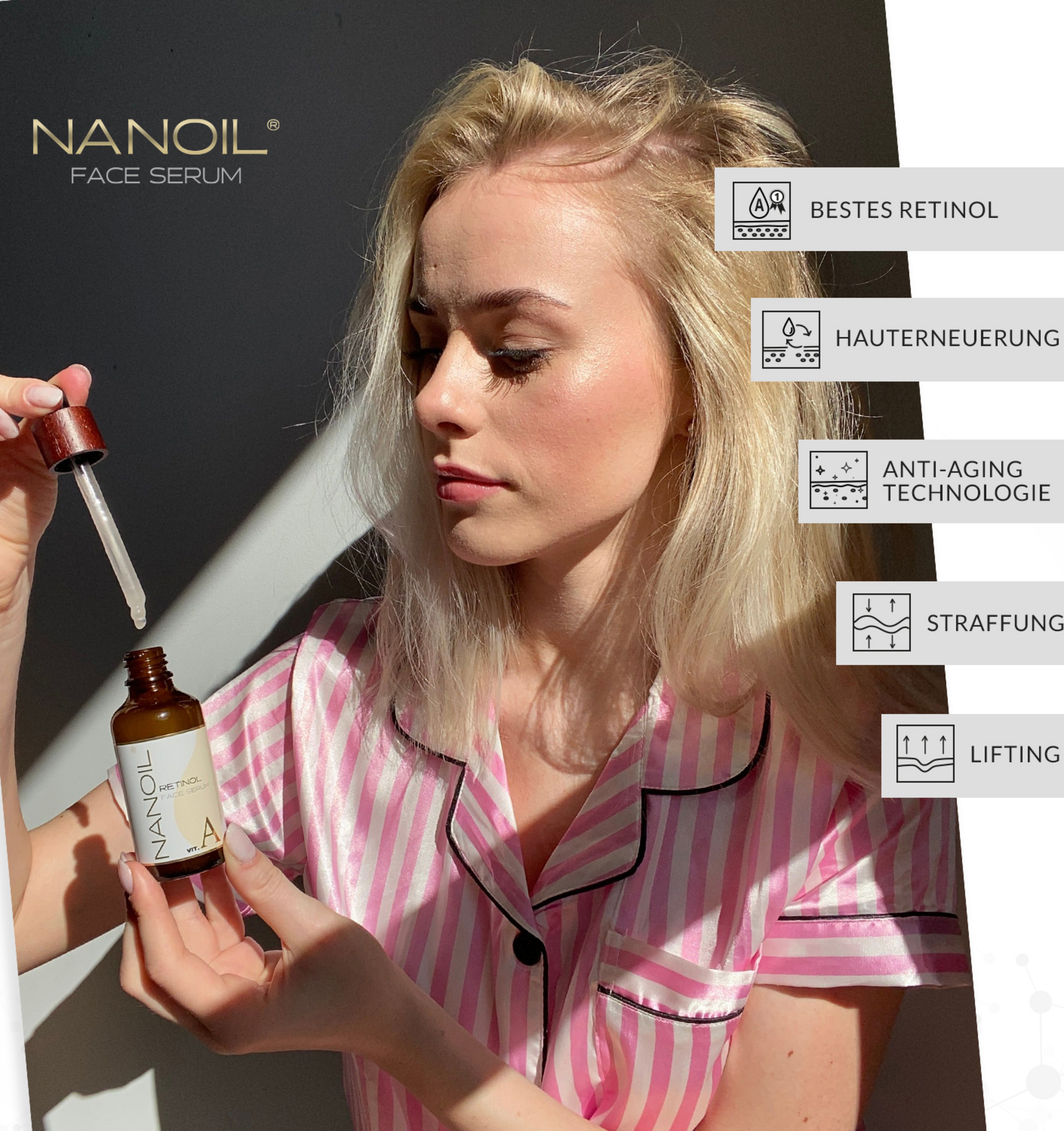 Vertrauen Sie der verjüngenden Retinolkraft von Nanoil und schenken Sie Ihrem Teint eine atemberaubende Schönheit!NANOIL Gesichtsserum mit Retinol – Wirkung: