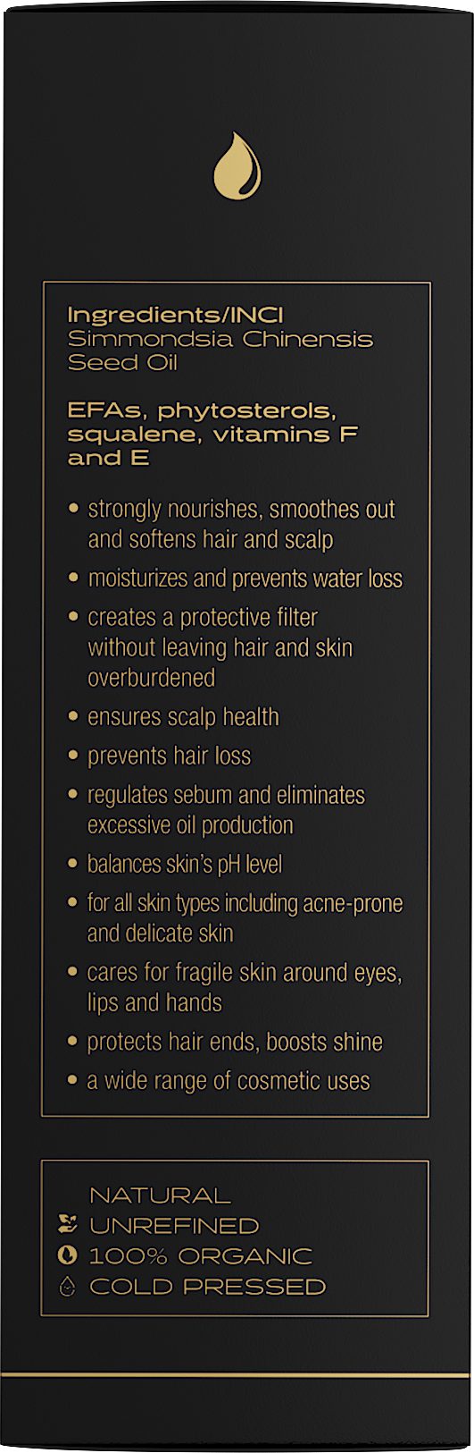 100% organisches, kaltgepresstes, nicht raffiniertes Jojobaöl für Haar, Körper, Gesicht und Nägel.