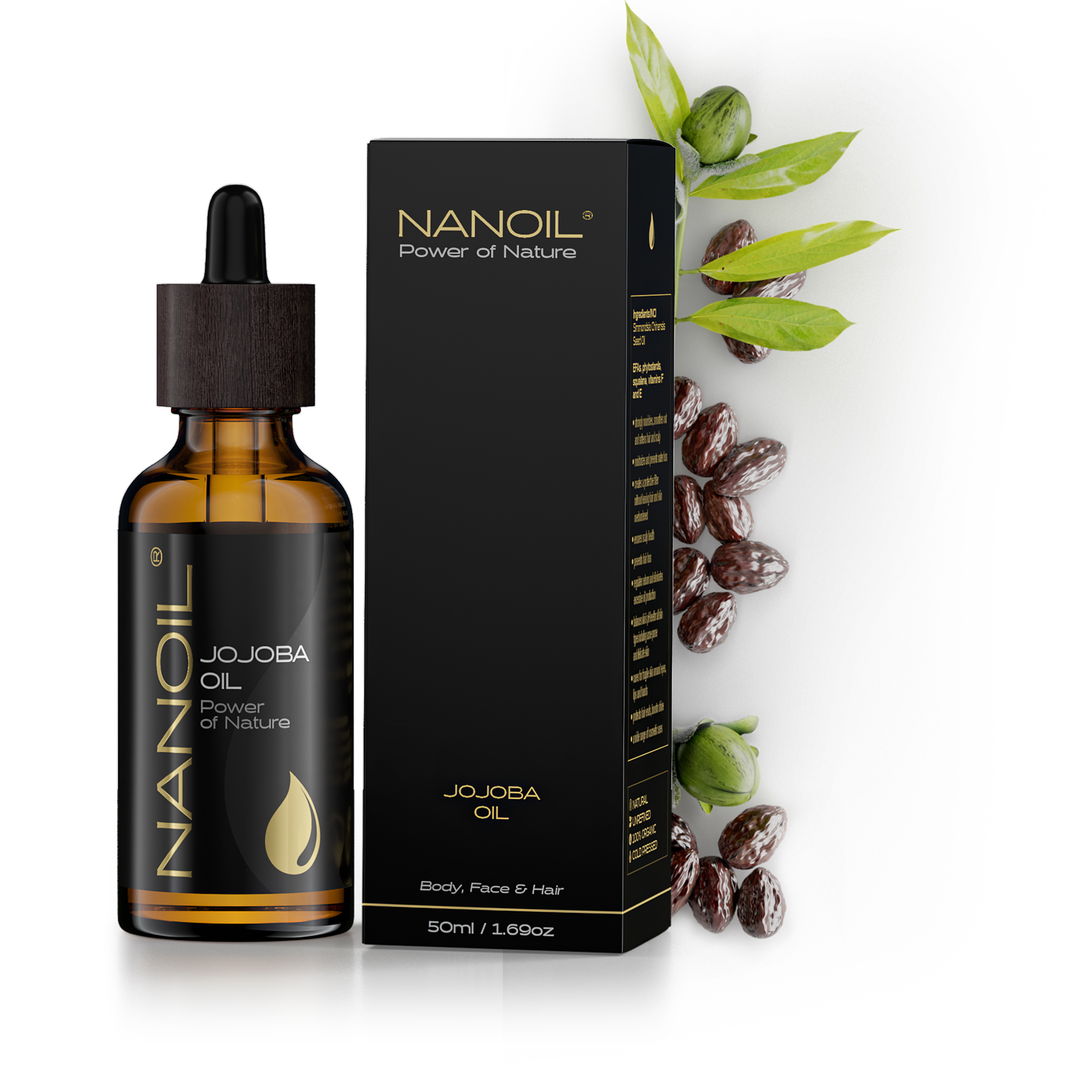 Nanoil Jojobaöl ist die hochwertige, natürliche Essenz aus Samen des immergrünen Jojobastrauchs aus der amerikanischen Sonora-Wüste. Das naturreine, kaltgepresste, nicht raffinierte, organische Öl enthält wertvolle Fettsäuren, Pflanzensterole, Squalen und Vitamine A, E, F.