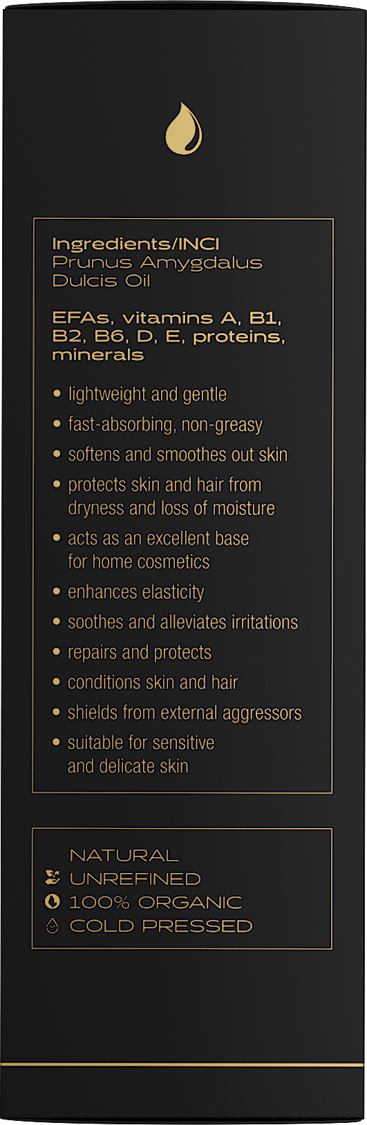100% organisches, kaltgepresstes, nicht raffiniertes Mandelöl für Haar, Körper, Gesicht und Nägel.