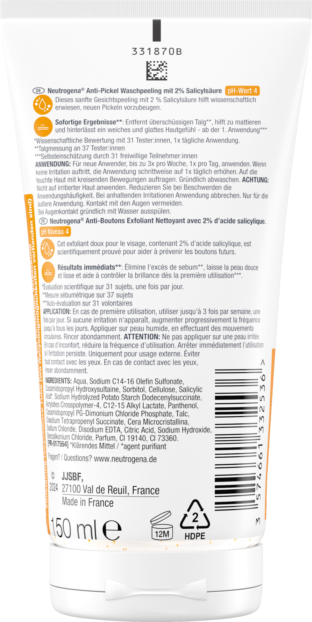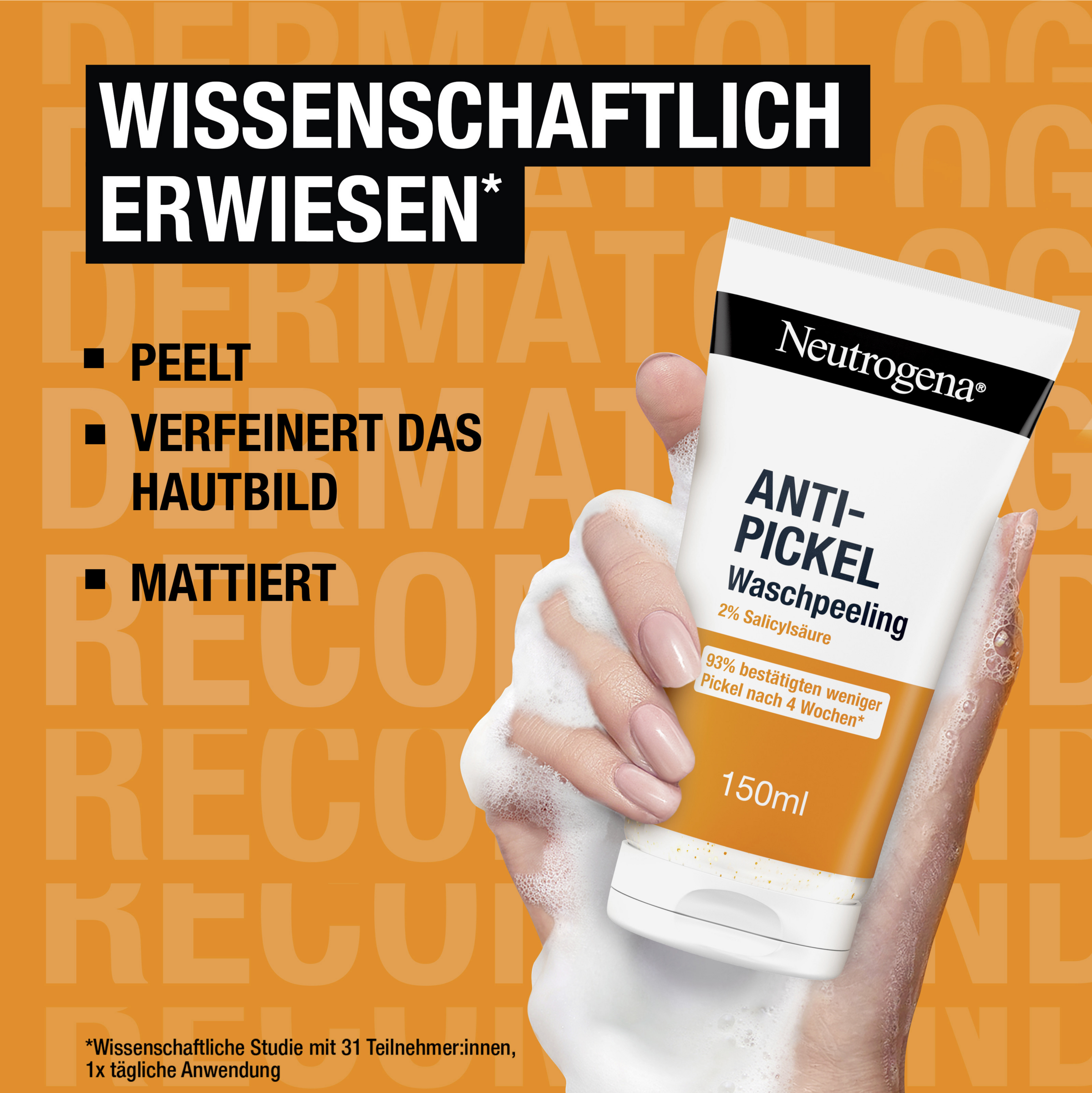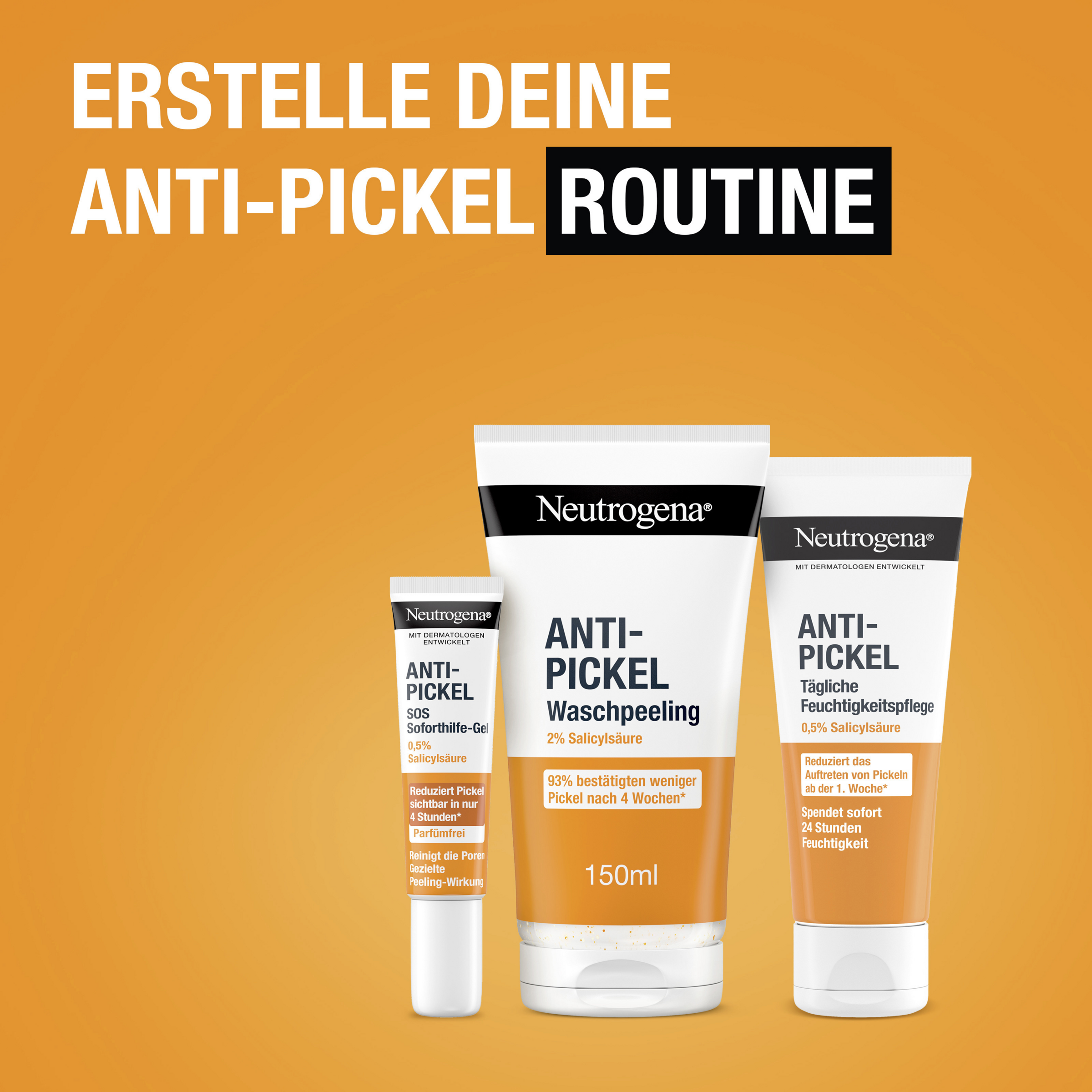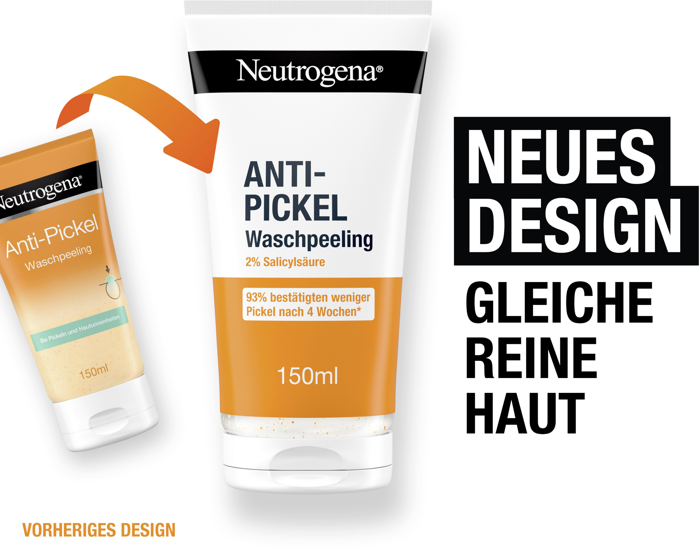 Sanfte Gesichtsreinigung für sofortige Ergebnisse*: Das Neutrogena Anti-Pickel Waschpeeling hinterlässt ein weiches & glattes Hautgefühl und ist zugleich eine sanfte Gesichtsreinigung für sofortige Ergebnisse*. Das klärende Anti Pickel Peeling im neuen Design peelt, um das Hautbild zu verfeinern, enthält 2% Salicylsäure (BHA) um Pickel zu beseitigen, hilft wissenschaftlich erwiesen neuen Pickeln vorzubeugen und hat einen sanften pH-Wert von 4. Zudem wurde das Gesichtspeeling bei unreiner Haut mit Dermatologen entwickelt und 93% der Tester:innen bestätigten weniger Pickel nach 4 Wochen**. Darüber hinaus hilft die sanft reinigende Gesichtspflege in vollständig recycelbarer Tube*** zu mattieren und enthält 29% weniger Plastik****.