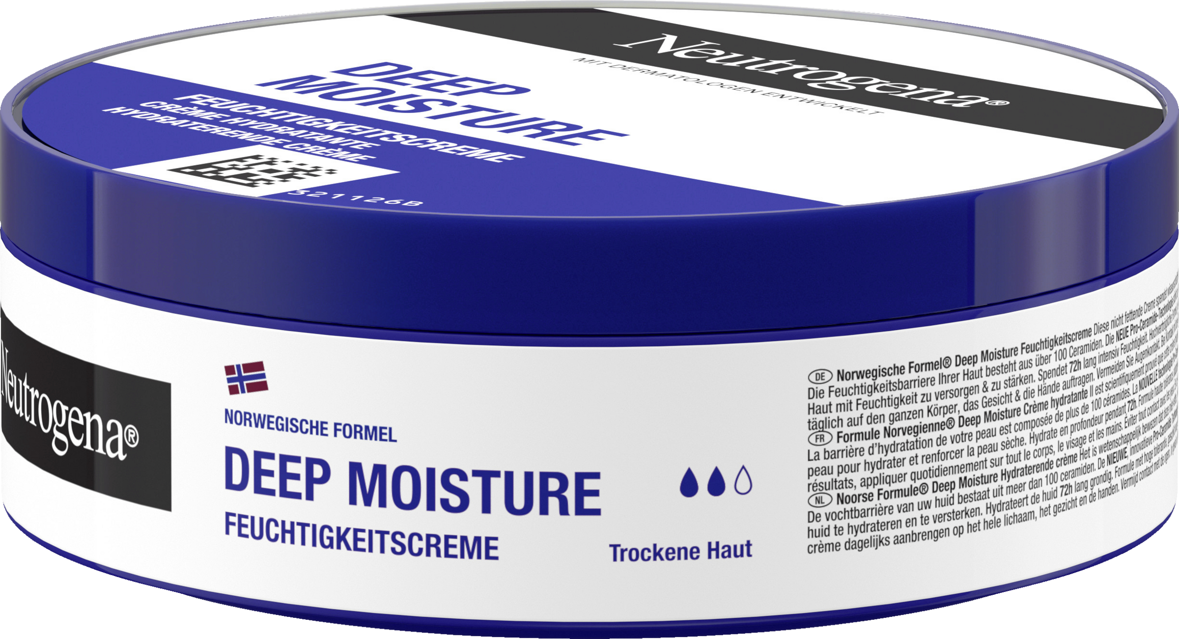 Die Neutrogena Norwegische Formel Deep Moisture Feuchtigkeitscreme für trockene Haut ist eine nicht fettende Creme, die wissenschaftlich bewiesen die Hautbarriere stärkt und 72h lang intensiv Feuchtigkeit spendet. Die Pro-Ceramide-Technologie stärkt auf innovative Weise die essenziellen Ceramide der Haut, um trockene Haut mit Feuchtigkeit zu versorgen und zu stärken. Die Hautcreme ist dank der hochverträglichen Formel auch für empfindliche Haut geeignet.