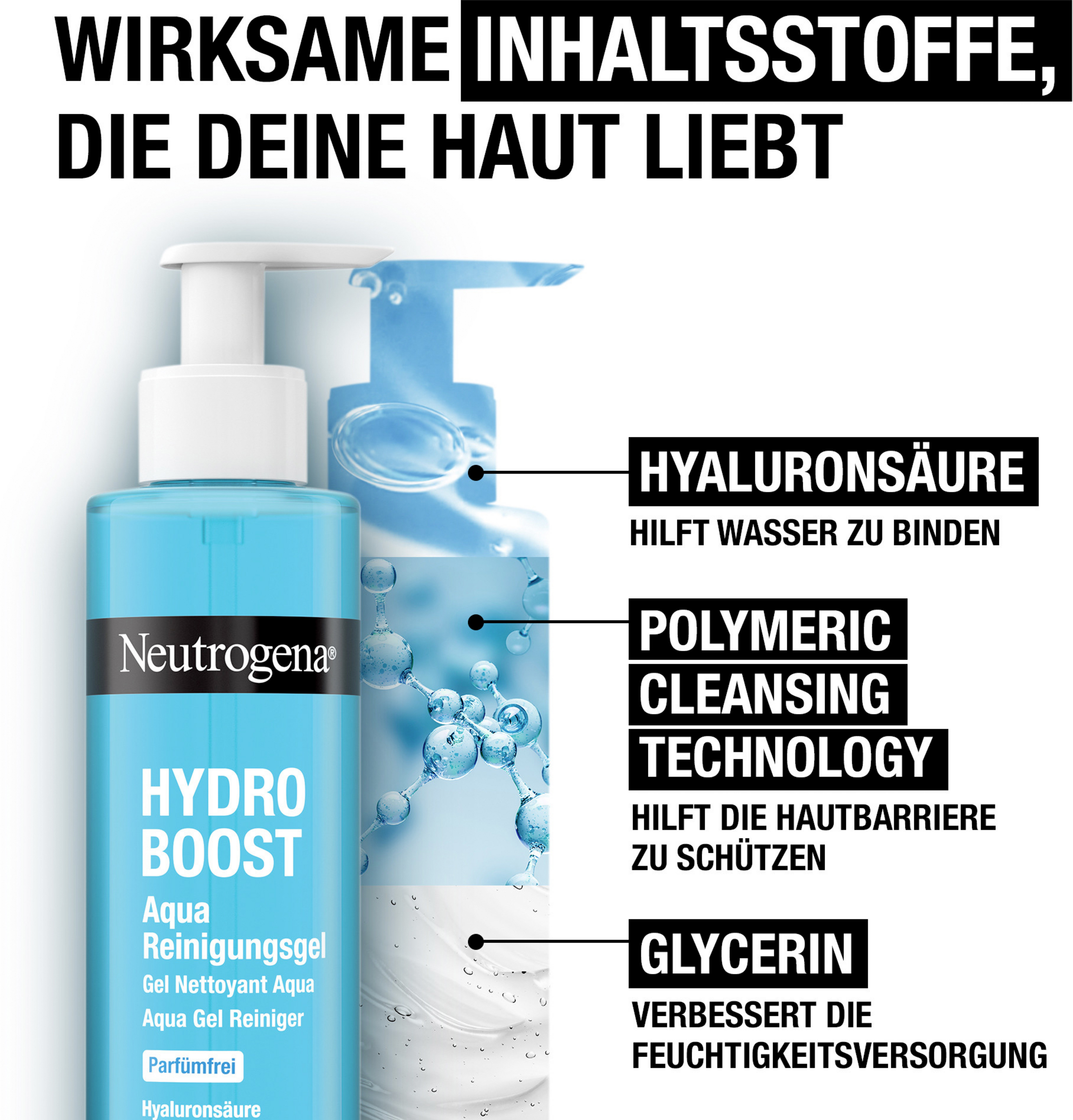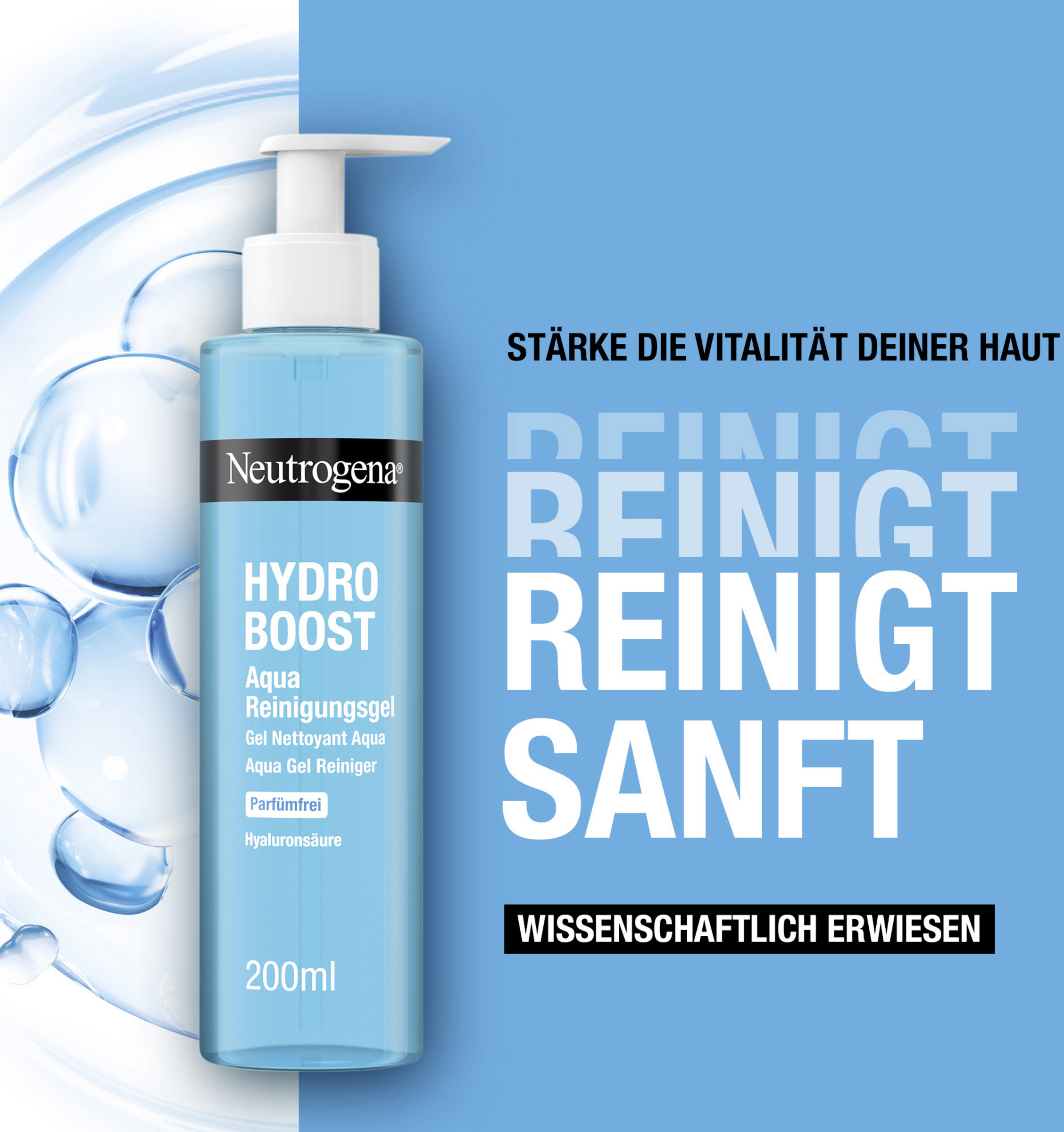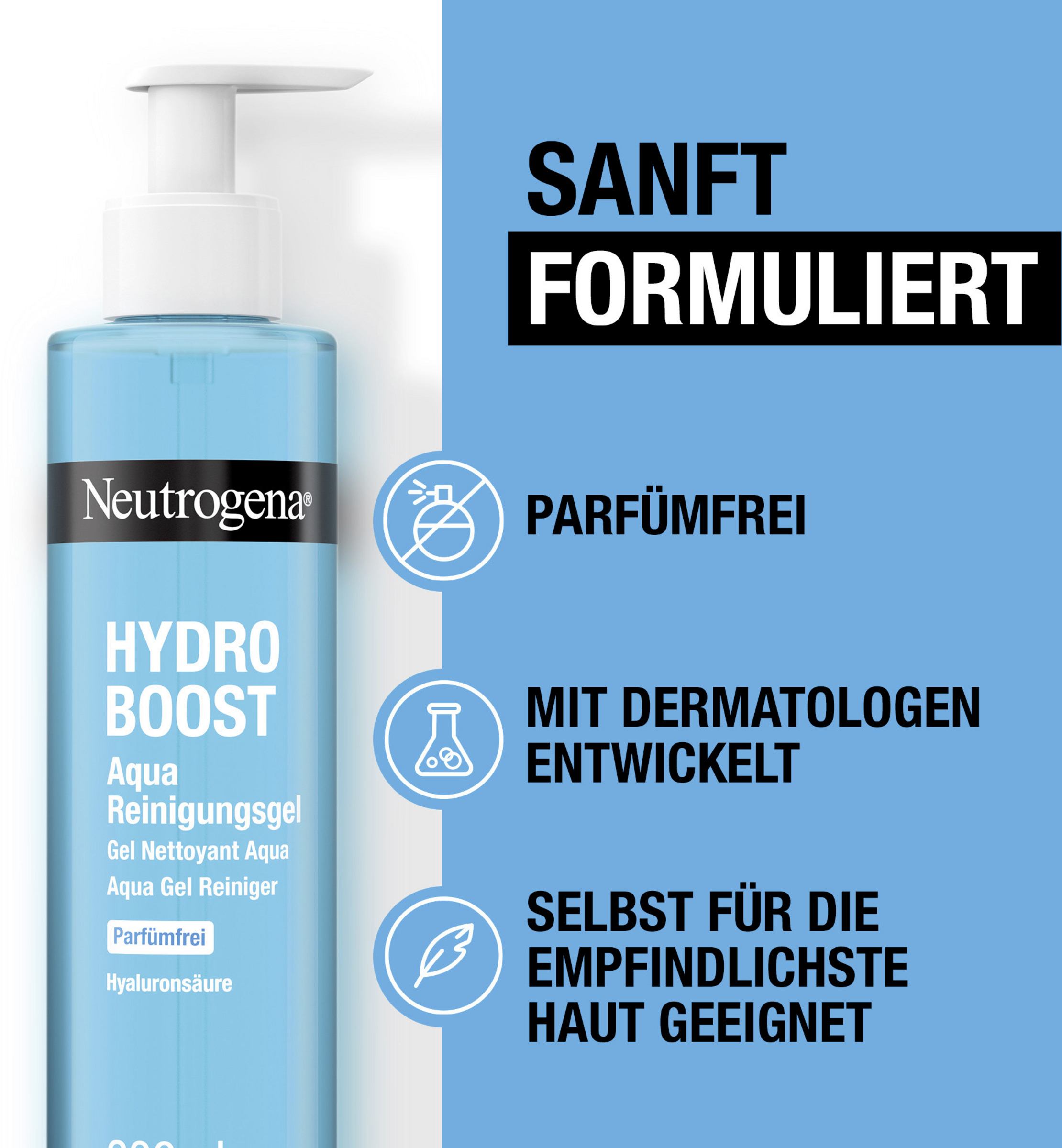 Das parfümfreie Reinigungsgel wurde mit Dermatolog:innen entwickelt und ist mit Inhaltsstoffen angereichert, die auf natürliche weise in der Haut vorkommen wie Hyaluronsäure und Glycerin.
