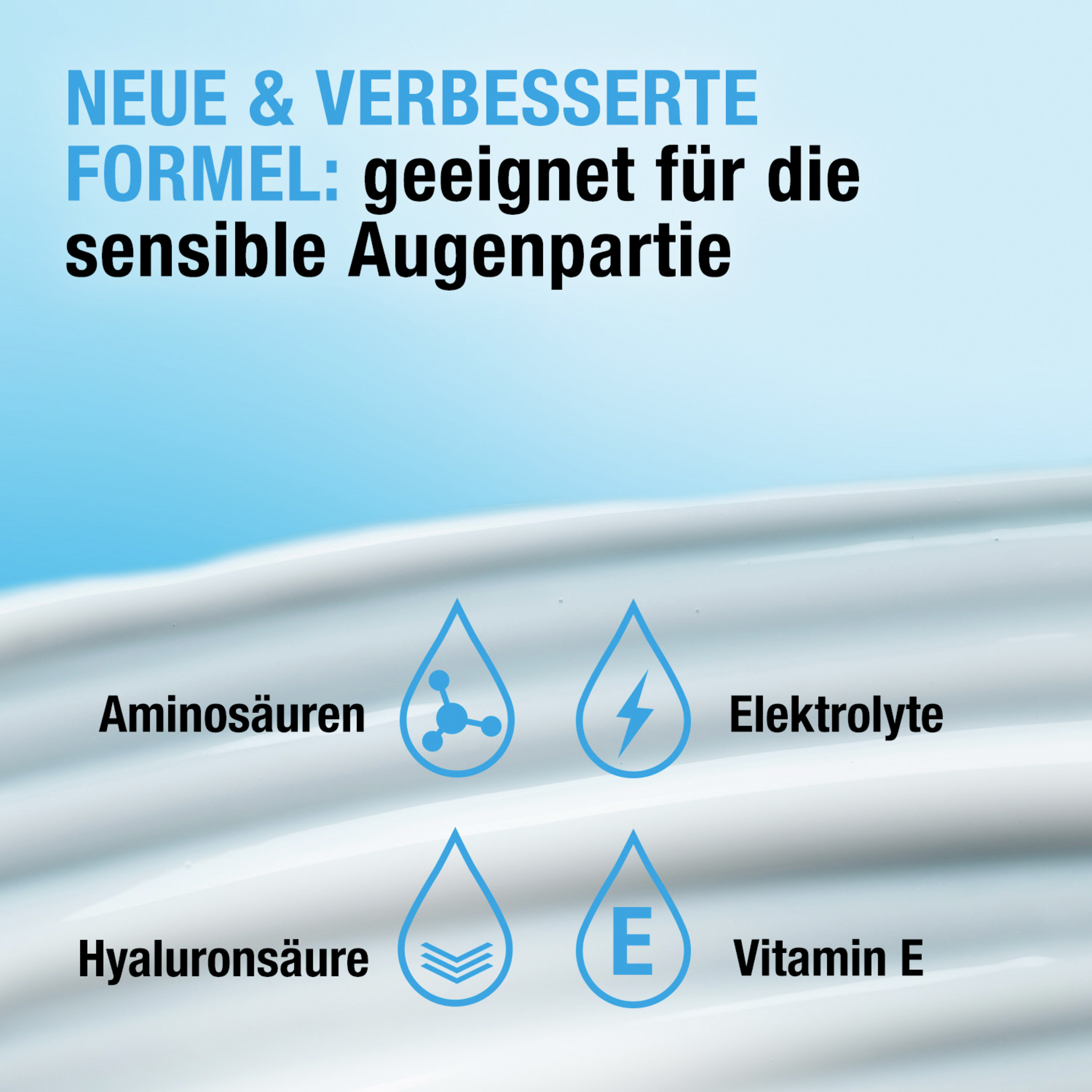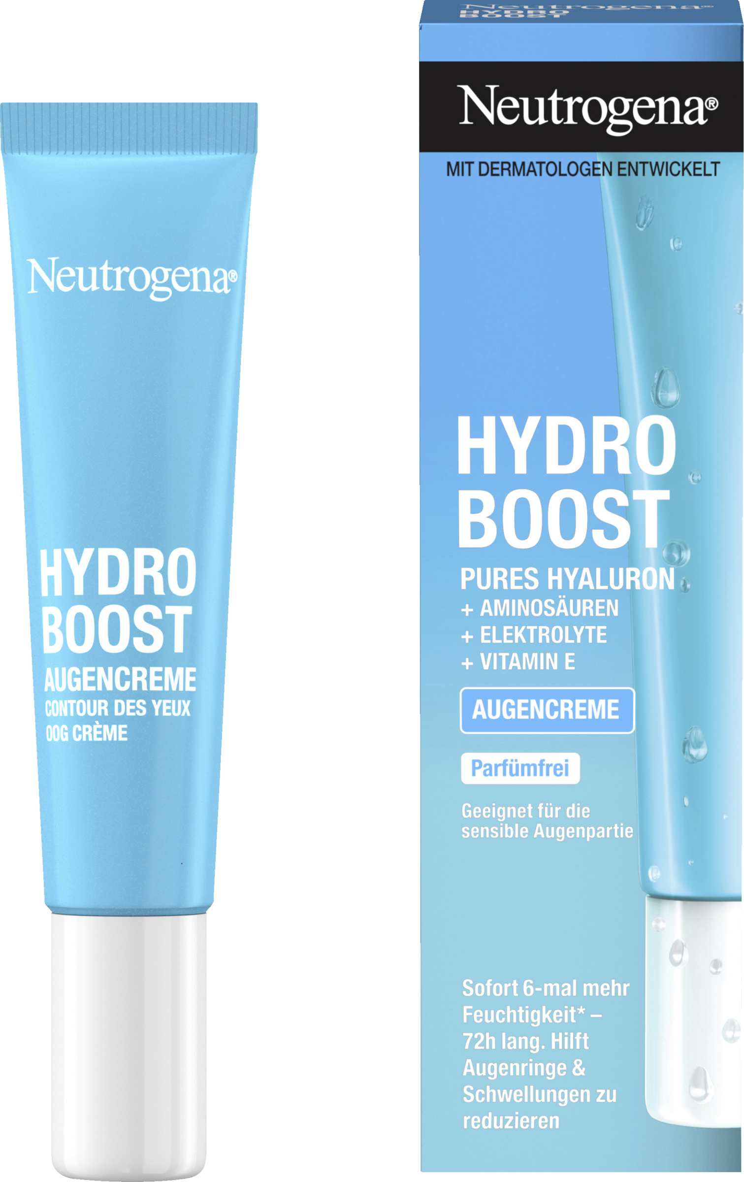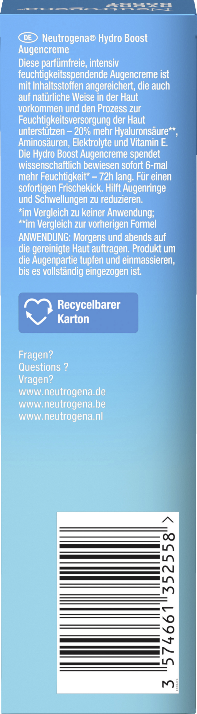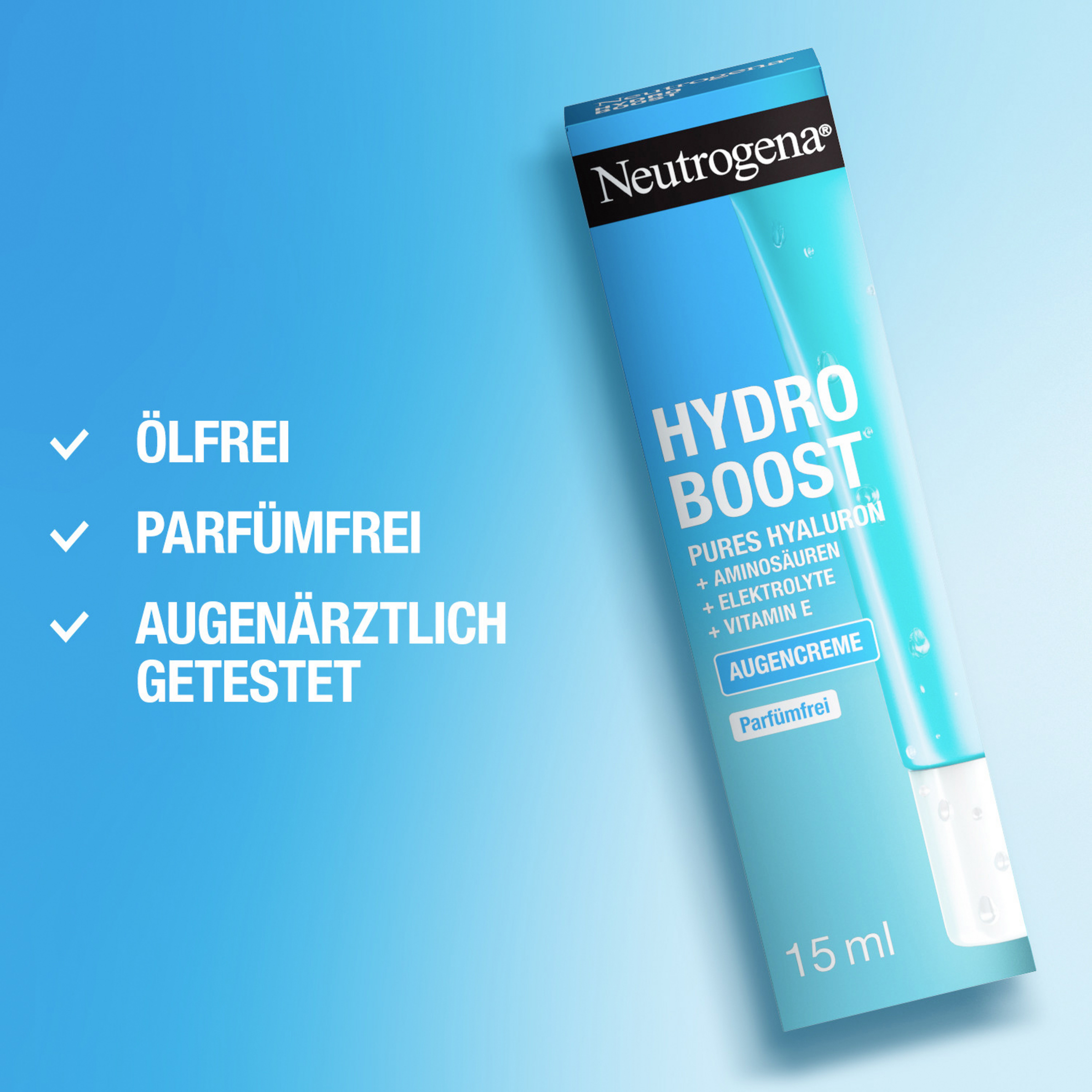 Die parfümfreie & intensiv feuchtigkeitsspendende Neutrogena Hydro Boost Augencreme mit purem Hyaluron hilft, Augenringe & Schwellungen zu reduzieren. Zudem spendet die Augen Creme wissenschaftlich bewiesen sofort 6x mehr Feuchtigkeit* über einen Zeitraum von 72 Stunden. Die Augenpflege Creme mit 20% mehr Hyaluronsäure**, Aminosäuren, Elektrolyte und Vitamin E verleiht einen sofortigen Frischekick, wurde mit Dermatologen entwickelt und ist augenärztlich getestet.