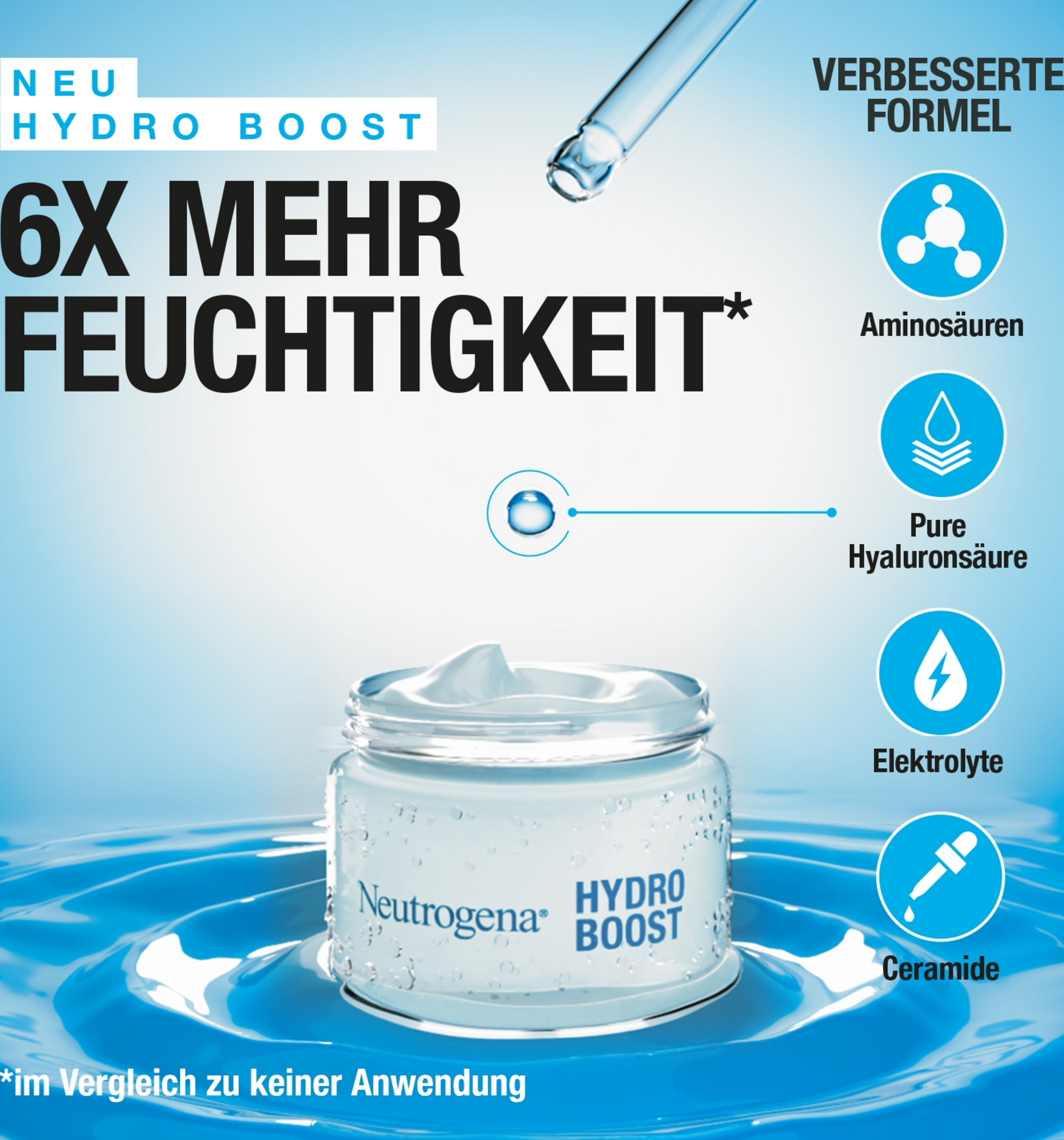 Die parfümfreie, intensiv pflegende Neutrogena Hydro Boost Aqua Creme ist mit Inhaltsstoffen angereichert, die auch auf natürliche Weise in der Haut vorkommen und den Prozess zur Feuchtigkeitsversorgung der Haut unterstützen - 20% mehr Hyaluronsäure*, Aminosäuren, Elektrolyte und Ceramide. Die Hydro Boost Aqua Creme spendet wissenschaftlich bewiesen sofort 6-mal mehr Feuchtigkeit** - 72h lang. Für eine glatte und geschmeidige Haut und eine stärkere Hautbarriere.