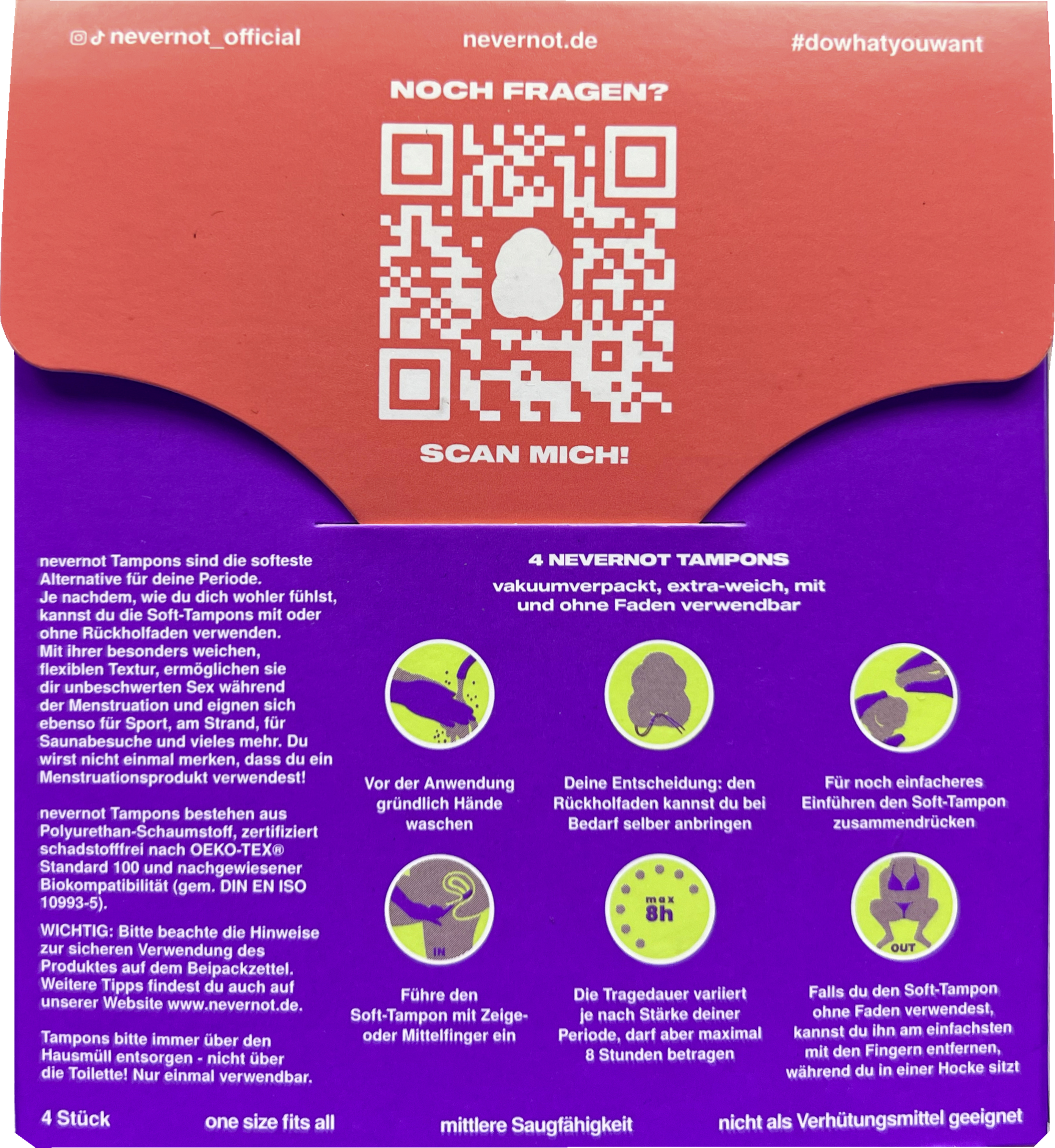 Wichtig: Der nevernot Tampon kann nicht in dir “verschwinden”. Je mehr du dich entspannst, desto einfacher wird die Entfernung.