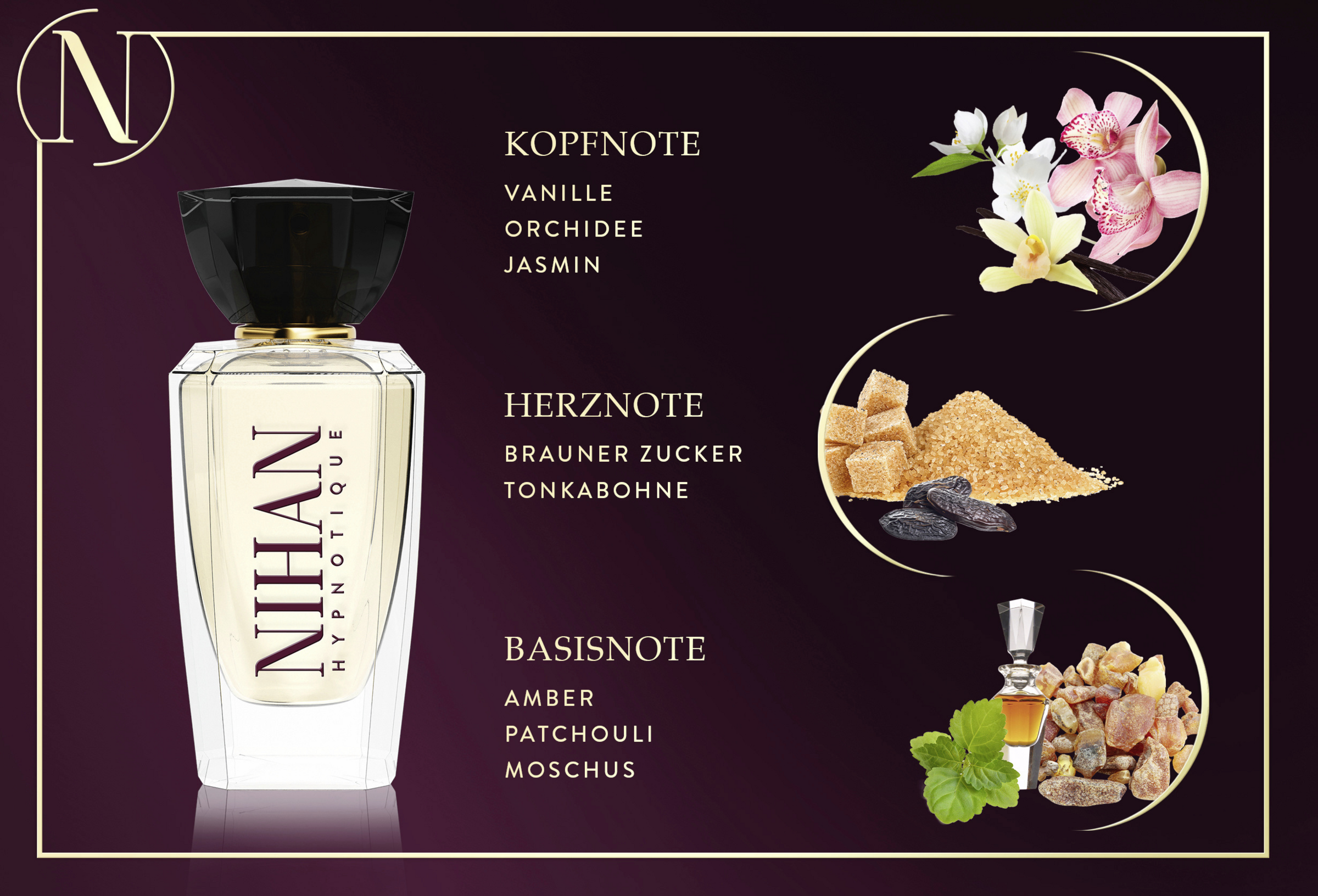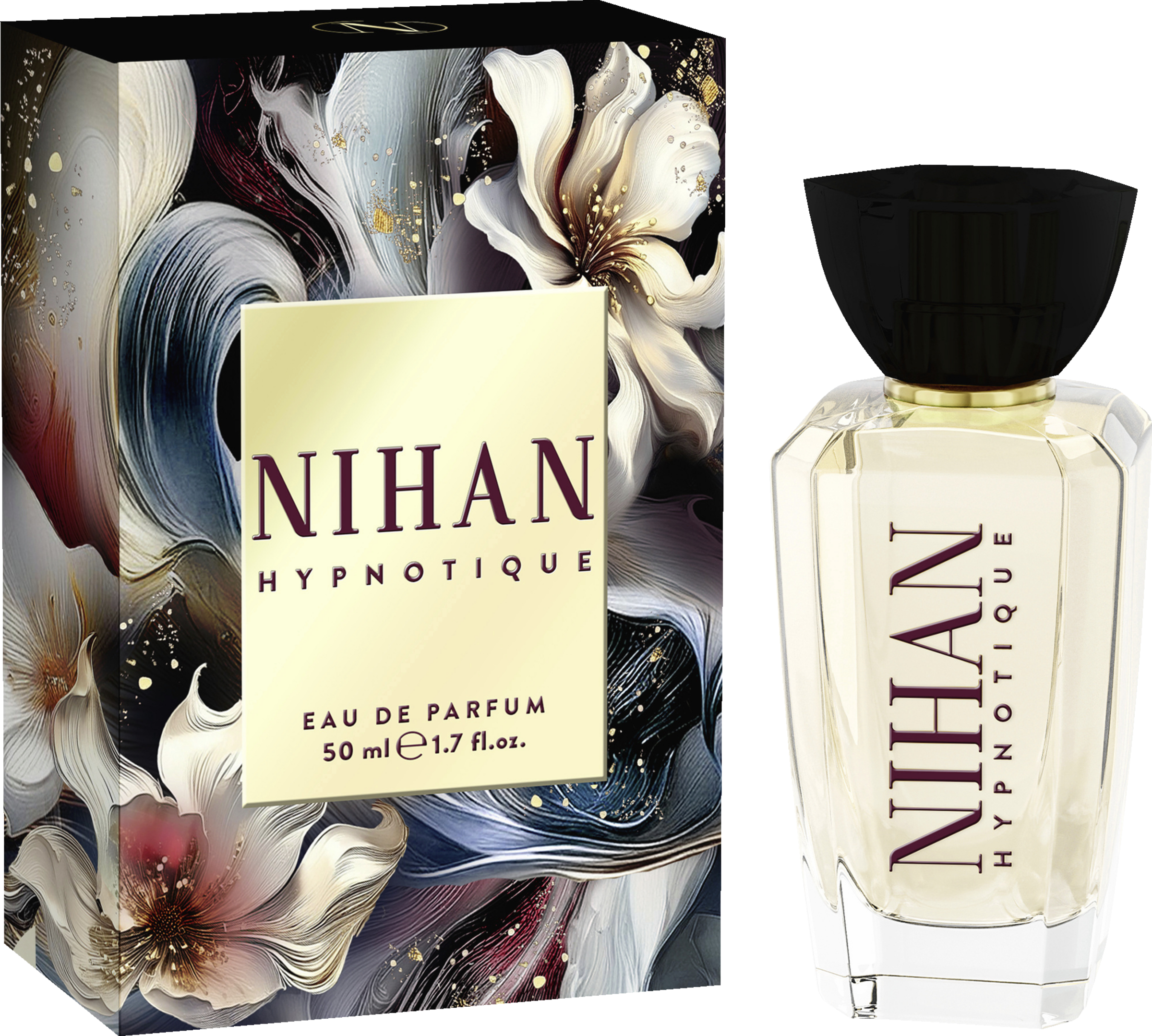 Das Eau de Parfum Nihan Hypnotique vereint die Eleganz floraler Blütenkunst mit goldenen Akzenten und offenbart eine orientalische Duftkomposition aus sanfter Vanille, feinen Blütennoten und der sinnlichen Tiefe dunkler Tonkabohne. Inspiriert von der Ausdruckskraft der Kunst verkörpert dieser Duft zeitlose Schönheit und fängt den Zauber besonderer Augenblicke ein.