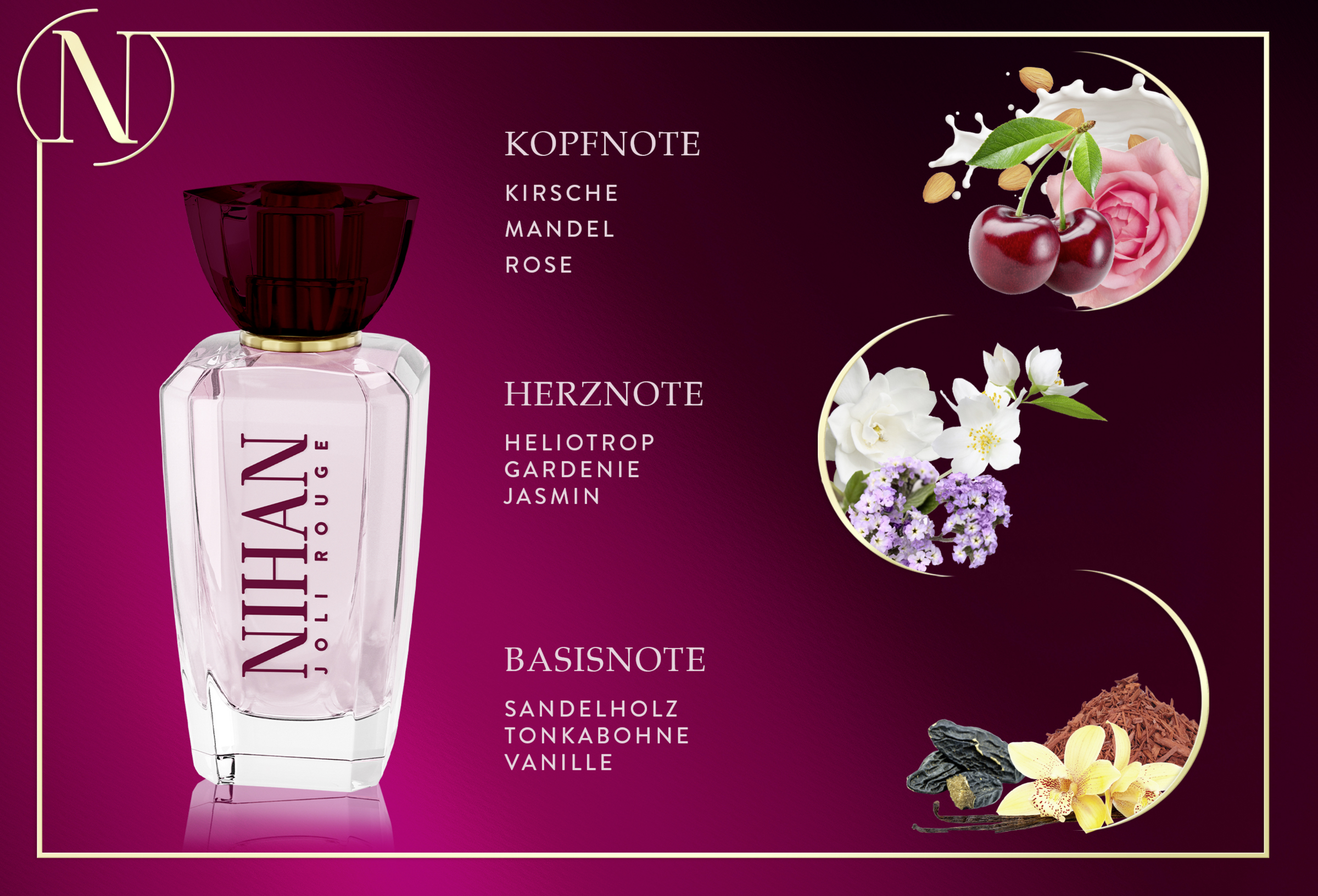 Das exklusive Eau de Parfum Nihan Joli Rouge verkörpert eine faszinierende Symphonie aus Gegensätzen in einem unvergleichlichen Bouquet. Die verlockende Süße schwarzer Kirschen verschmilzt mit der tiefen Sinnlichkeit holziger Noten zu einem betörenden Kontrast, der eine unwiderstehliche Anziehungskraft entfaltet.