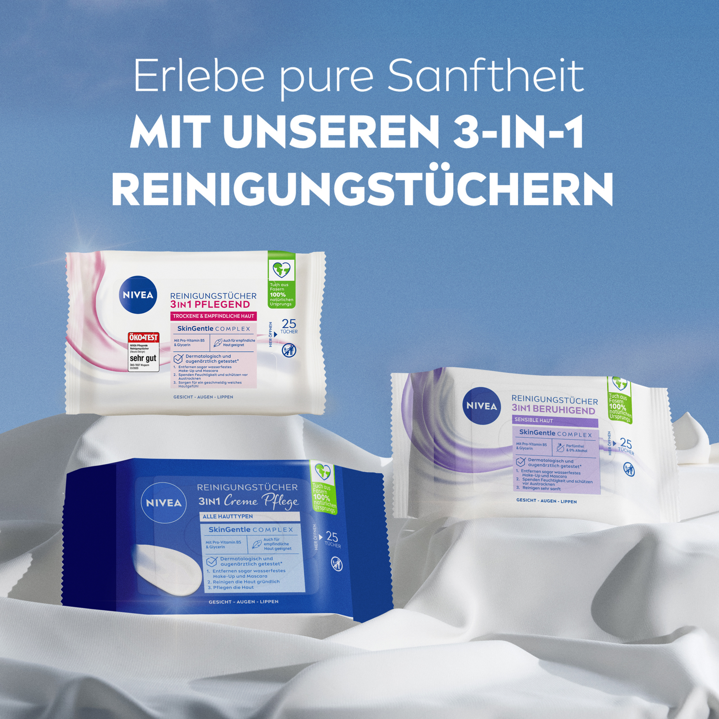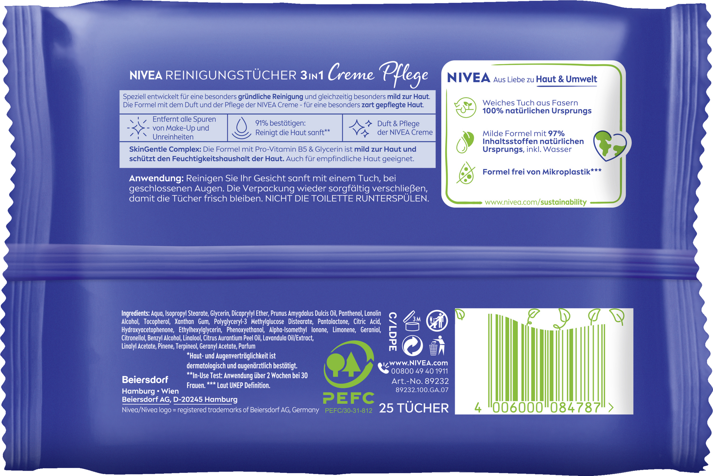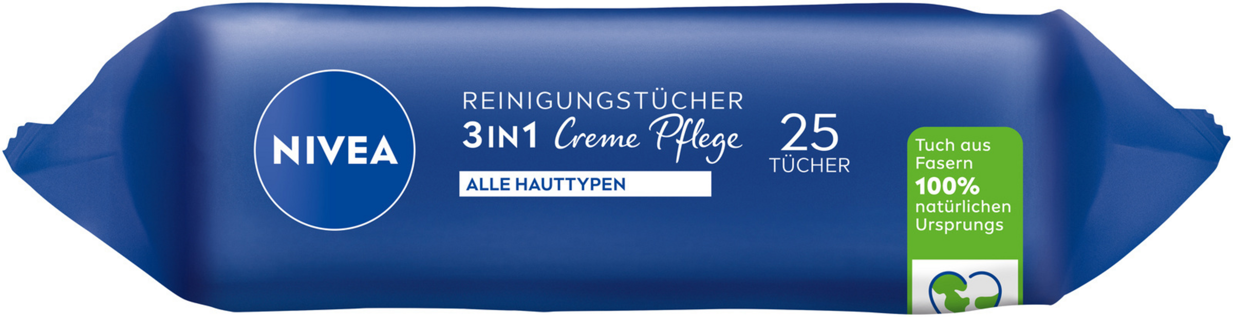 Die NIVEA Reinigungstücher 3in1 Creme Pflege reinigen gründlich, entfernen Make-up und sogar wasserfeste Mascara und schützen die natürliche Feuchtigkeitsbalance der Haut. Die pflegende Formel mit SkinGentle Complex mit Pro-Vitamin B5 und Glycerin sowie dem einzigartigen Duft der NIVEA Creme ist besonders mild und für jeden Hauttyp geeignet – ideal für die tägliche Anwendung. Das Ergebnis: ein zartes, gepflegtes Hautgefühl. Die Verträglichkeit ist dermatologisch und augenärztlich bestätigt. Packung sofort wieder sorgfältig verschließen, um ein Austrocknen der Tücher zu verhindern. Die praktische Verpackung enthält 25 Reinigungstücher für die einfache und schnelle Make-up-Entfernung zu Hause oder unterwegs. Aus Liebe zu Haut & Umwelt sind die weichen Tücher aus Fasern 100% natürlichen Ursprungs, die Formel ist frei von Mikroplastik* und mit 97% Inhaltsstoffen natürlichen Ursprungs (inkl. Wasser).