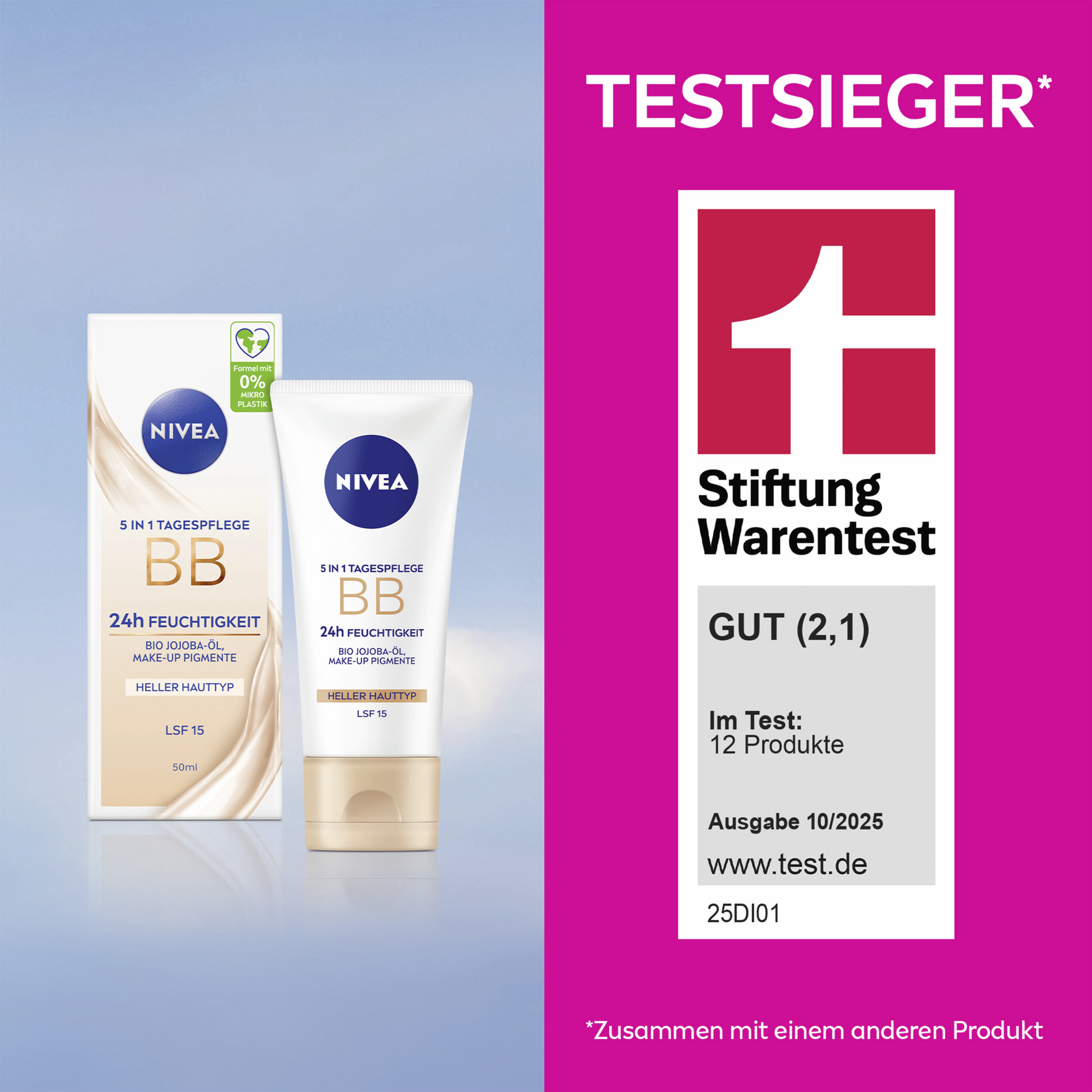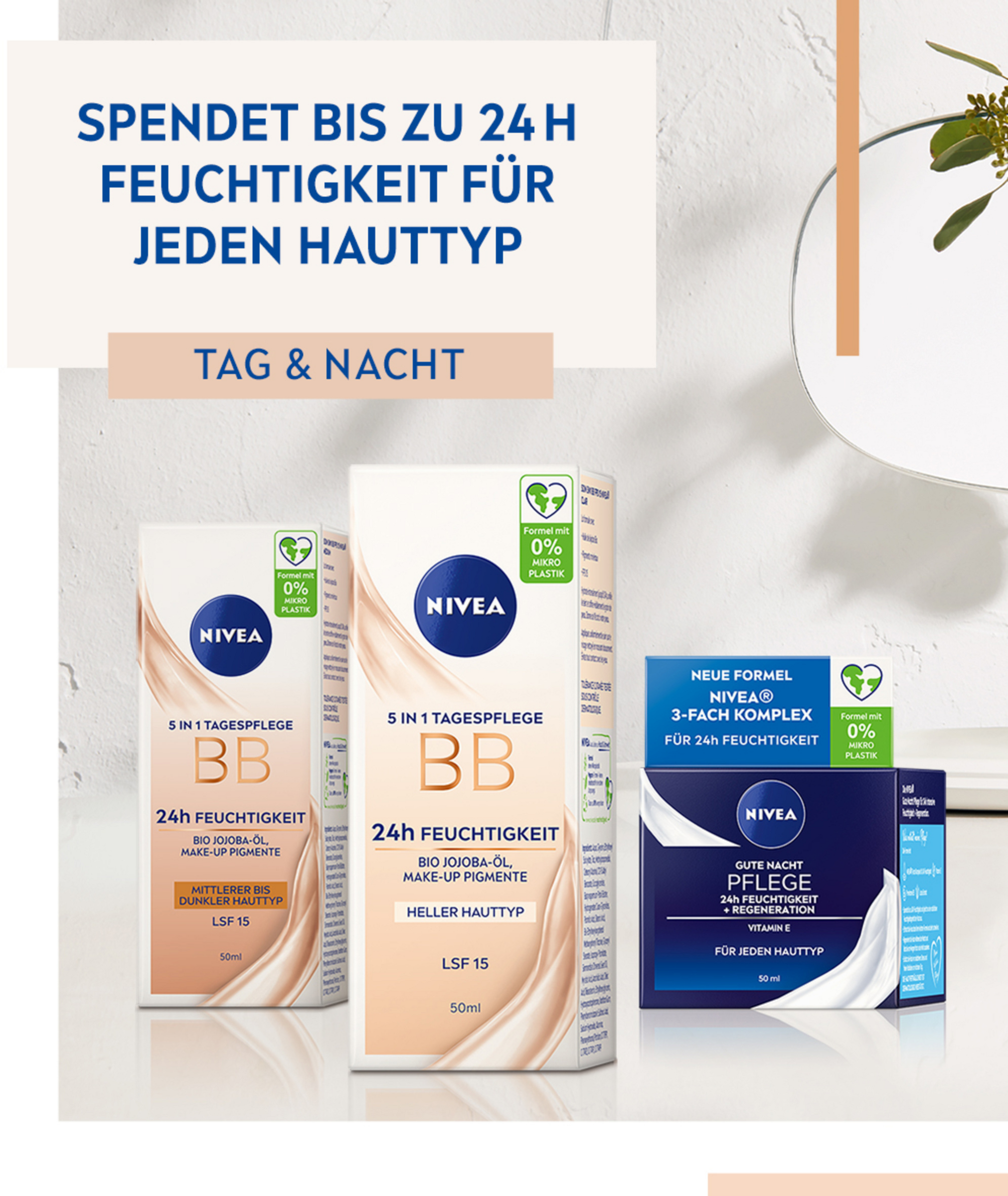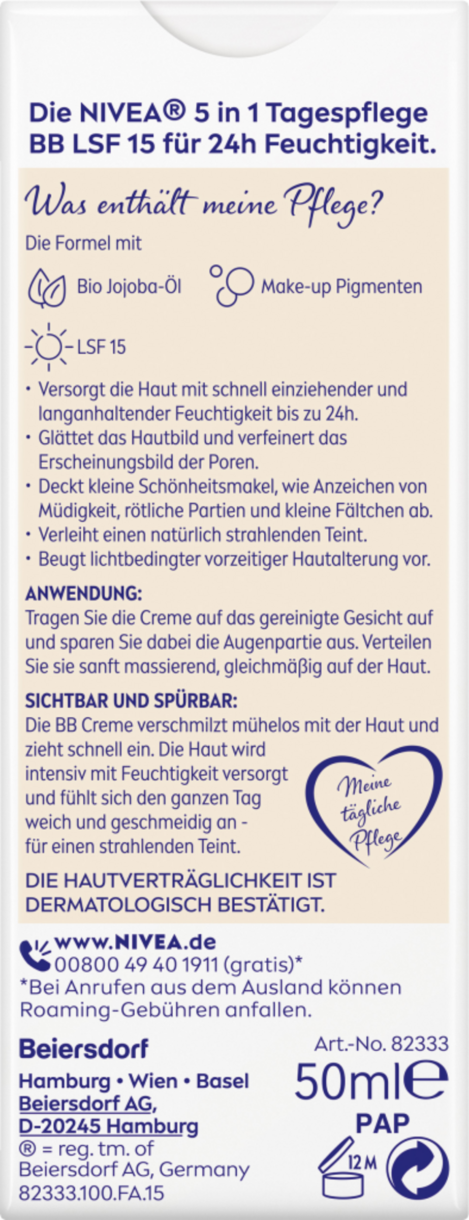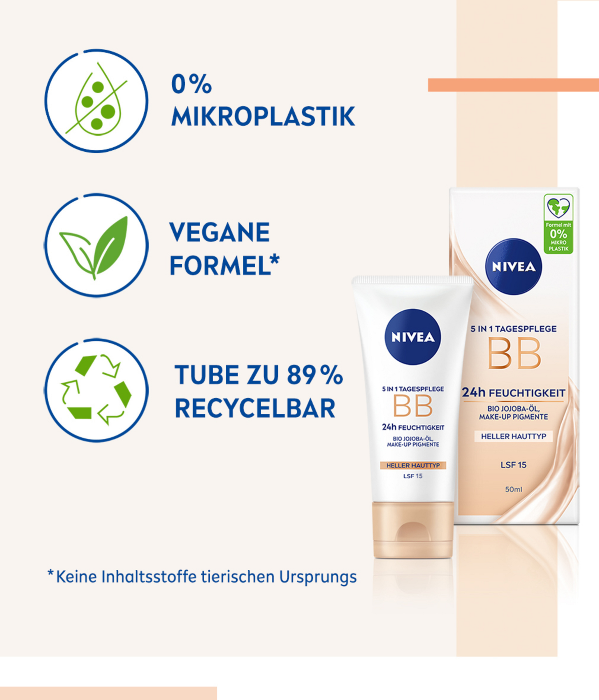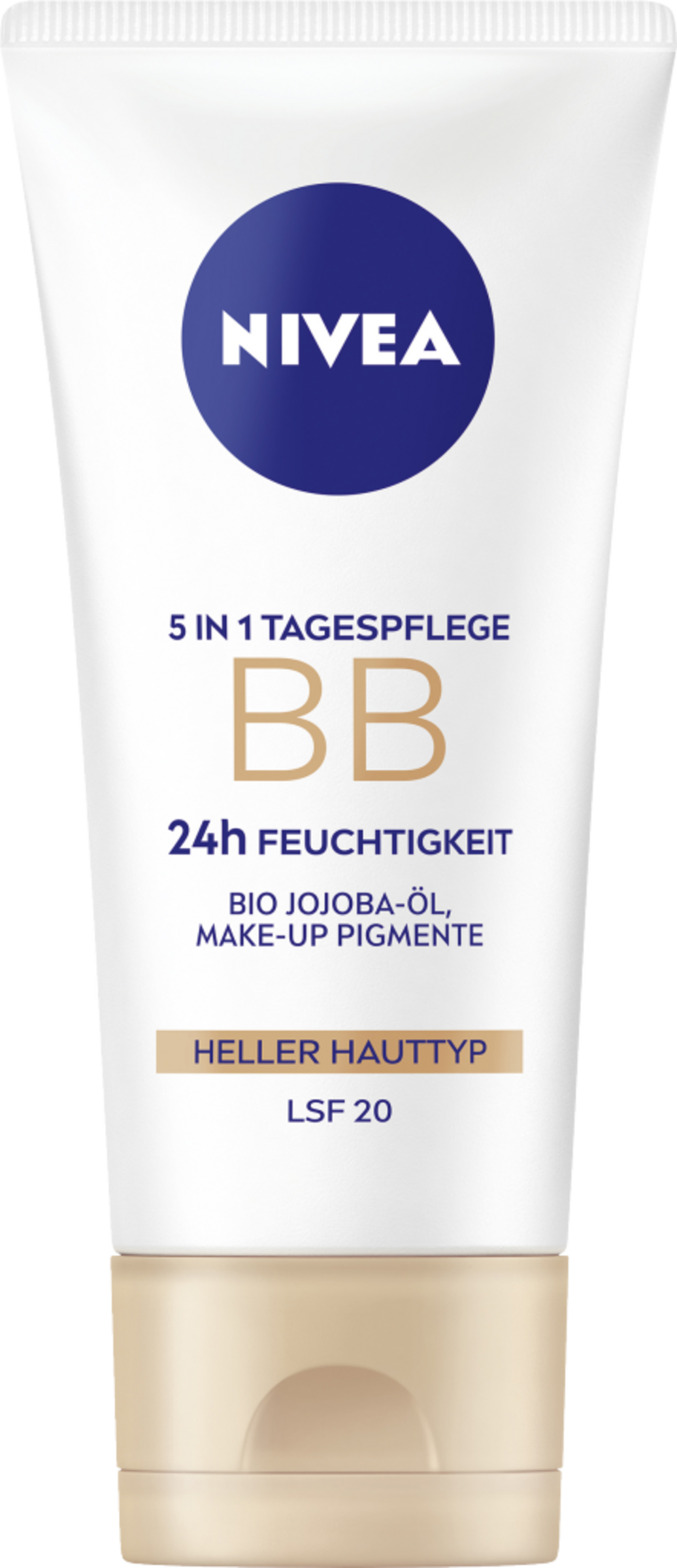 Die NIVEA 5in1 Tagespflege BB 24h Feuchtigkeit mit Bio Jojobaƶl und Make-up Pigmenten versorgt die Haut mit schnell einziehender und langanhaltender Feuchtigkeit bis zu 24h. Die getƶnte Tagespflege für helle Hauttypen deckt kleine Schƶnheitsmakel, wie Anzeichen von Müdigkeit, rƶtliche Partien und kleine FƤltchen ab. Sie glƤttet das Hautbild und verfeinert das Erscheinungsbild der Poren. Die BB Creme verschmilzt mühelos mit der Haut und zieht schnell ein. LSF 15 schützt vor lichtbedingter Hautalterung. Die Haut wird intensiv mit Feuchtigkeit versorgt und fühlt sich den ganzen Tag weich und geschmeidig an ā für einen natürlich strahlenden Teint! Aus Liebe zu Haut & Umwelt ist die Formel vegan* und ohne Mikroplastik. Die HautvertrƤglichkeit ist dermatologisch bestƤtigt. Die Creme gleichmƤĆig auf die gereinigte Haut auftragen.