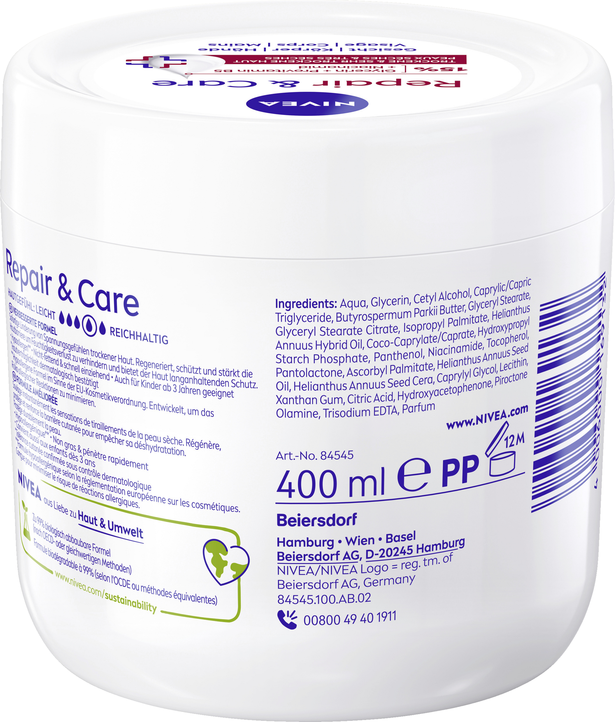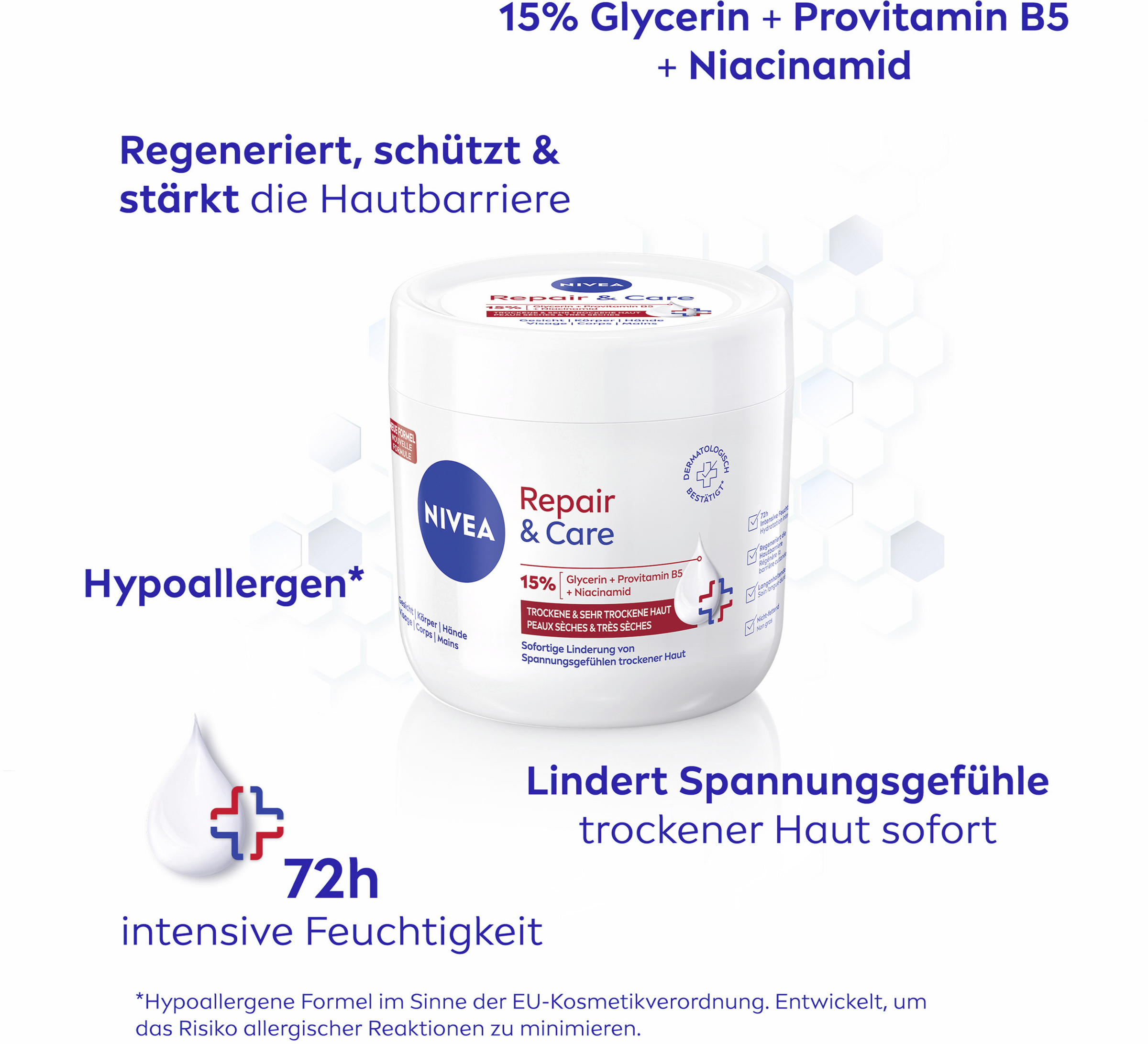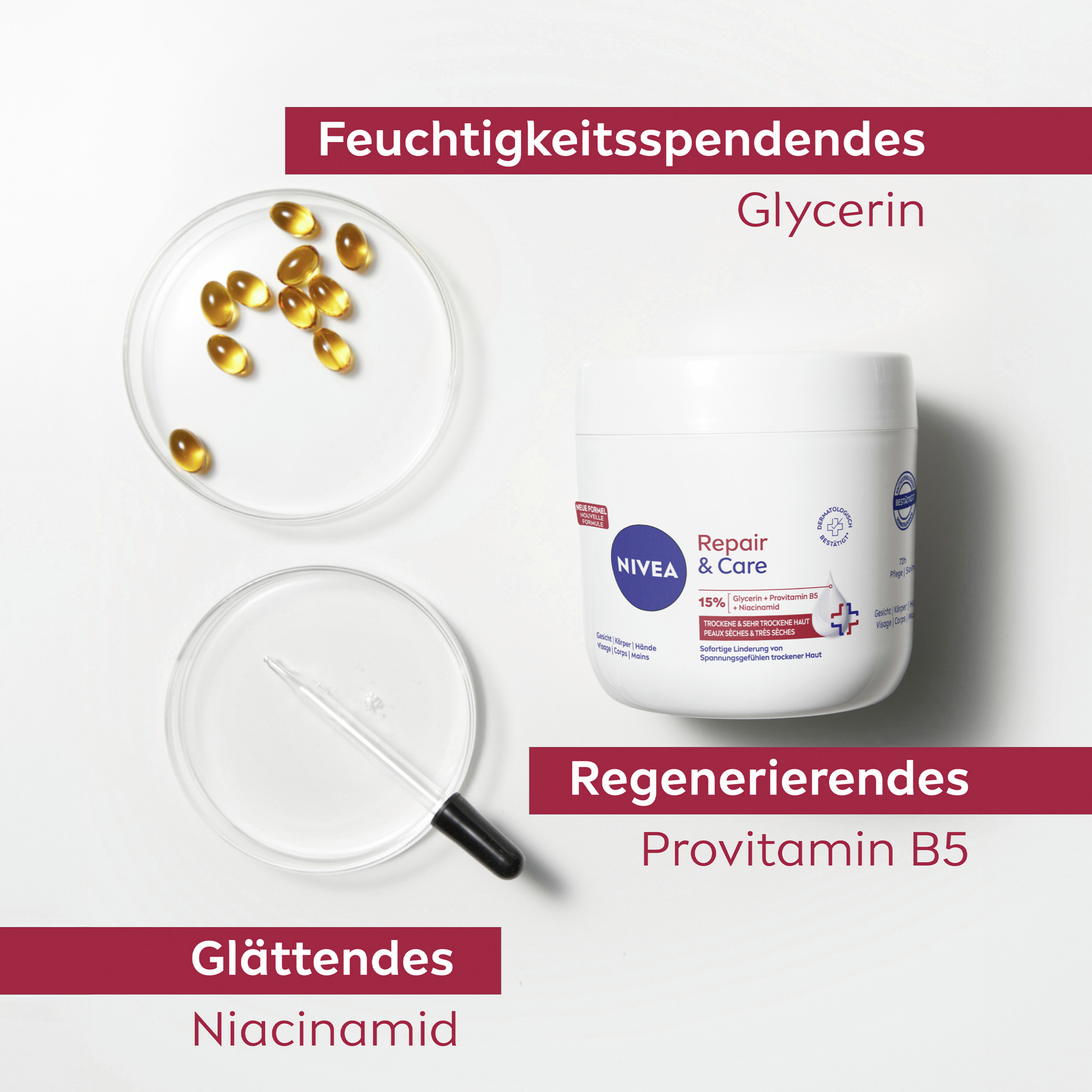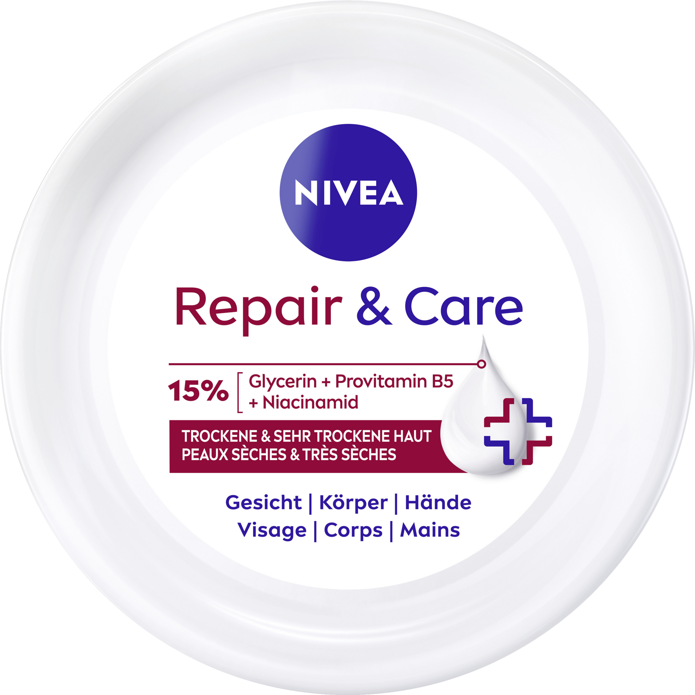 Sofortige Linderung von Spannungsgefühlen trockener Haut mit der NIVEA Repair & Care Creme.