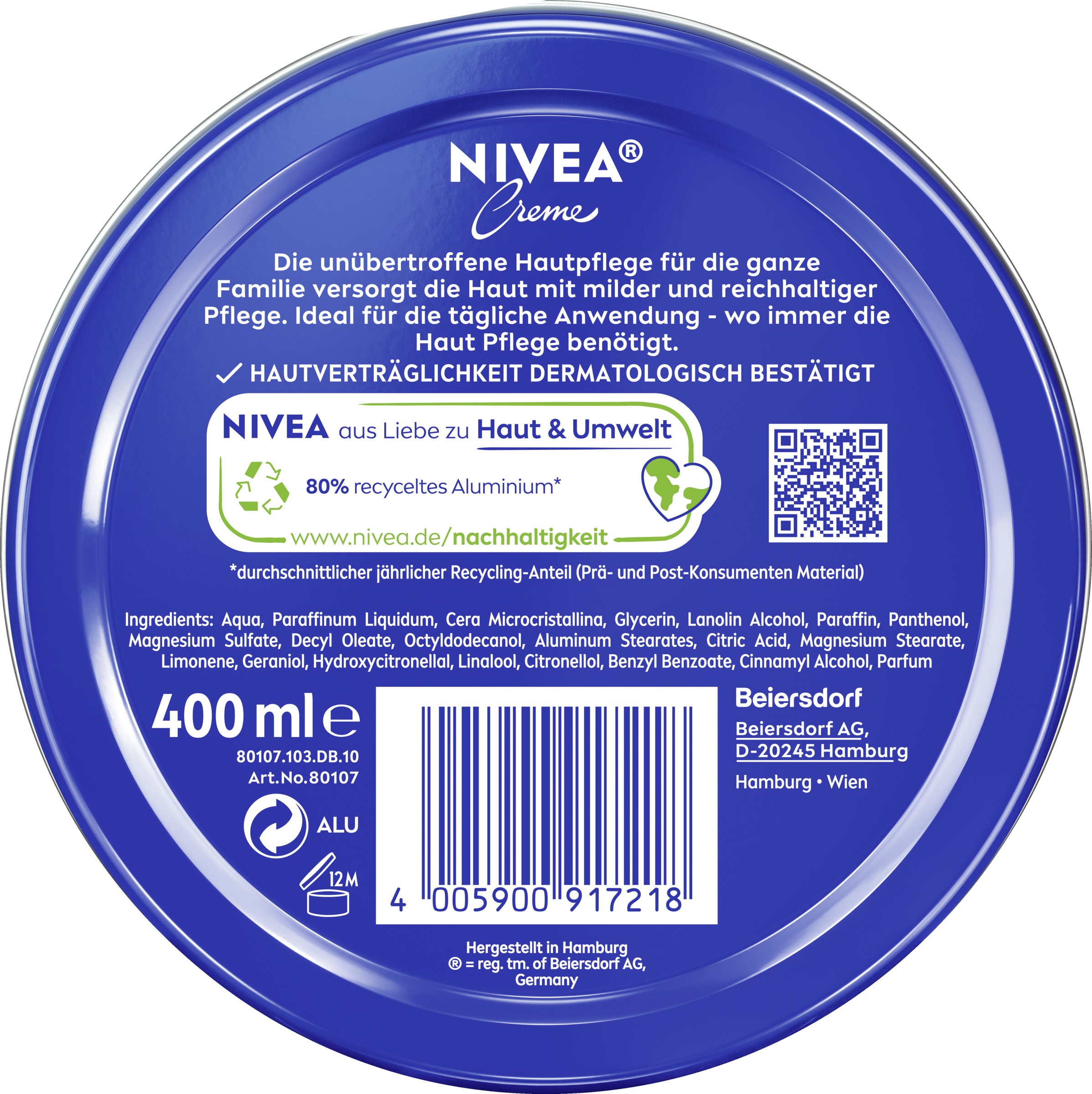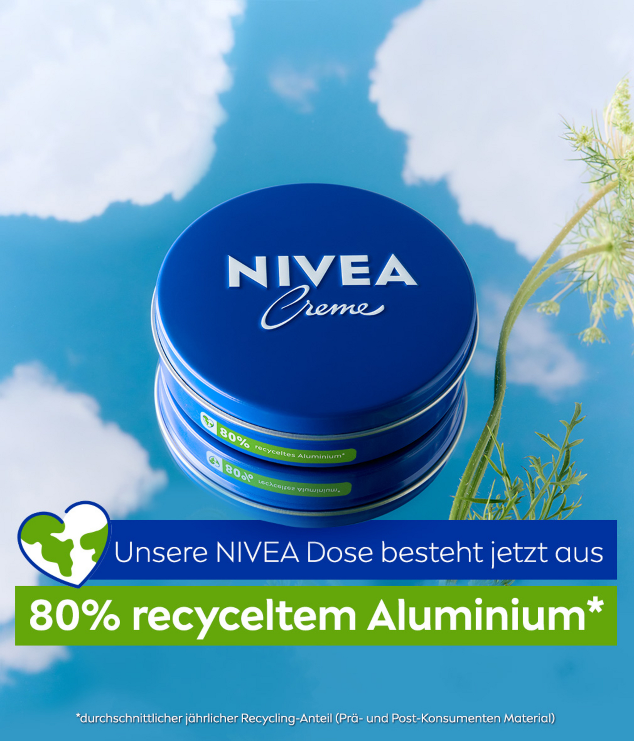 Vertrauen Sie der blauen Dose für die ganze Familie. Seit über 100 Jahren pflegt und schützt die NIVEA Creme mit ihrer reichhaltigen Formel jeden Hauttypen, in jedem Alter und bei jeder Gelegenheit. Für Gesicht, Körper und Hände spendet die Hautcreme, angereichert mit hautverwandtem Eucerit®, 24h lang effektiv Feuchtigkeit. Die cremige Textur mit dem beliebten Duft in der typischen Dose schützt und verwöhnt die Haut. Für die tägliche Anwendung geeignet - wo immer Ihre Haut milde und reichhaltige Pflege braucht. Die Creme stärkt die natürliche Hautbarriere, macht die Haut weich und geschmeidig und sorgt so für einen Effekt, den Sie fühlen und sehen können. Die Hautverträglichkeit ist dermatologisch bestätigt. NIVEA aus Liebe zu Haut & Umwelt: Die Creme Dose besteht nun aus 80% recyceltem Aluminium*.