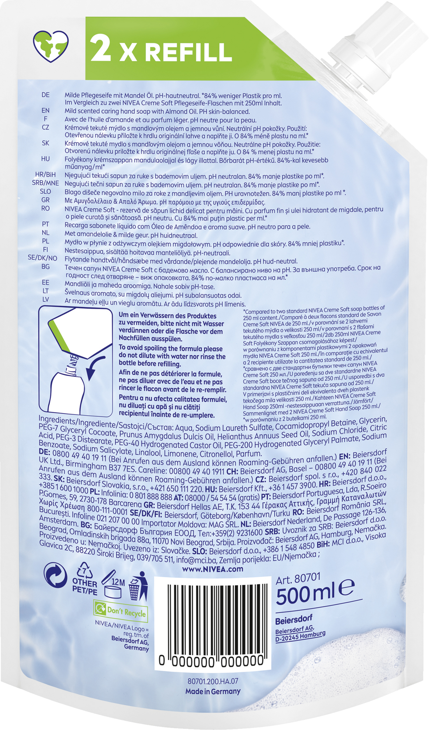 - 84% weniger Plastik pro ml (im Vergleich zu zwei NIVEA Creme Soft Pflegeseifen-Flaschen mit 250ml Inhalt)