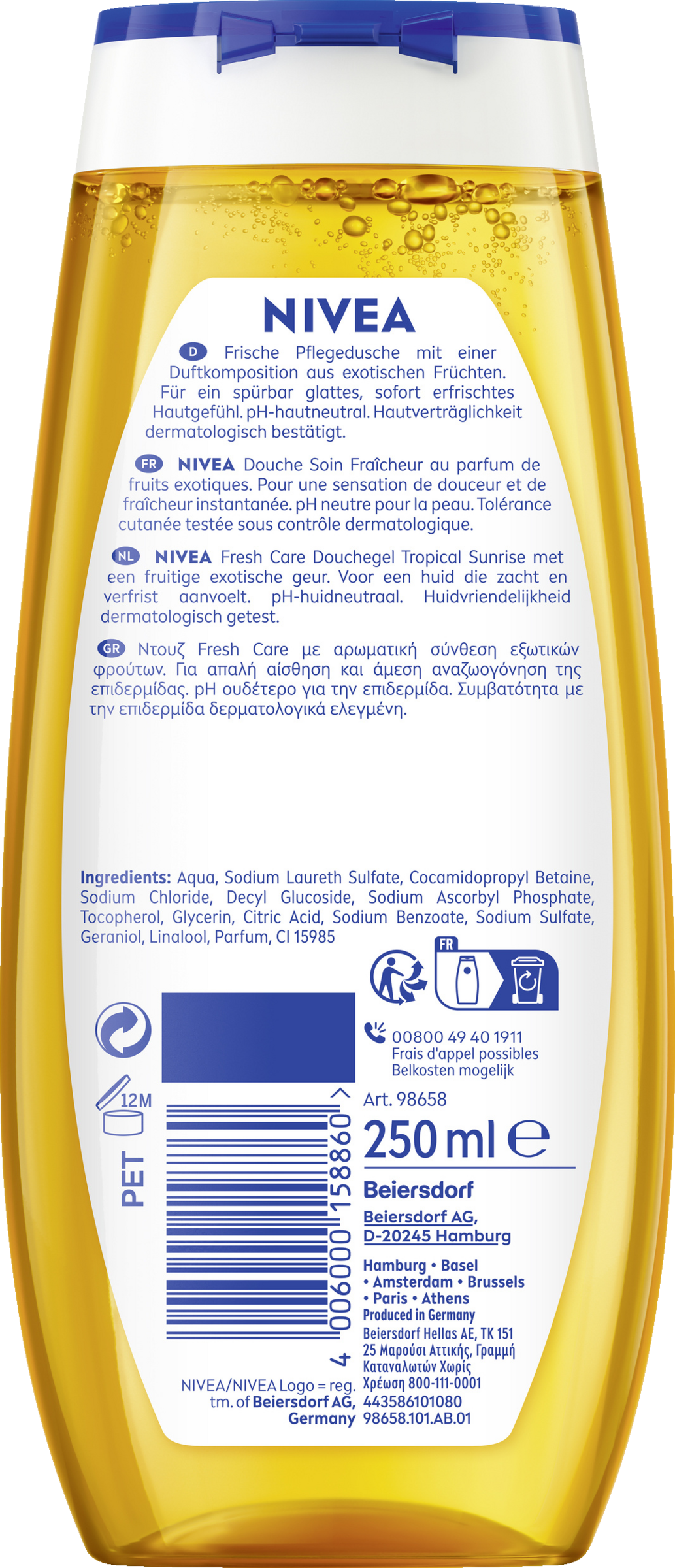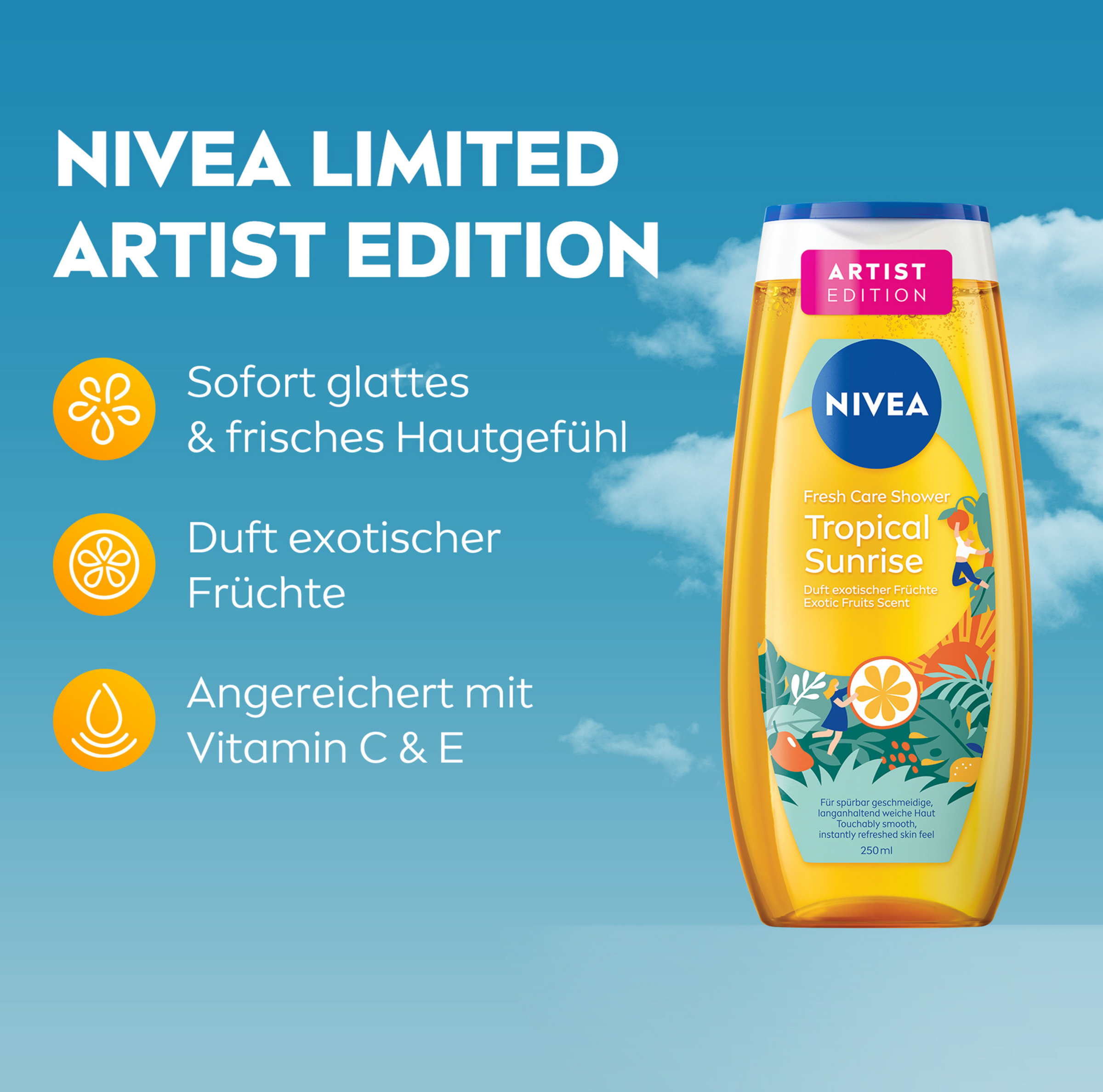 NIVEA Fresh Care Tropical Sunrise Duschgel mit einer Duftkomposition aus exotischen Früchten. Die erfrischende Formel schützt deine Haut vor dem Austrocknen und verleiht ihr ein angenehmes, gesundes Gefühl. Die Formel ist pH-hautneutral und die Hautverträglichkeit ist dermatologisch bestätigt. Dieses Limited Edition Duschgel tut sowohl deiner Haut als auch der Umwelt etwas Gutes: Die Formel enthält kein Mikroplastik und ist zu 99% biologisch abbaubar.