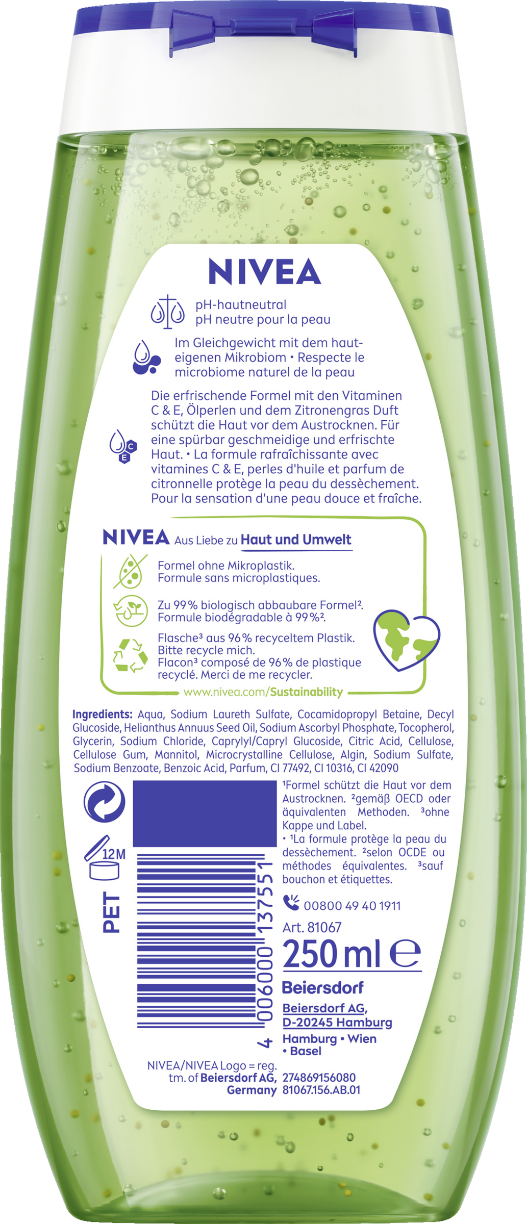 Diese Pflegedusche tut nicht nur deiner Haut, sondern auch der Umwelt etwas Gutes: Die Flasche besteht zu 96% aus Recycling-Material, abgesehen von der Verschlusskappe und dem Label. Außerdem enthält die Formel kein Mikroplastik und ist zu 99% biologisch abbaubar (gemäß OECD oder äquivalenten Methoden). Verwandle jedes Duscherlebnis in einen verwöhnenden Pflegemoment mit NIVEA: Lemongrass & Oil Duschgel.