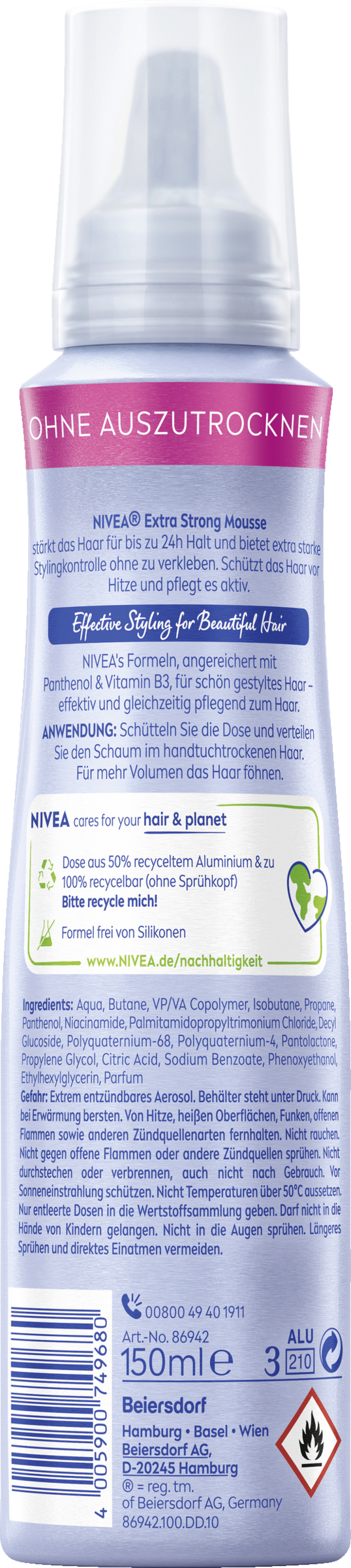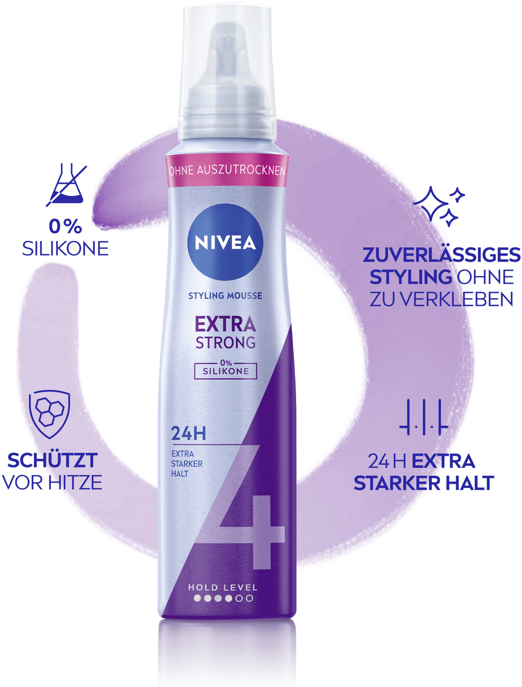 Das NIVEA Extra Strong Styling Mousse bietet extra starken Halt für bis zu 24 Stunden und stärkt das Haar. Mit seiner leistungsstarken Formulierung sorgt der Haar Schaum für langanhaltende, definierte Styles. Die silikonfreie Formel mit Hitzeschutz, Panthenol & Vitamin B3 stärkt und schützt das Haar vor äußeren Schäden und Stressfaktoren, wie der Hitzebelastung beim Styling. Der NIVEA Schaumfestiger ist aktiv pflegend, trocknet nicht aus und hinterlässt trotz sehr starkem Halt ein nicht klebendes, angenehmes Haargefühl.