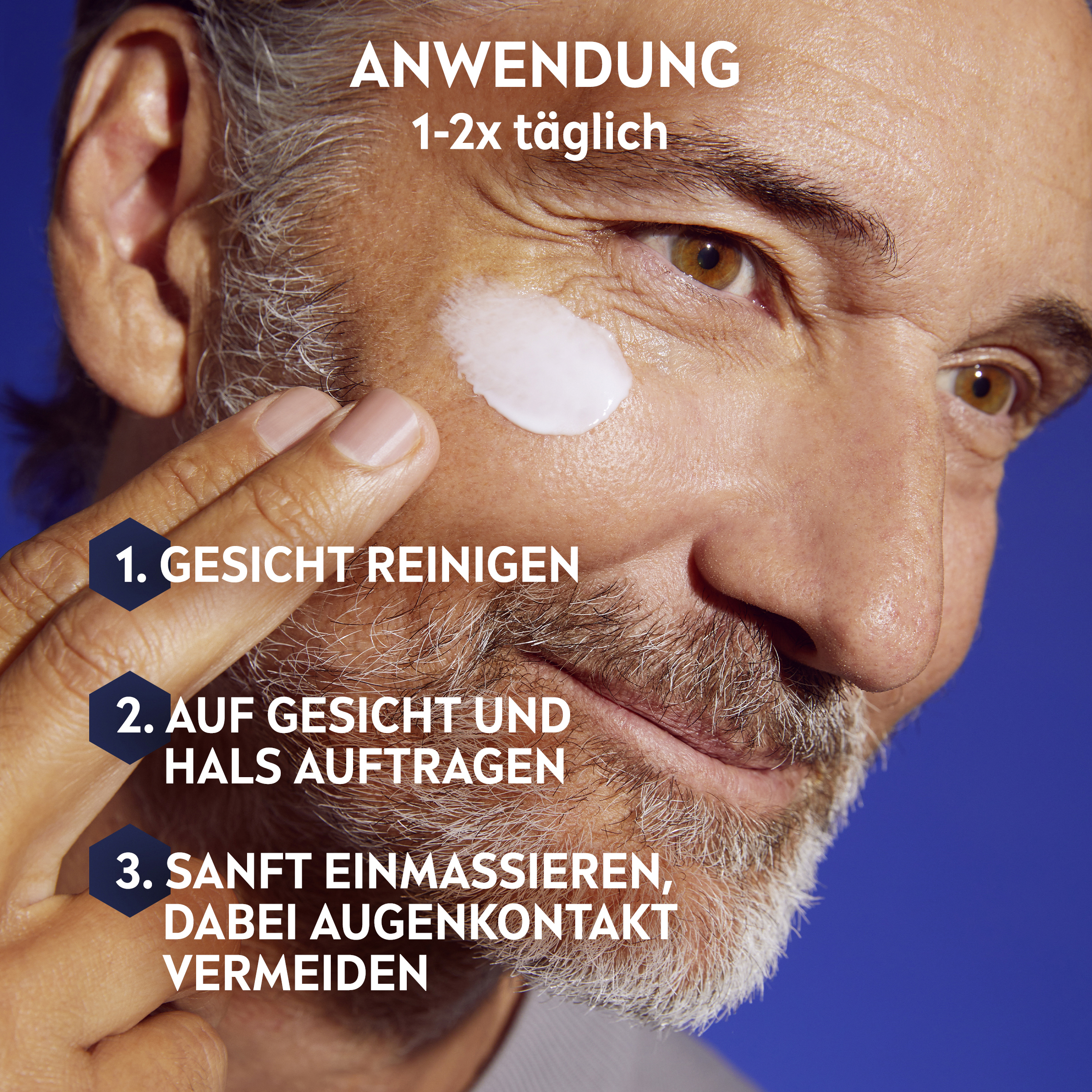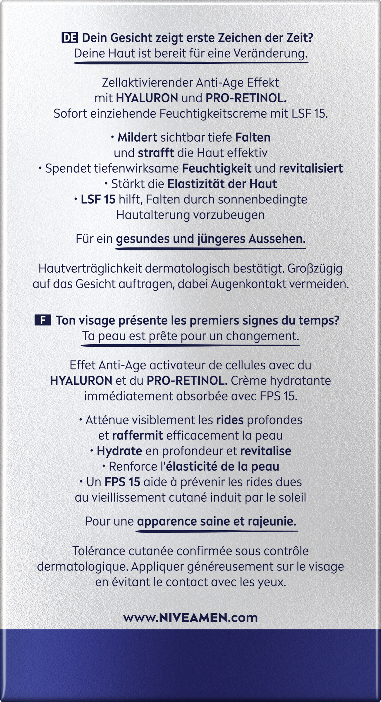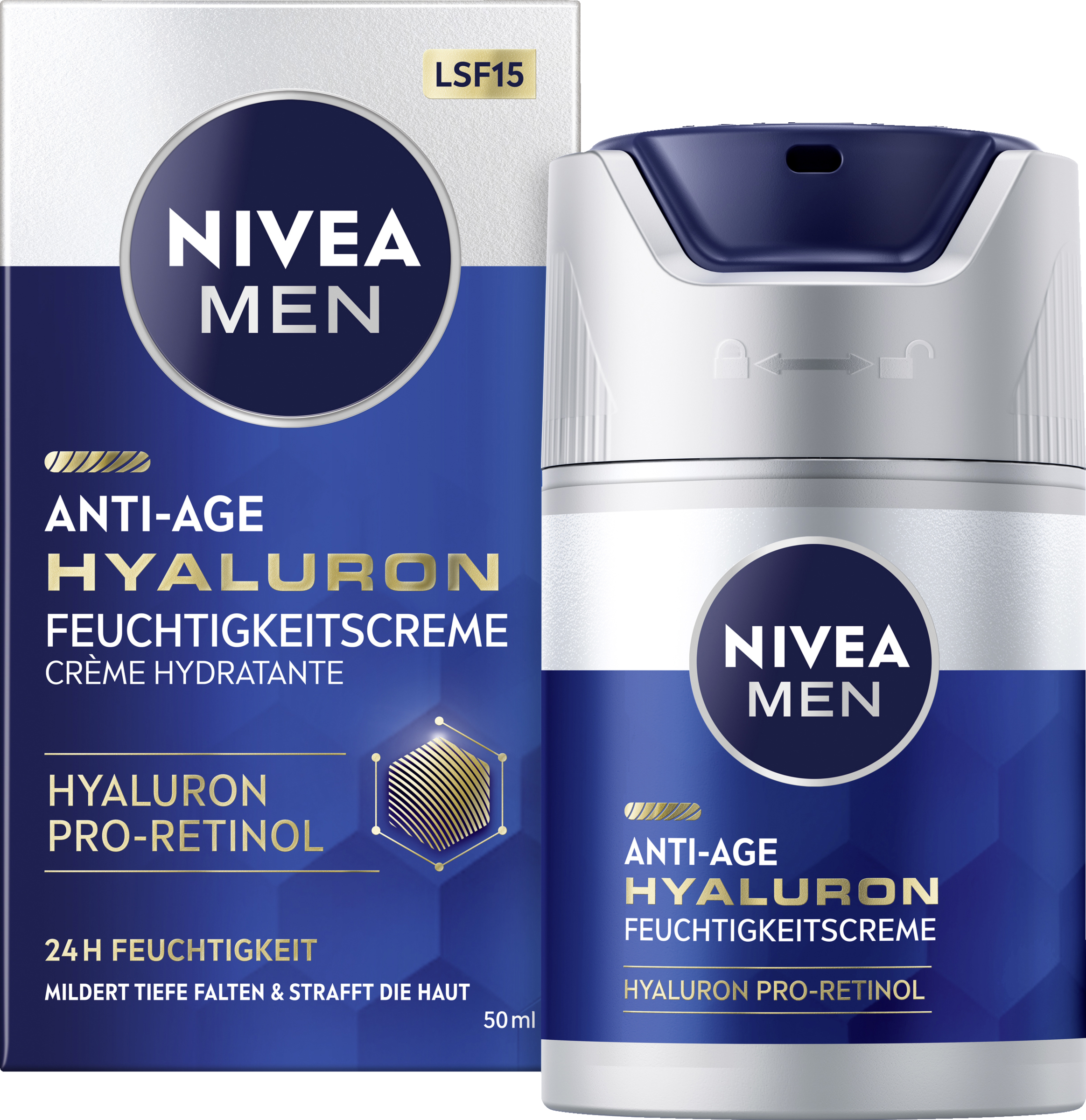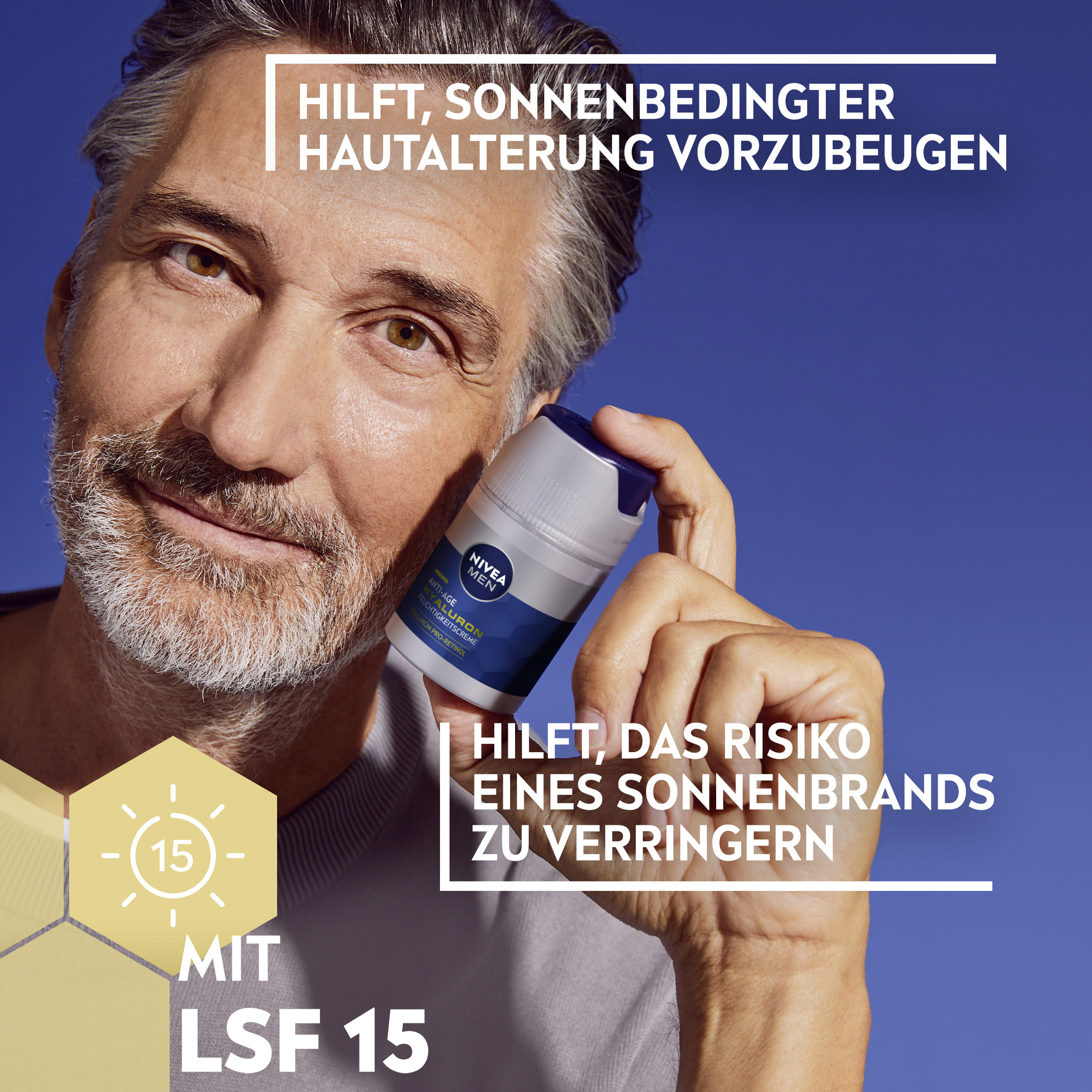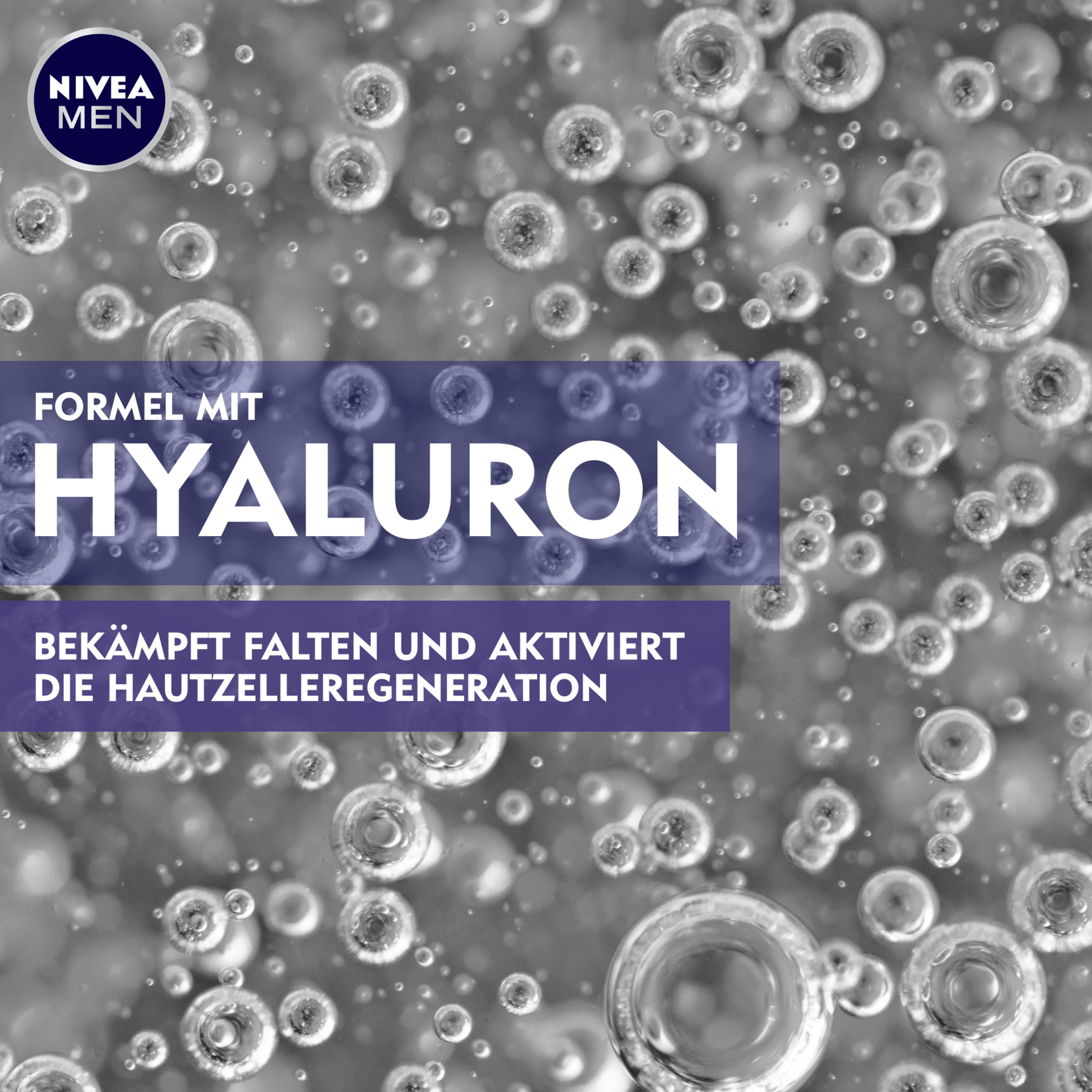 Dein Gesicht zeigt erste Zeichen der Zeit? Deine Haut ist bereit für eine Veränderung mit der NIVEA MEN Anti-Age Hyaluron Feuchtigkeitscreme. Die Formel mit Hyaluron mildert selbst tiefe Falten sichtbar und strafft die Haut dank des zellaktivierenden Anti-Age Effekts. Die revitalisierende Creme zieht sofort ein und versorgt die Haut mit tiefenwirksamer Feuchtigkeit. Dank LSF 15 hilft die Feuchtigkeitscreme außerdem, Falten durch sonnenbedingte Hautalterung vorzubeugen. Für ein gesundes und jüngeres Aussehen: NIVEA MEN Anti-Age Hyaluron Feuchtigkeitscreme.