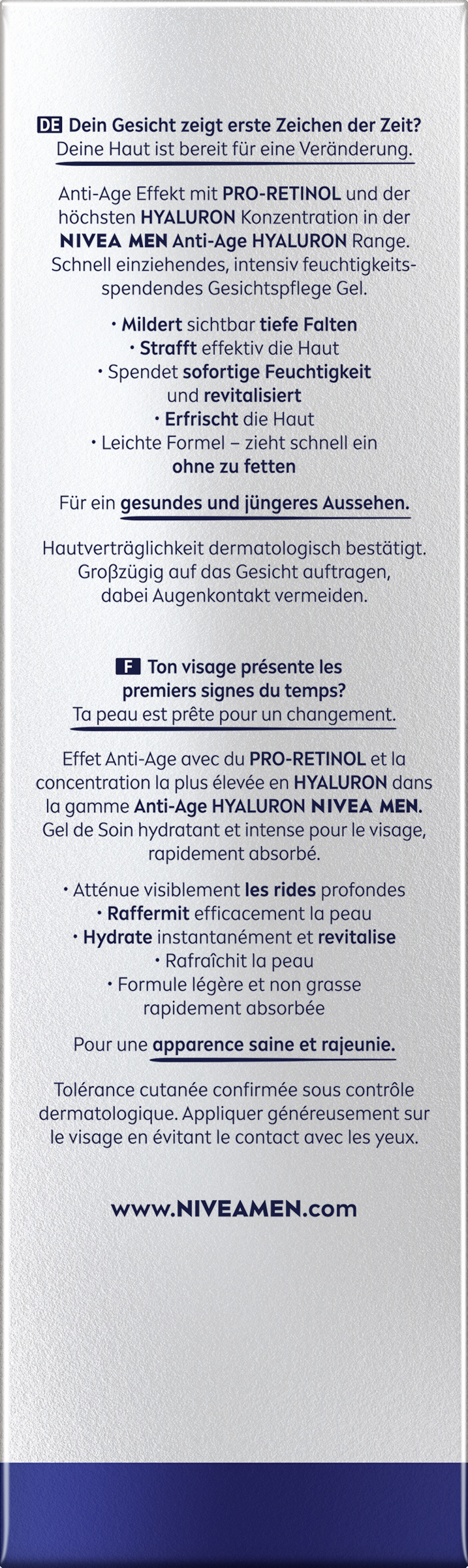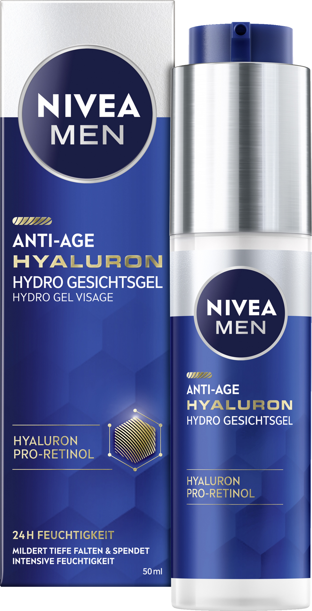 Dein Gesicht zeigt erste Zeichen der Zeit? Deine Haut ist bereit für eine Veränderung mit dem NIVEA MEN Anti-Age Hyaluron Hydro Gesichtsgel. Das erfrischende Gel besitzt die höchste Konzentration an Hyaluron in der gesamten NIVEA MEN Anti-Age Produktreihe und mildert selbst tiefe Falten. Die Haut wird gestrafft und intensiv mit 24h Feuchtigkeit versorgt. Außerdem zieht das revitalisierende Gesichtsgel schnell ein und fettet nicht. Für ein gesundes und jüngeres Aussehen: NIVEA MEN Anti-Age Hyaluron Hydro Gesichtsgel.