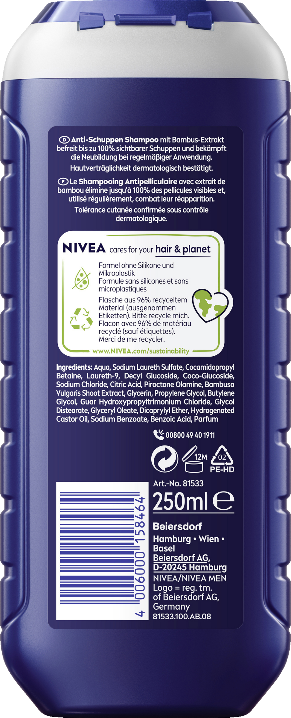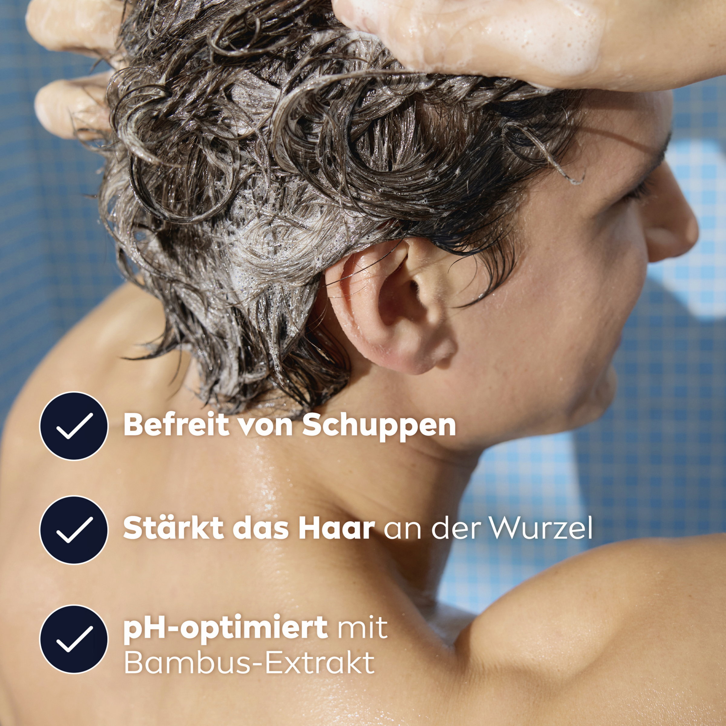 Bekämpfe mit dem NIVEA MEN Anti Schuppen Shampoo für Männer effektiv Schuppen. Dieses Männer Shampoo mit Bambus-Extrakt bekämpft bei regelmäßiger Anwendung die Neubildung & befreit bis zu 100% von sichtbaren Schuppen. Mit seinem optimierten pH-Wert bekämpft das NIVEA Anti Schuppen Shampoo für Männer die Ursache der Schuppenbildung & ist darüber hinaus auch ideal gegen plattes Haar: es stärkt das Haar an der Wurzel und bringt die Kopfhaut wieder ins gesunde Gleichgewicht.