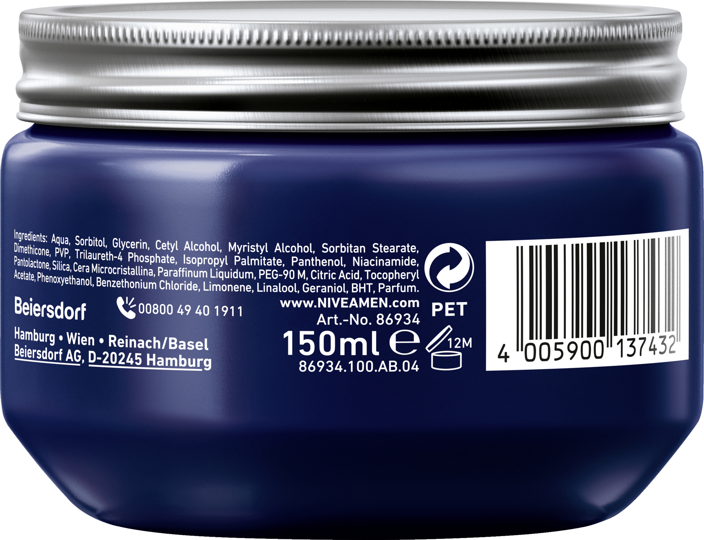 Aqua, Sorbitol, Glycerin, Cetyl Alcohol, Myristyl Alcohol, Sorbitan Stearate, Dimethicone, PVP, Trilaureth-4 Phosphate, Isopropyl Palmitate, Panthenol, Niacinamide, Pantolactone, Silica, Cera Microcristallina, Paraffinum Liquidum, PEG-90 M, Citric Acid, Tocopheryl Acetate, Phenoxyethanol, Benzethonium Chloride, Limonene, Linalool, Geraniol, BHT, Parfum