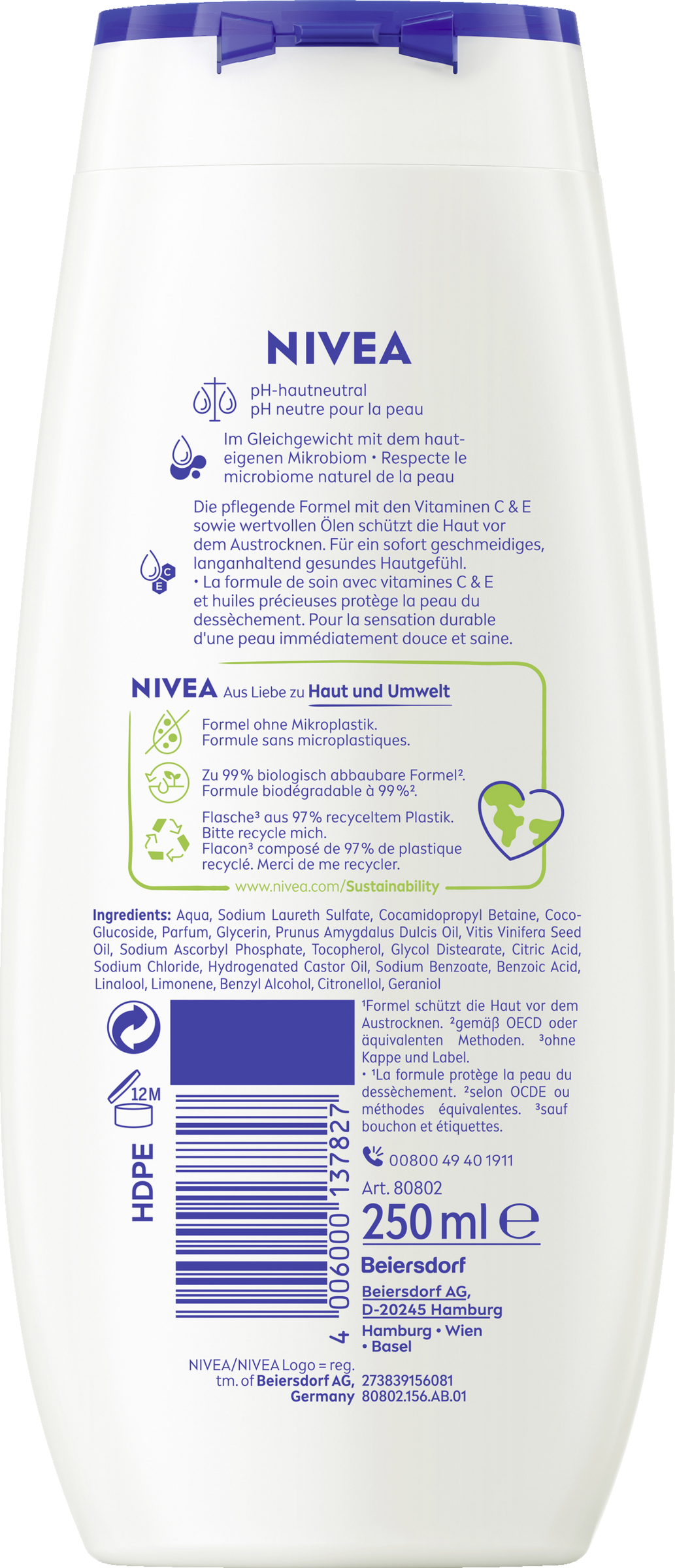 Dieses Duschgel tut sowohl deiner Haut als auch der Umwelt etwas Gutes: Die Formel ist zu 99% biologisch abbaubar (gemäß OECD oder äquivalenten Methoden) und enthält kein Mikroplastik. Die Flasche besteht zu 97% aus Recycling-Material, ohne Verschluss und Label. Verwandle jedes Duscherlebnis in einen verwöhnenden Pflegemoment mit NIVEA – für ein geschmeidiges Hautgefühl: Creme Soft Pflegedusche.
