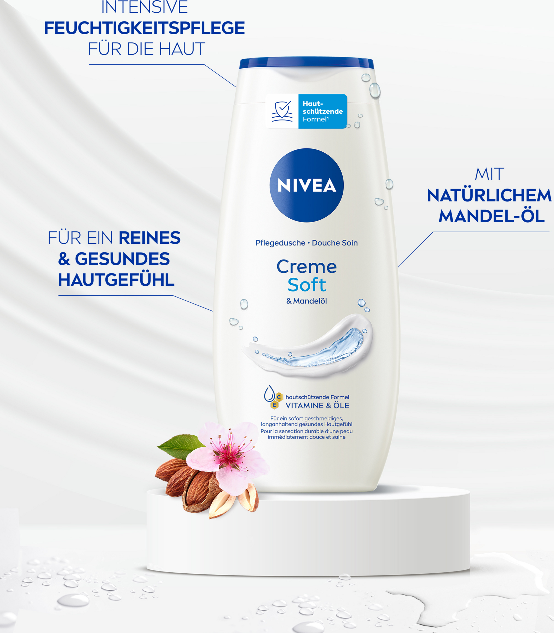 Entdecke ein geschmeidiges Hautgefühl mit der NIVEA Creme Soft Pflegedusche. Spüre, wie das seidige Duschgel dank seiner Formel mit natürlichem Mandel-Öl, Ölen und Vitaminen C & E deine Haut sanft unter der Dusche pflegt. Genieße samtweichen, cremigen Schaum und den zarten Duft.