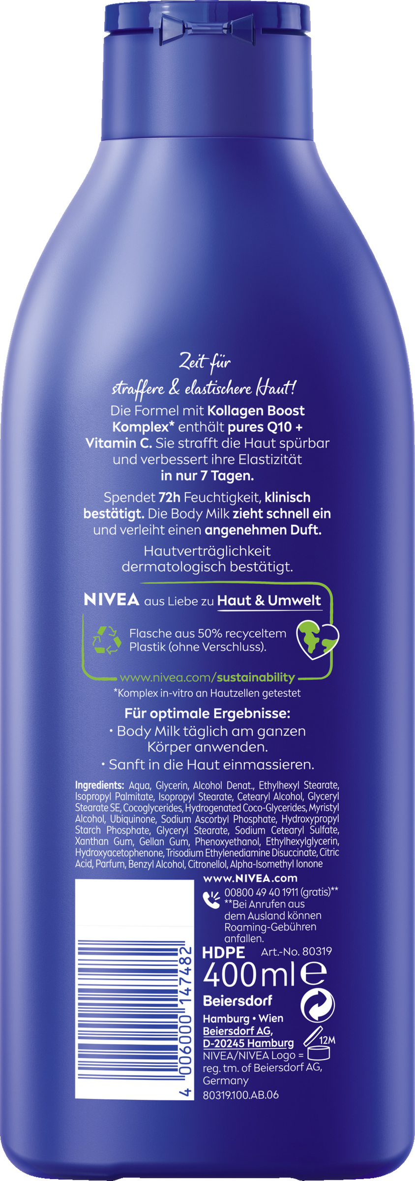 .Die NIVEA Q10 Straffende Body Milk 400ml ist angereichert mit dem Kollagen Boost Komplex*, der pures Q10 und Vitamin C enthält. Die Formel strafft spürbar und verbessert die Elastizität der Haut in 7 Tagen. Klinisch nachgewiesen versorgt die pflegende Body Milk Ihre Haut 72h lang mit Feuchtigkeit. Hautverträglichkeit dermatologisch bestätigt.